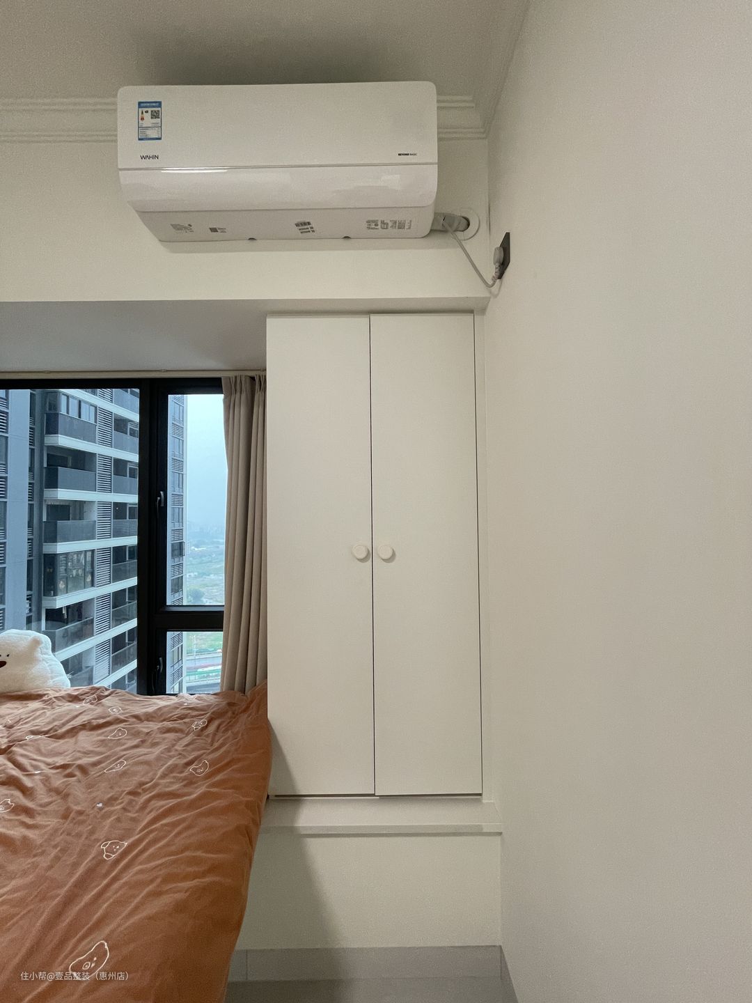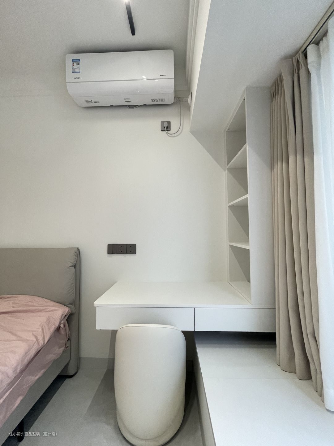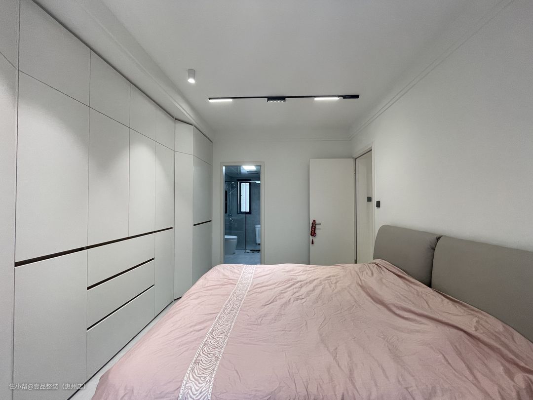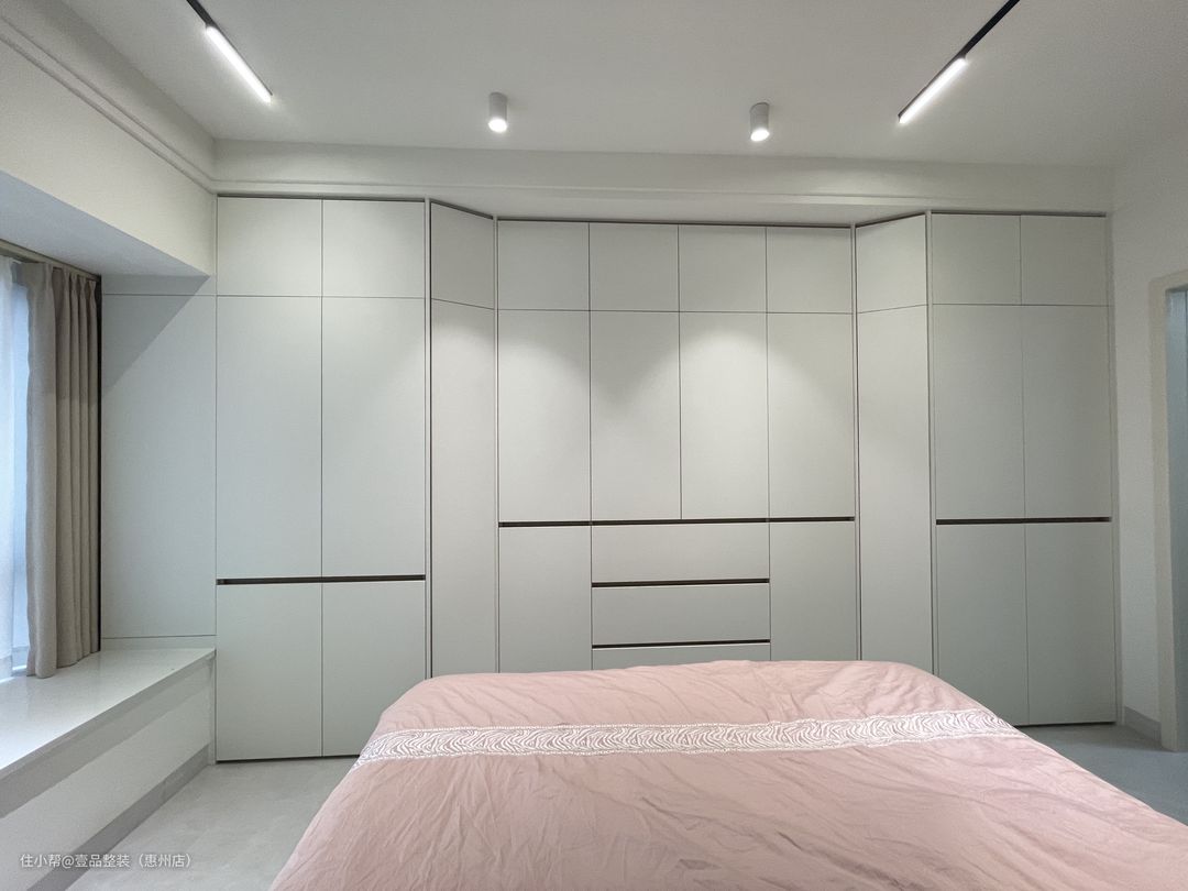 为了充分利用空间,次卧定制高脚床设计,连接飘窗台,将飘窗60cm宽的空间都利用起来。床尾定制到顶柜,增加储物。门边的到顶柜连接到床头做转角书桌一体柜,留空设计方便后期的使用空间。