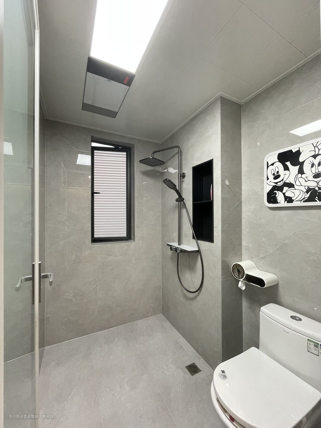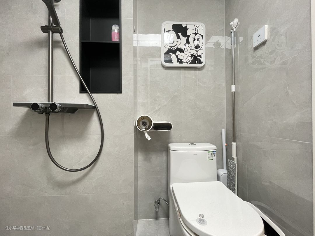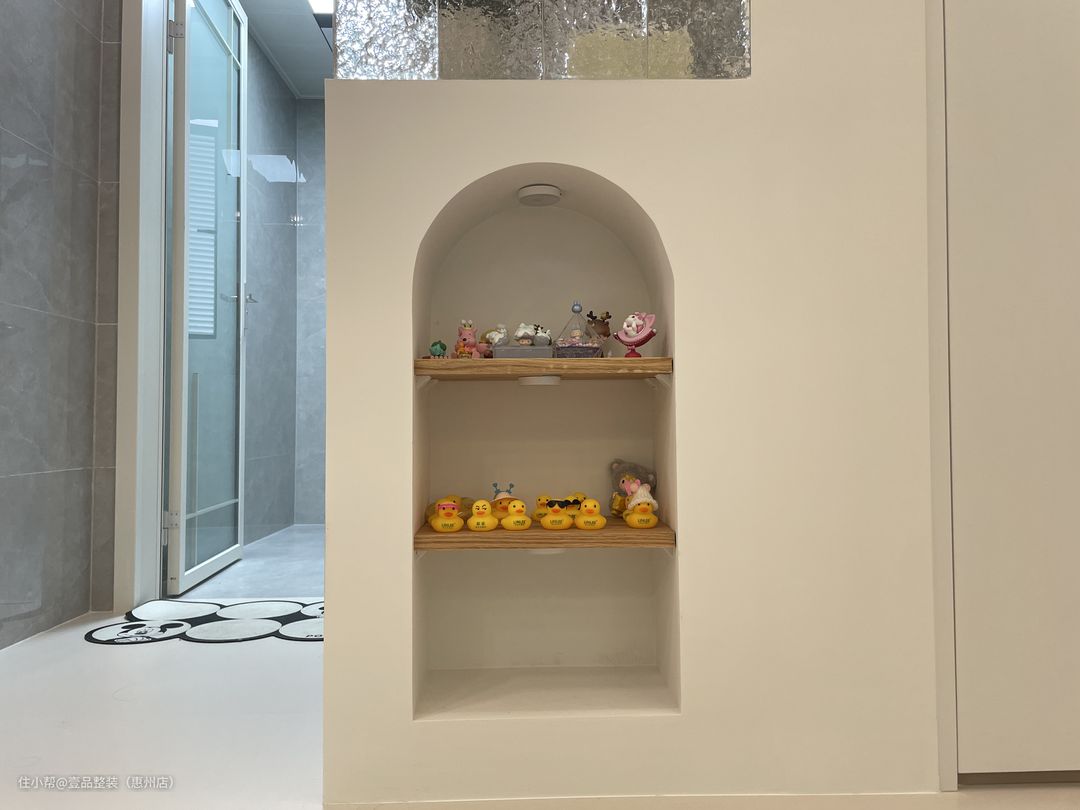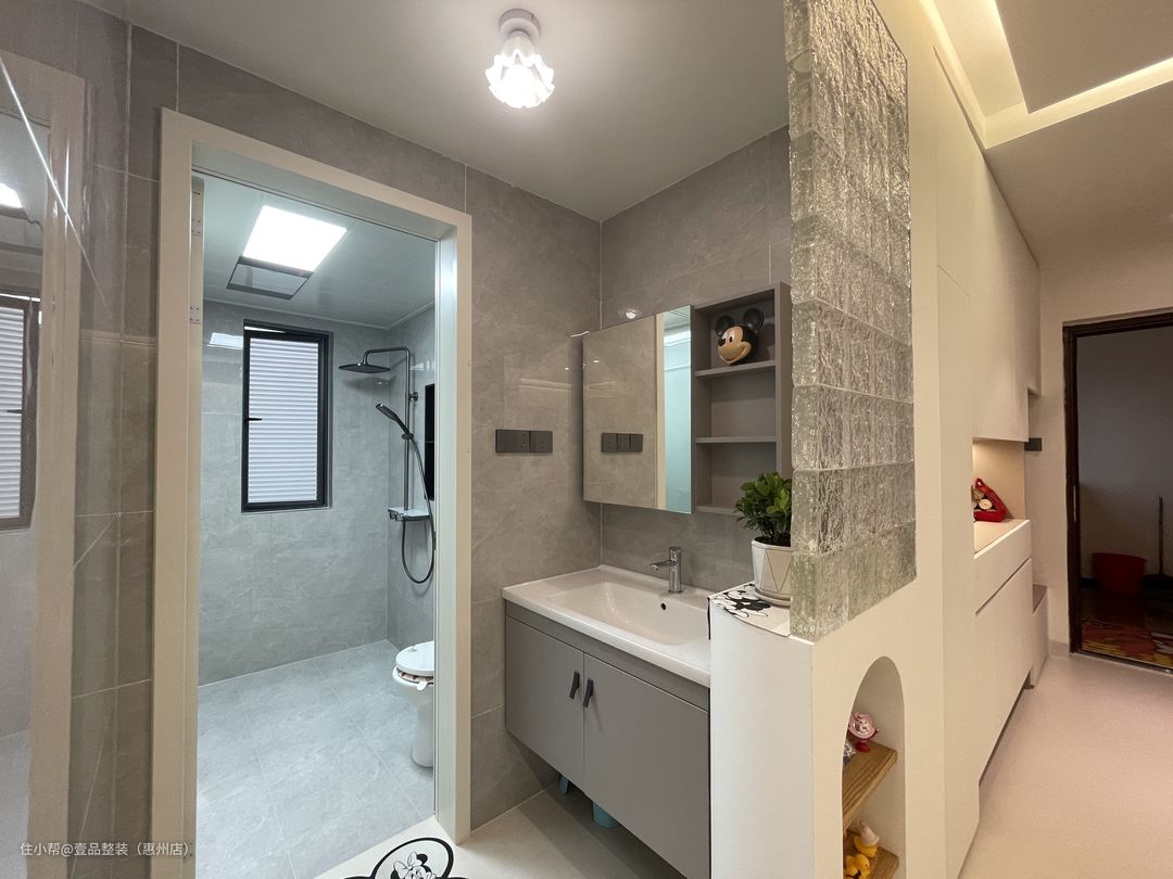 公卫将浴室柜单独拎出来做三分离,无钱拆掉与玄关柜做一体柜设计,底部端景+上部玻璃砖墙,确保采光更显设计感。里面淋浴区在墙上砌墙做壁龛。内嵌铝材壁龛,黑灰搭配更高级。
