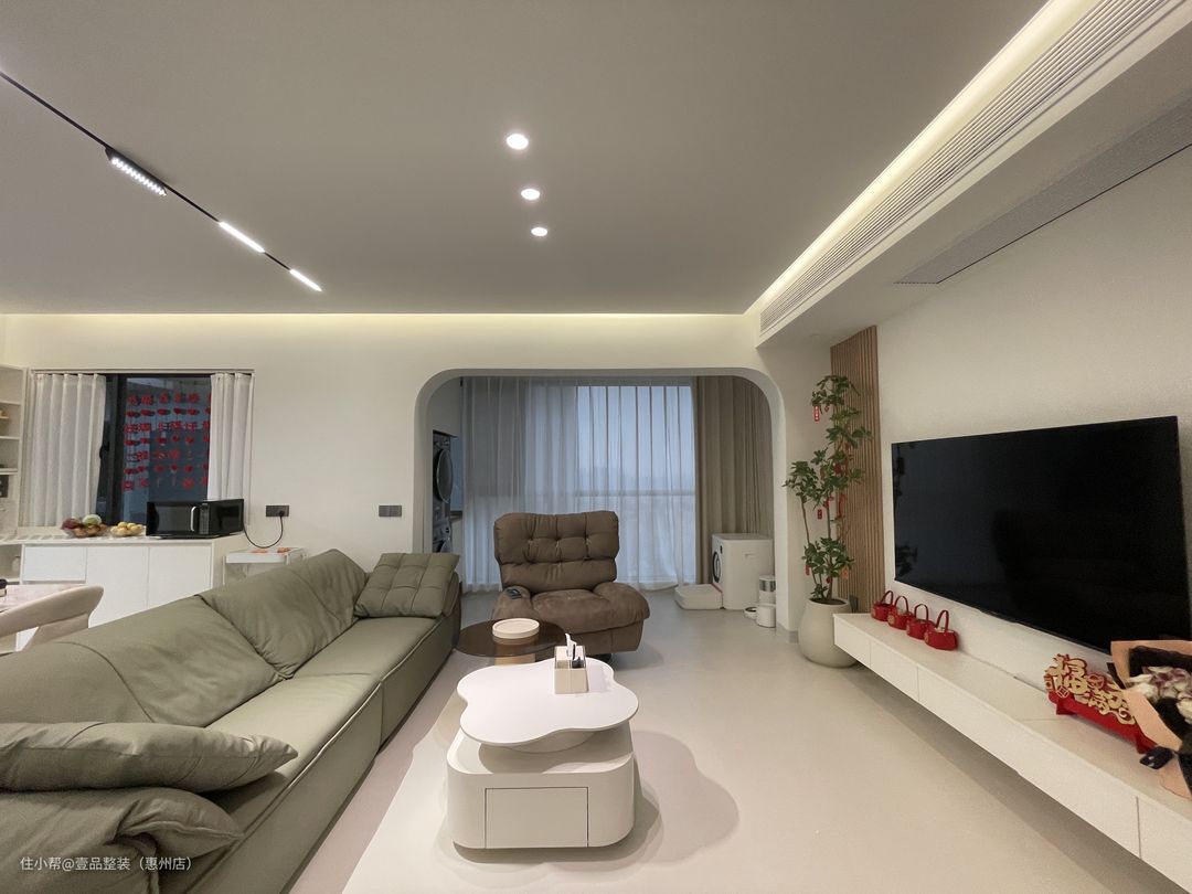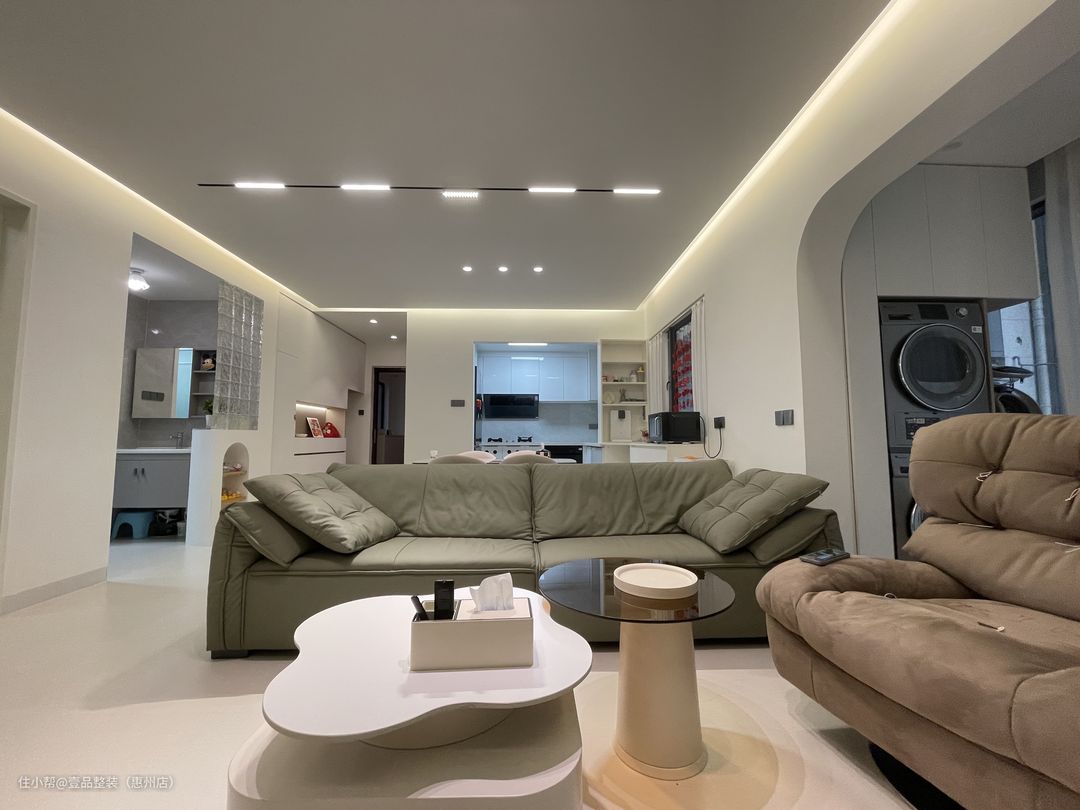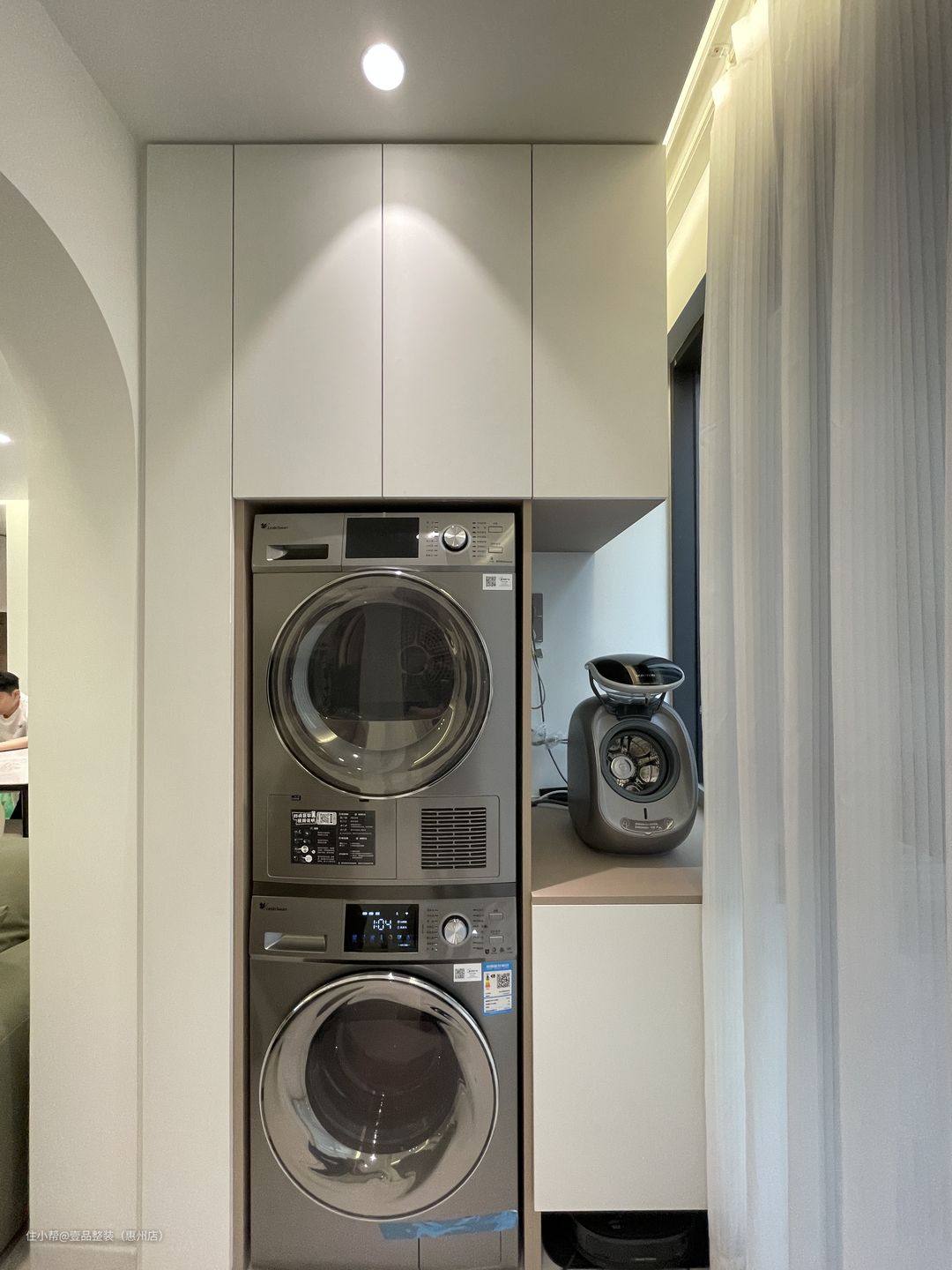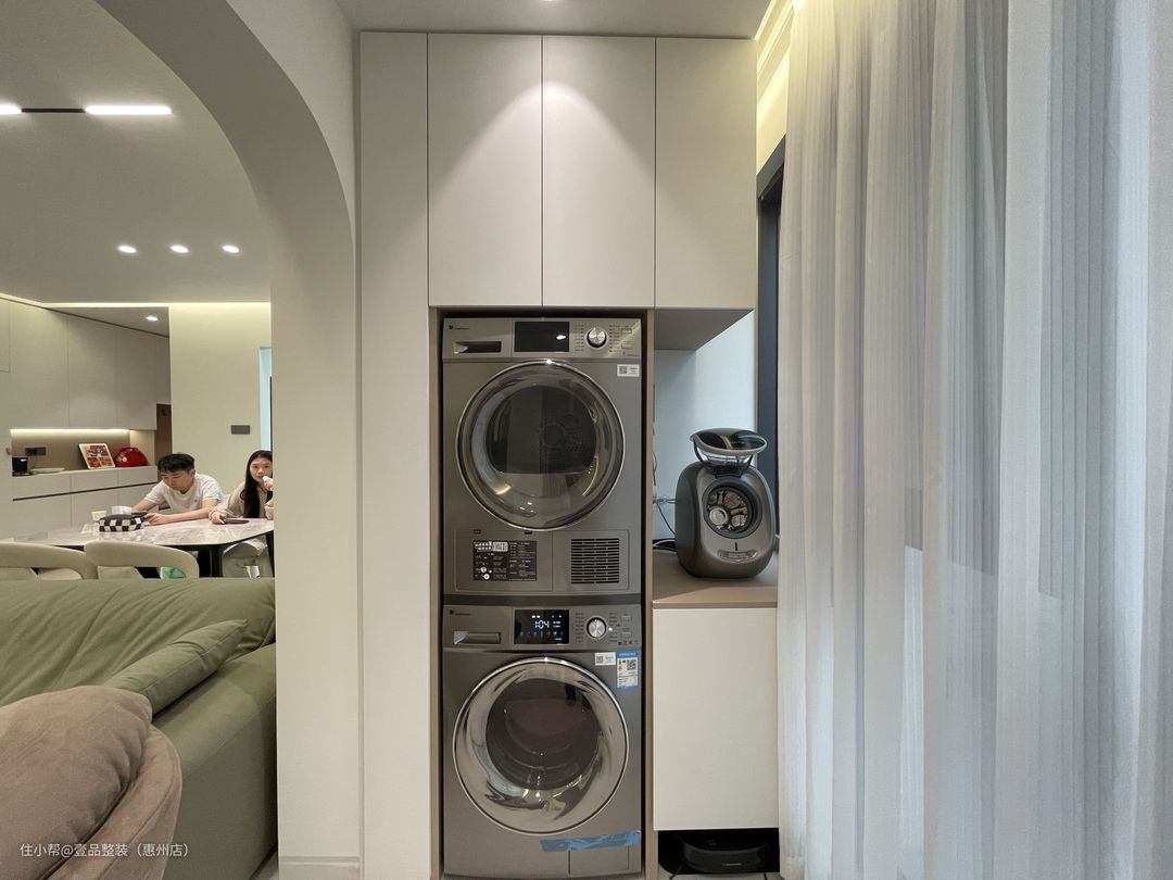 阳台与客厅打通,两边圆弧拱门起过渡作用,里面安装到顶柜,内嵌洗烘机,提前确定好款式、尺寸、规格,也就能做到这种完美贴合的状态。