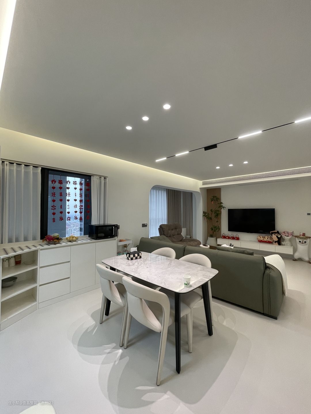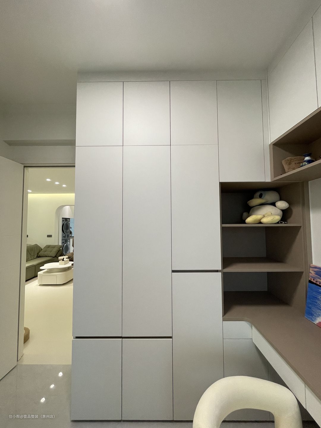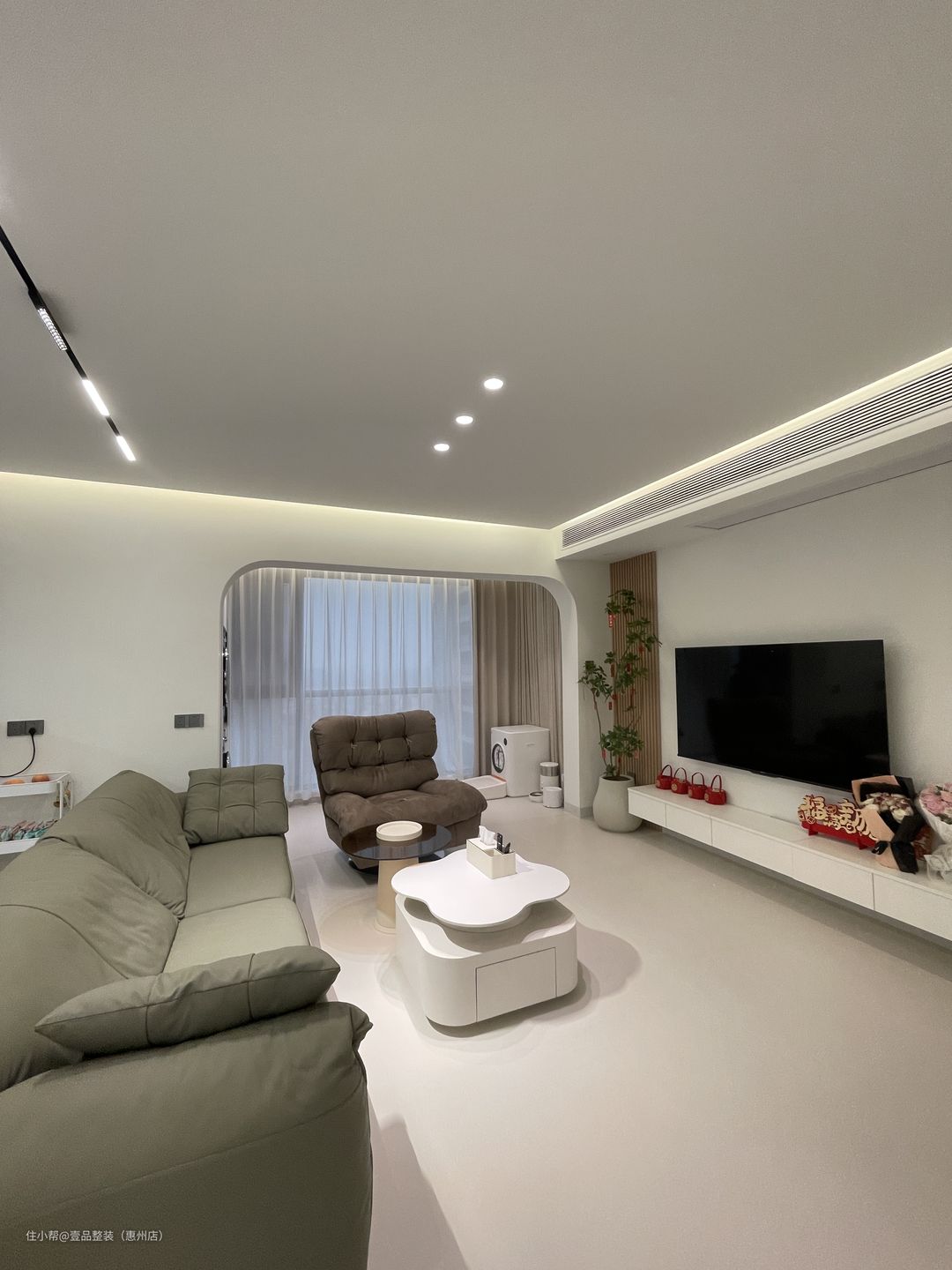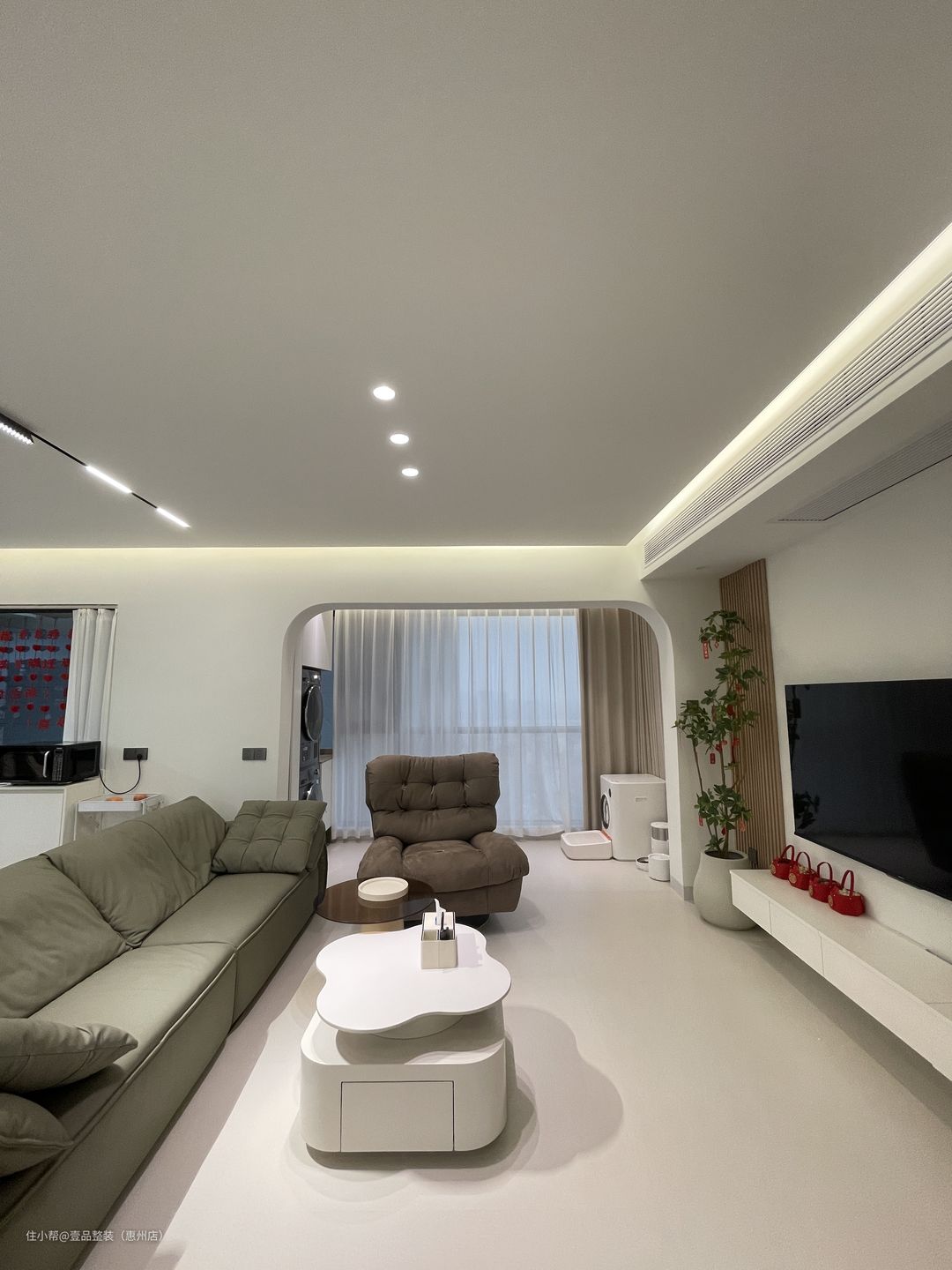 阳台与客厅打通,两边圆弧拱门起过渡作用,里面安装到顶柜,内嵌洗烘机,提前确定好款式、尺寸、规格,也就能做到这种完美贴合的状态。