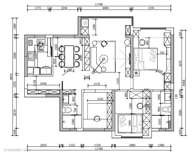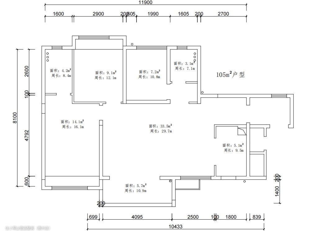 原始户型解析: 1、户型很周正,后期软装摆放较容易,但有一个问题是入户到主卧的走廊空间太过浪费 2、厨房小空间采光一般,建议冰箱内置 3、餐厅空间太小,没有位置安装餐边柜 4、横厅布局,整个视野很开阔,99方的空间更加宽敞明亮