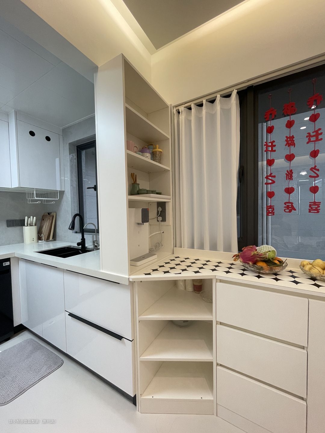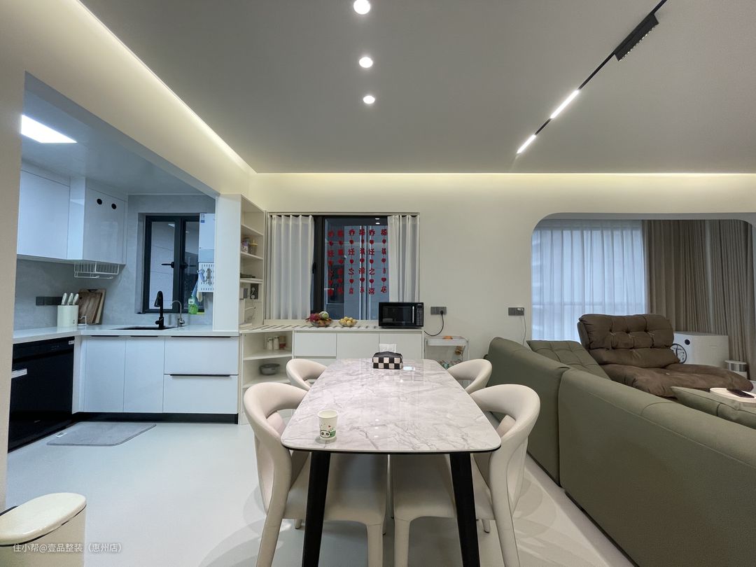 餐厅与厨房打通做餐厨一体设计,窗台矮柜保留采光面,与橱柜的衔接处做斜切柜设计,中间岩板餐桌与黑白配色为主,简约更大方。