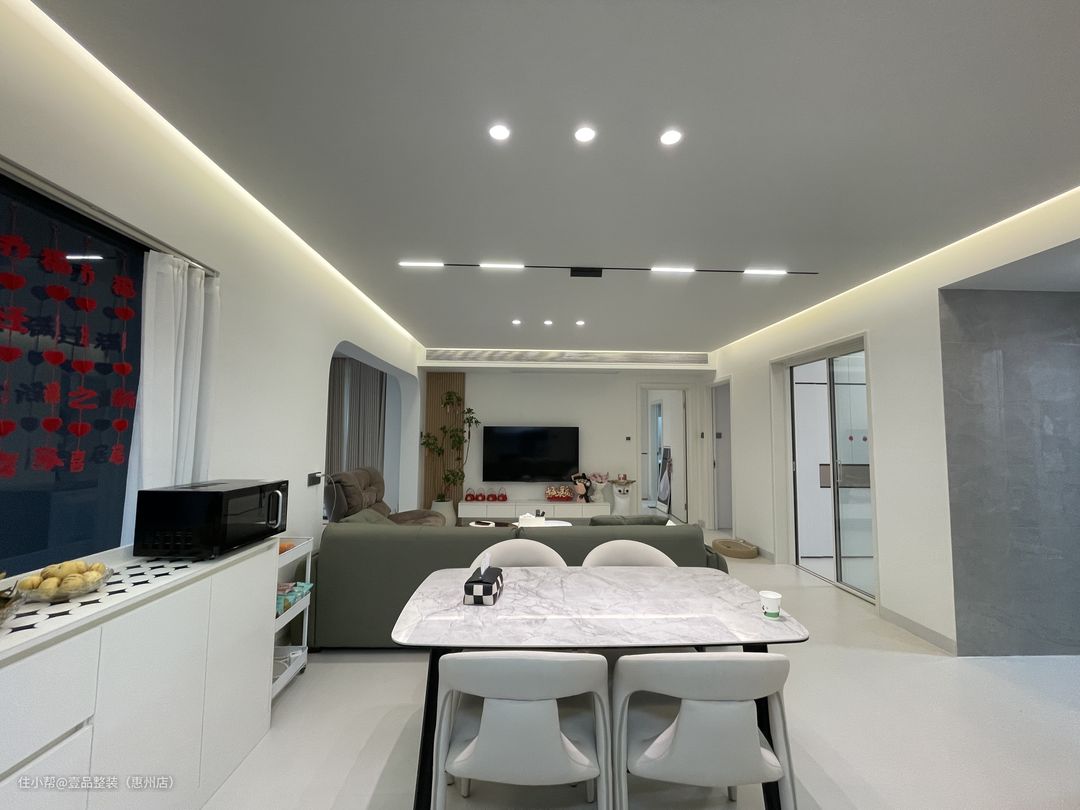 客餐厅吊顶连通做无主灯设计,中间筒灯+线形灯满足灯光需求,侧边内嵌灯带营造悬空效果。简单电视柜做悬空造型,侧边深木色木格栅增添不对称的美。