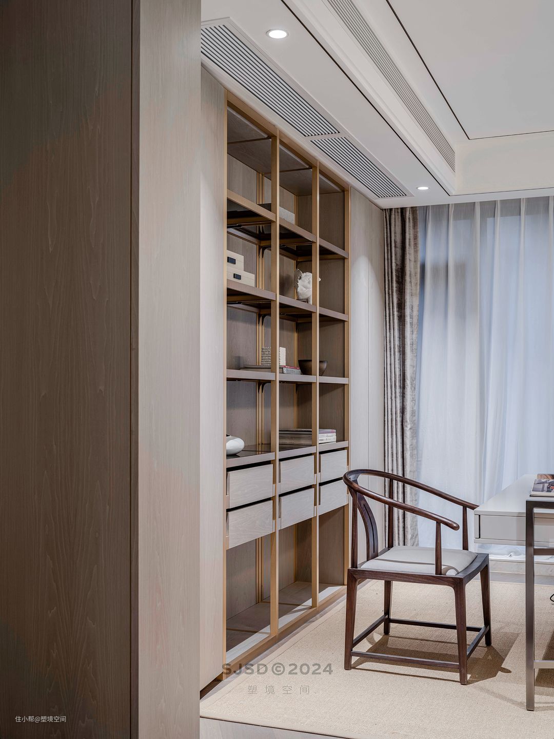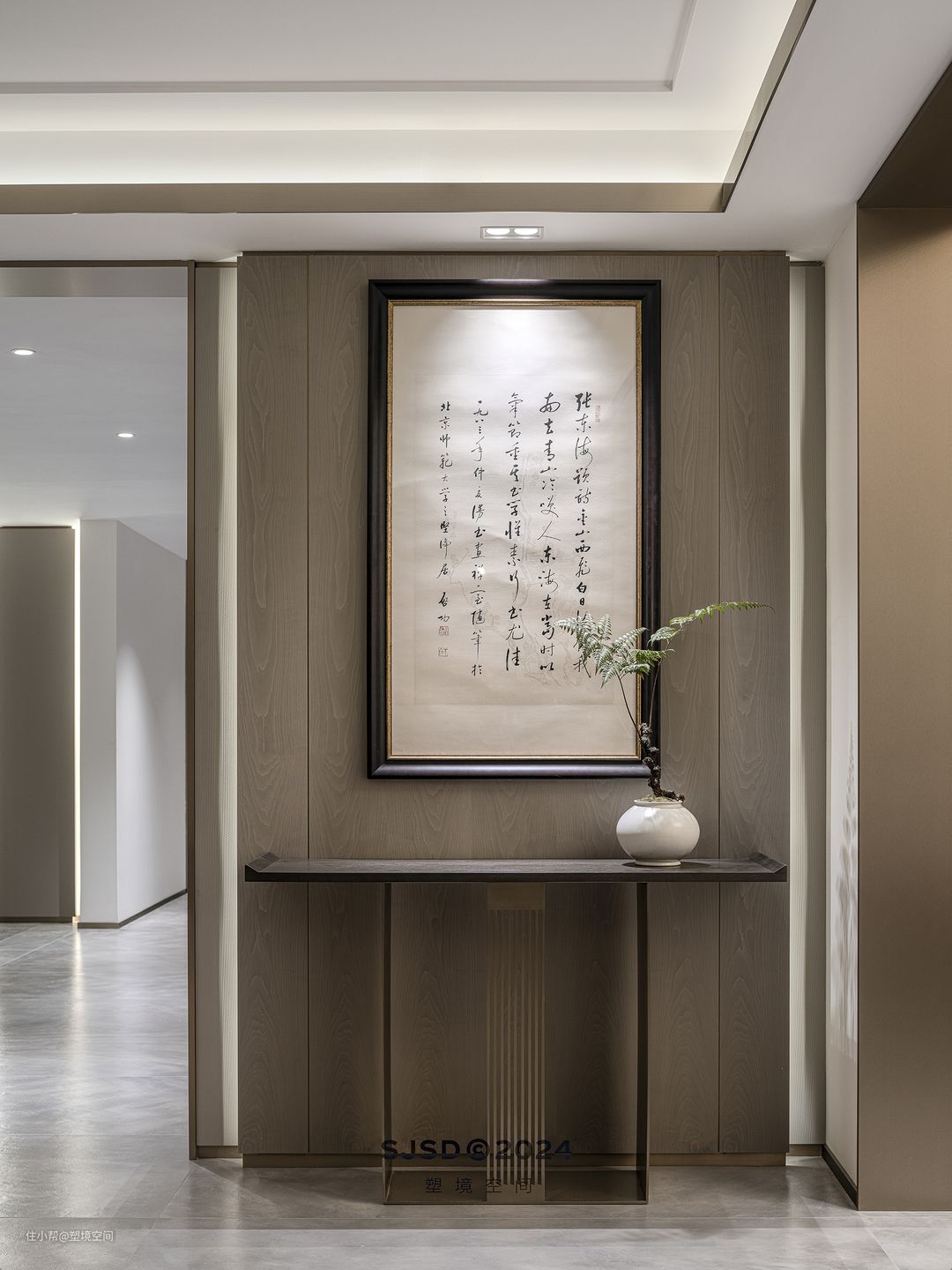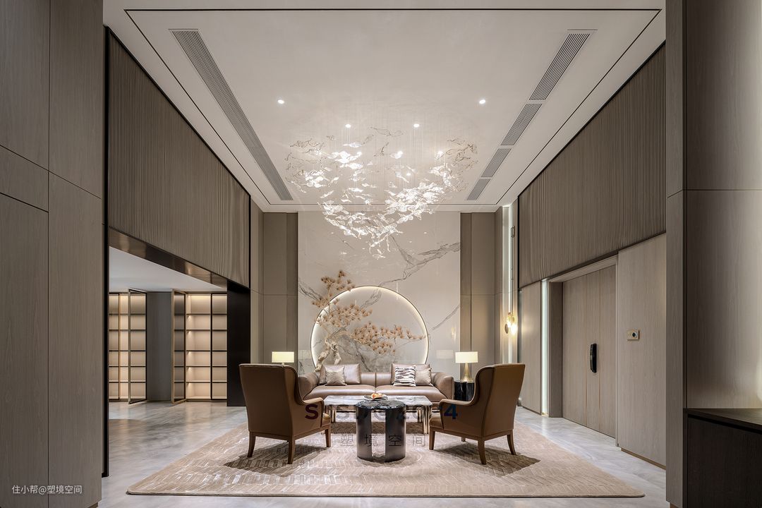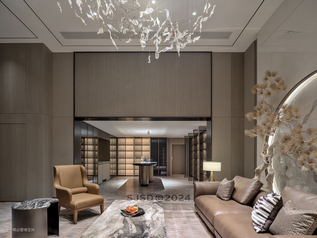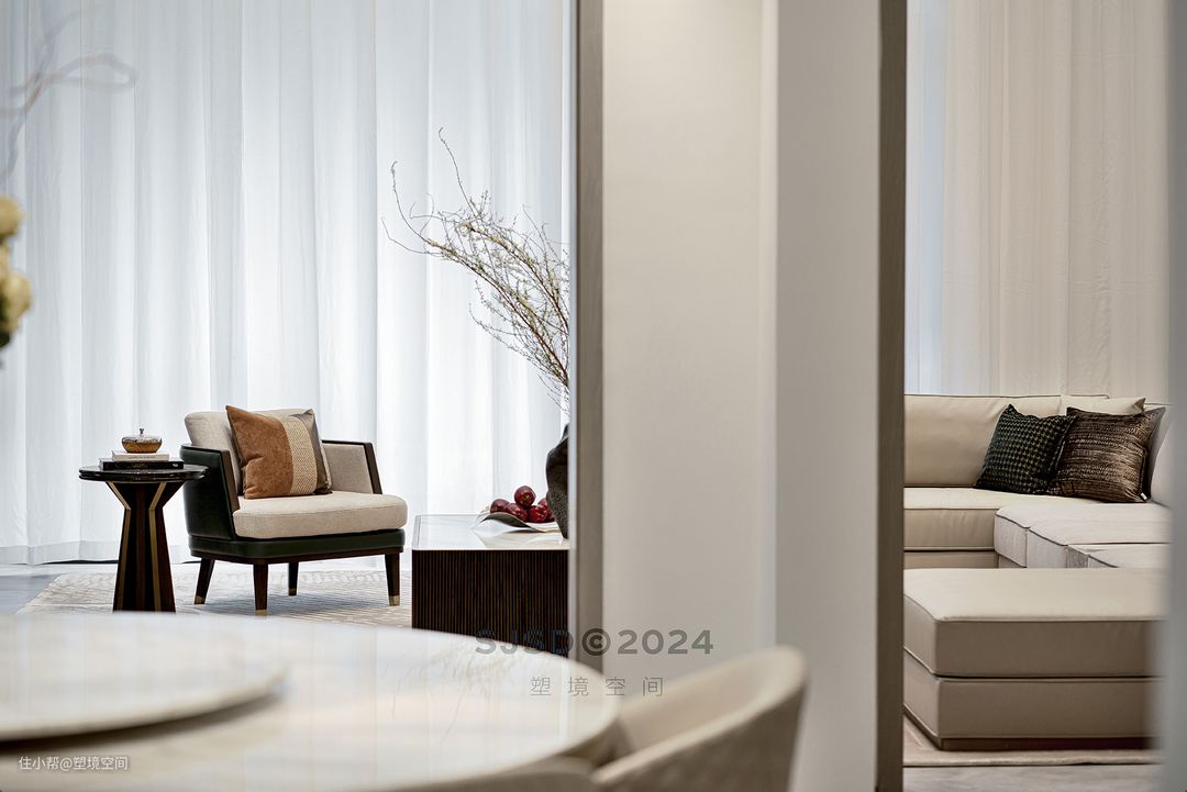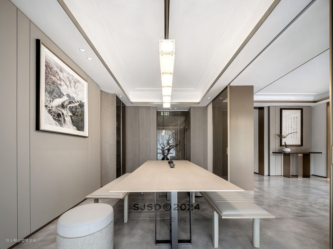 入户左手边设置为品茗区,除了品茗还具备单独会客的功能,和客厅不会相互影响,可以做到闹中取静