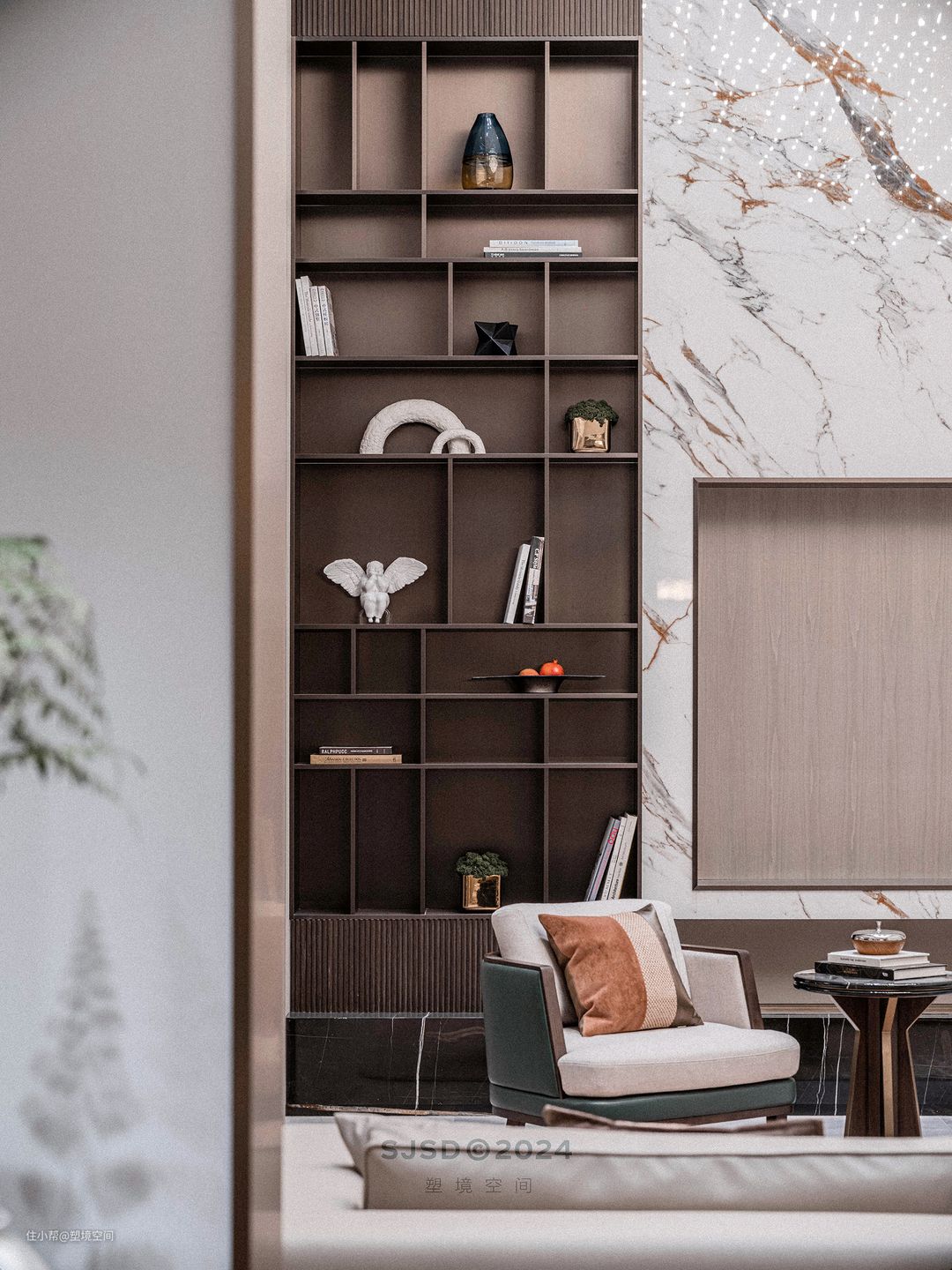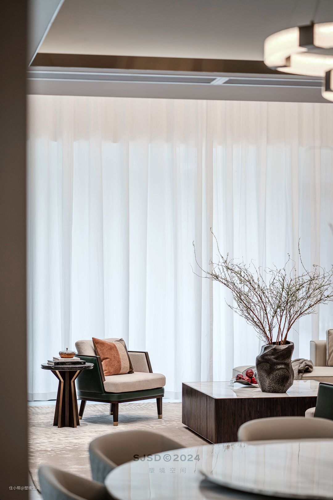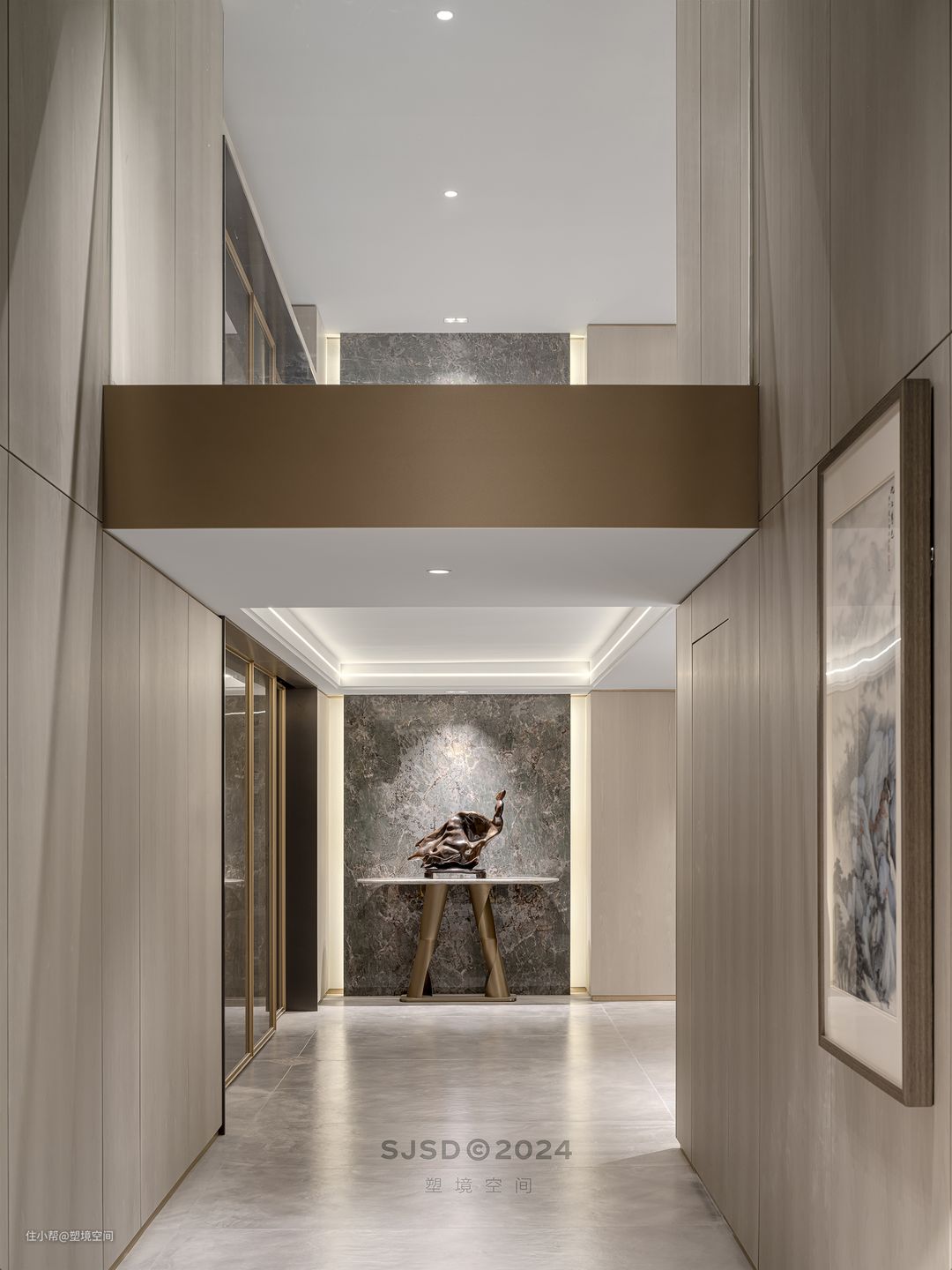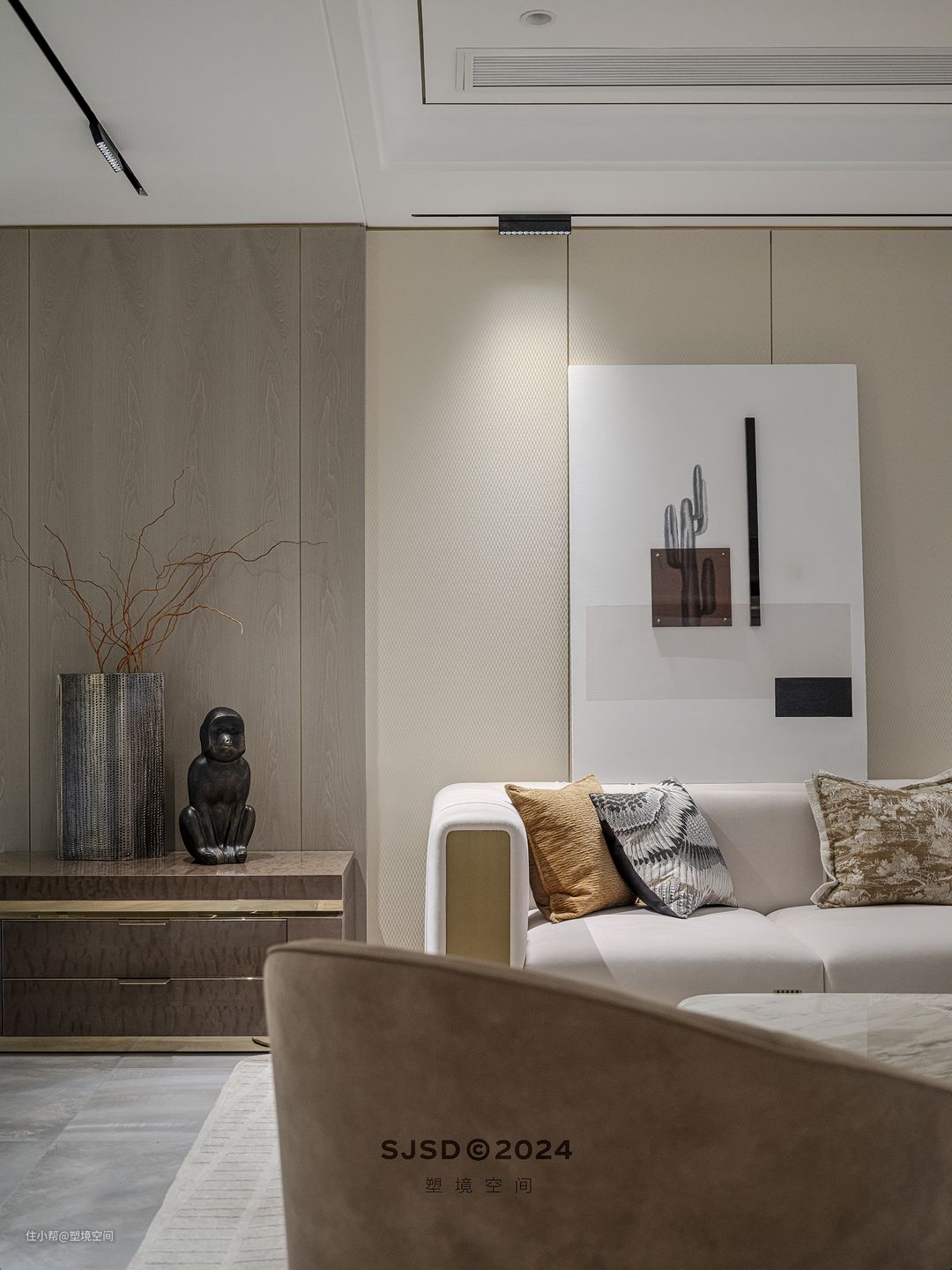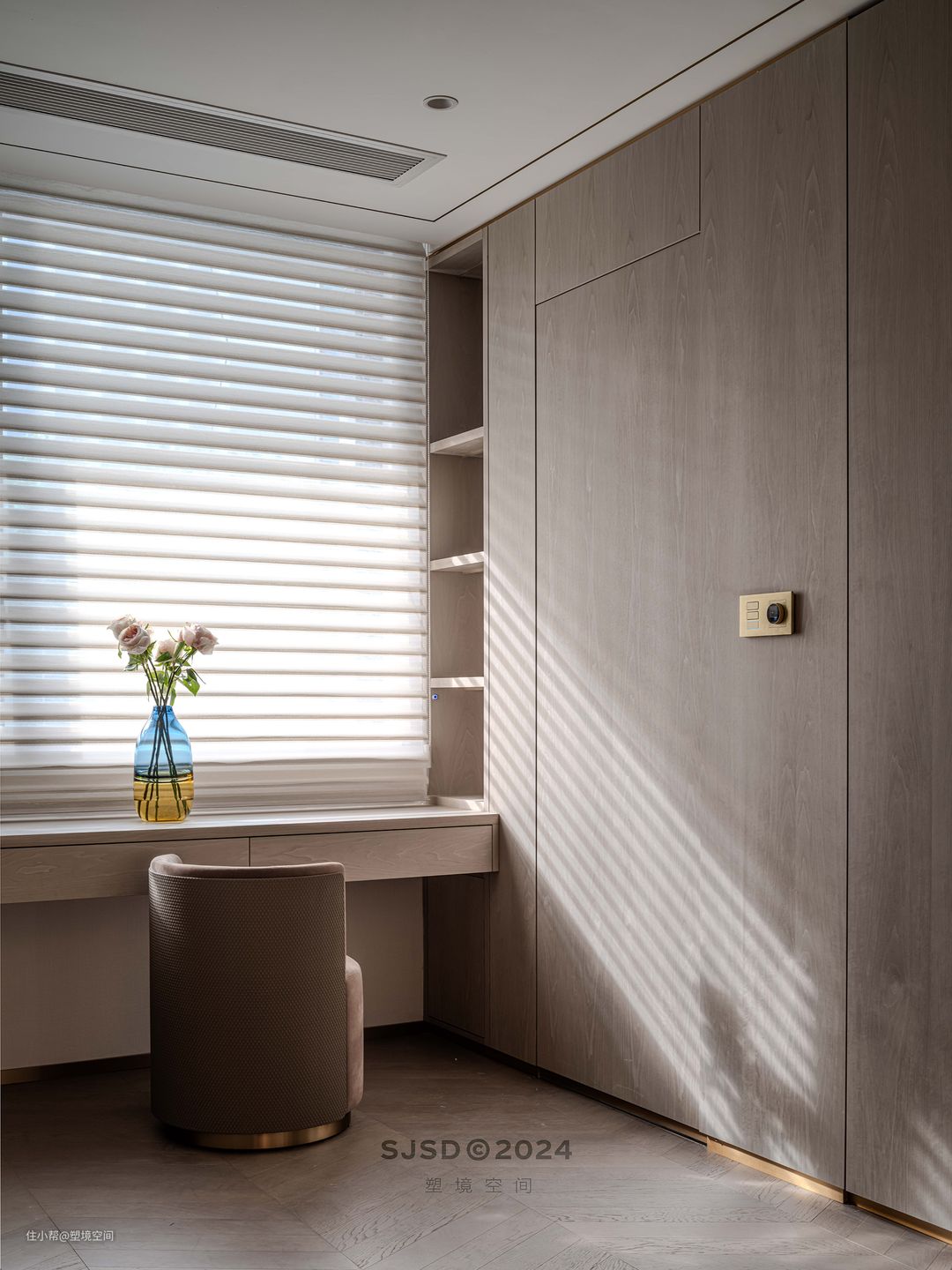 入户左手边设置为品茗区,除了品茗还具备单独会客的功能,和客厅不会相互影响,可以做到闹中取静