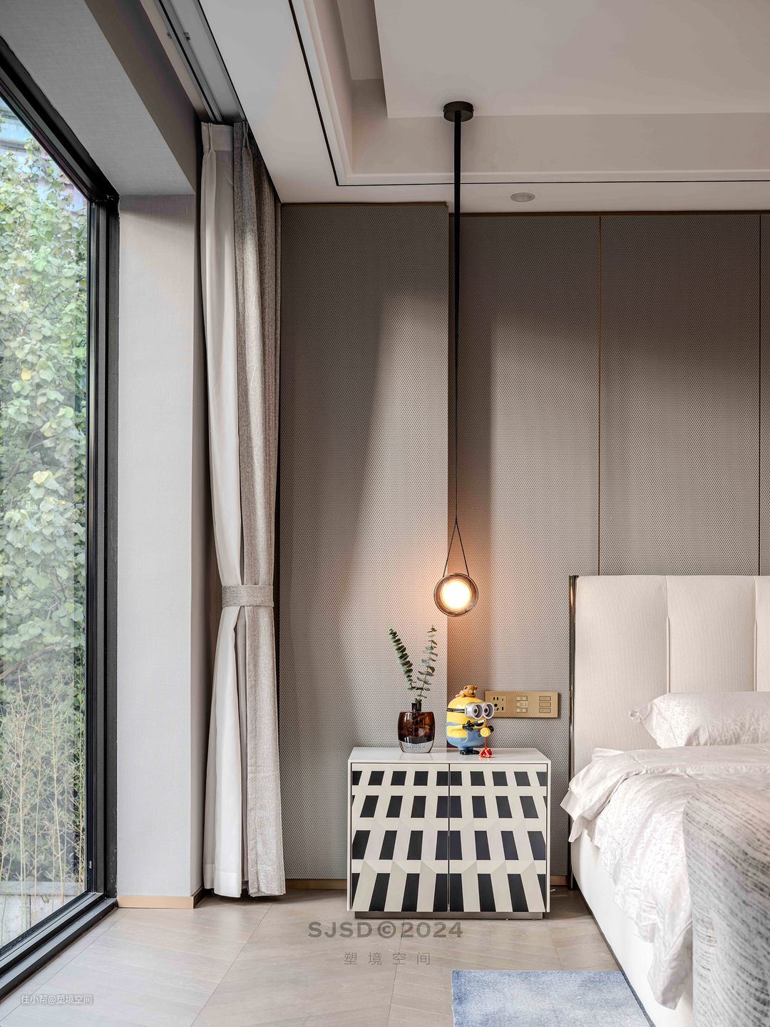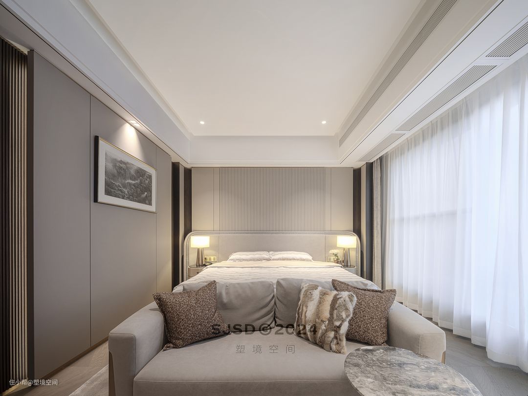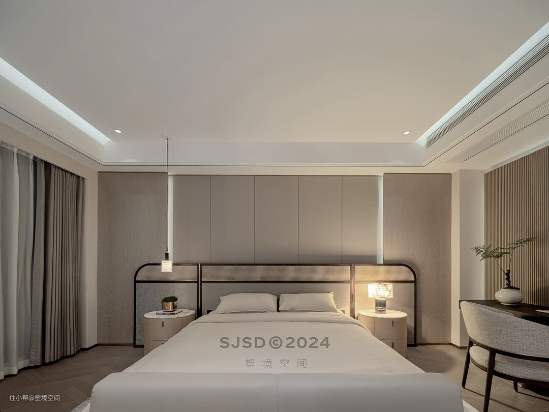 ➊主卧床尾凳配上小边几,是屋主简易的更衣室,他们习惯性的睡前准备好第二天的衣服放在这床尾凳,起床便直接穿衣换鞋。 ➋主卧是个大套间,入门做玄关,起到隔断作用,让主卧有一定的隐私性。 ➌将书房归拢进主卧做套间,没有封住门,无论是从书房到卫生间还是从睡卧到卫生间,洄游动线都很合理。