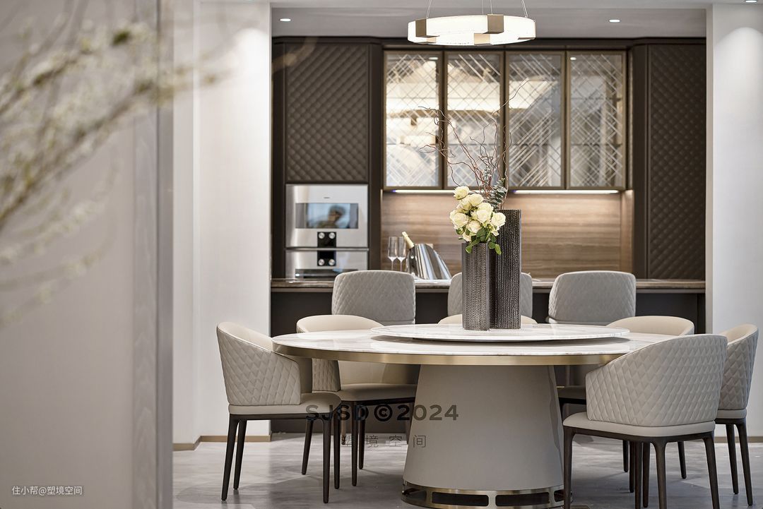 餐厅采用新中式常用的圆桌,桌椅都是这种风格惯用的米黄,刚好可以坐下一家人。紧靠西厨吧台,蒸烤和取酒都非常方便。