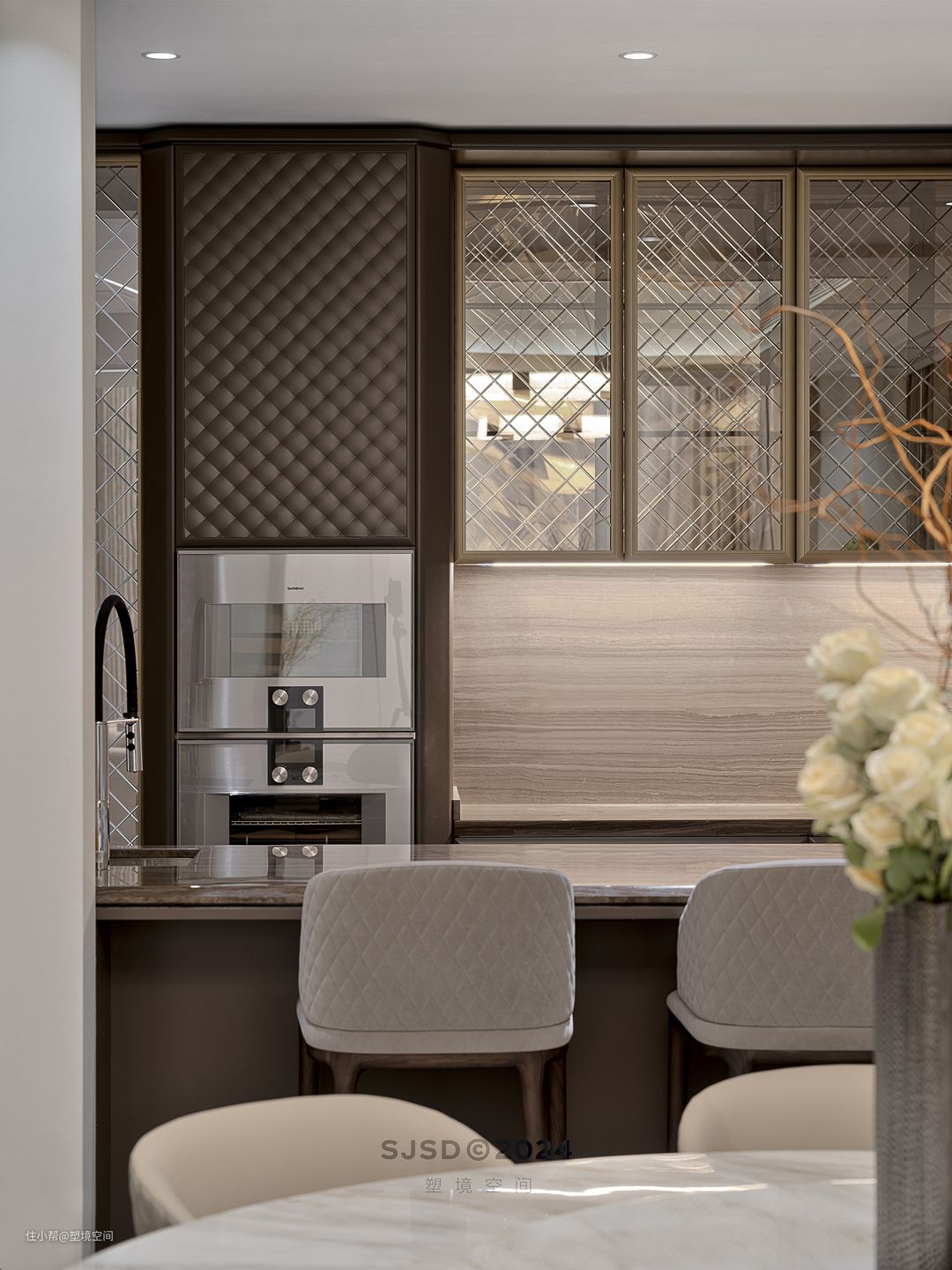 新中式也可以打破传统的封闭式厨房,西厨水吧台开放式厨房融入餐厅,使烹饪区与用餐区、起居空间无缝衔接,增进家庭成员间的交流互动。