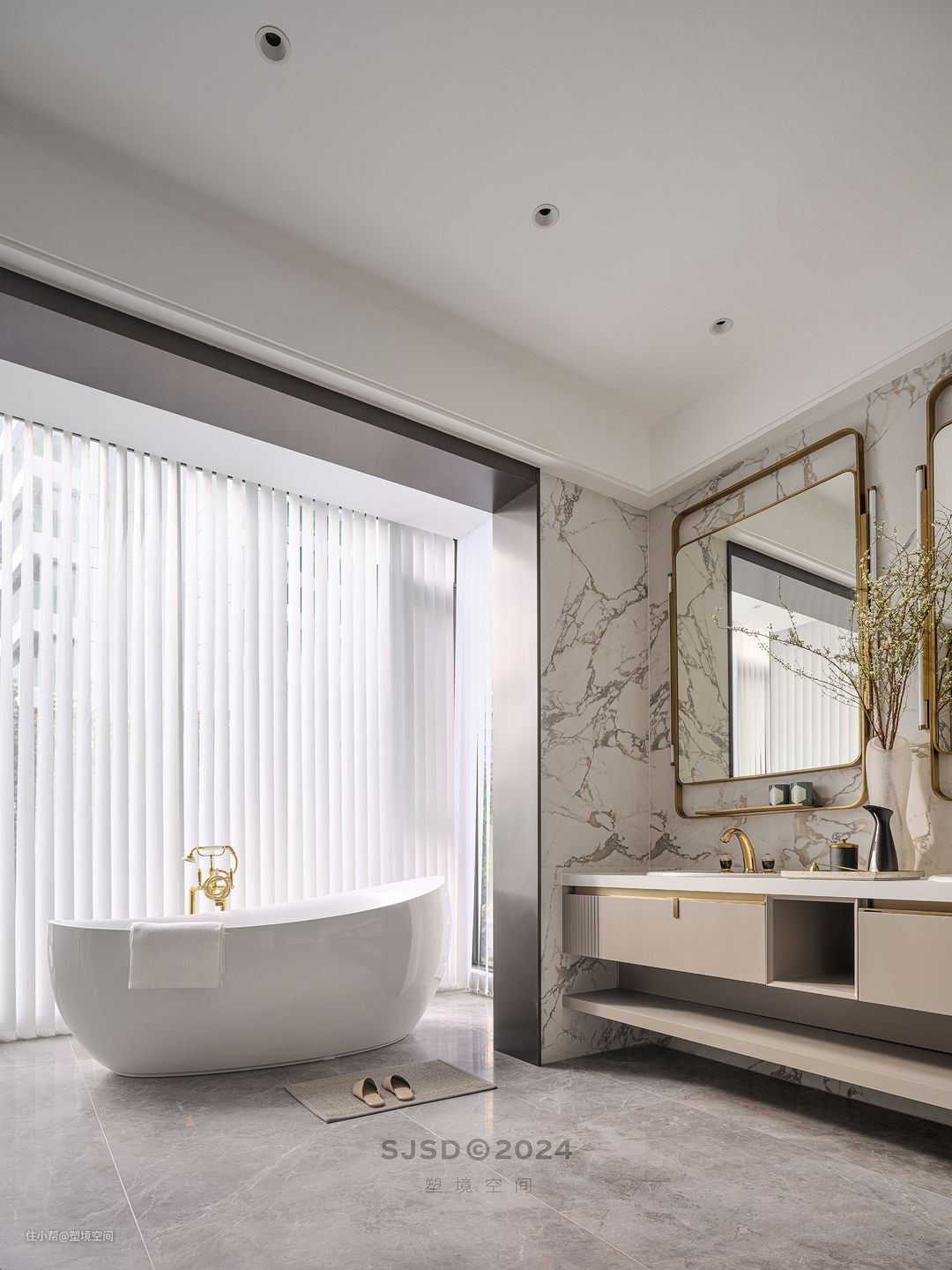 主卫墙面选用了爵士白大理石墙砖,纯净色调与细腻纹理赋予空间无尽的高雅格调;屋主夫妻二人使用卫生间频次相近,为了日常便捷,我们还配置了一体双洗手盆,兼顾了美观与实用。