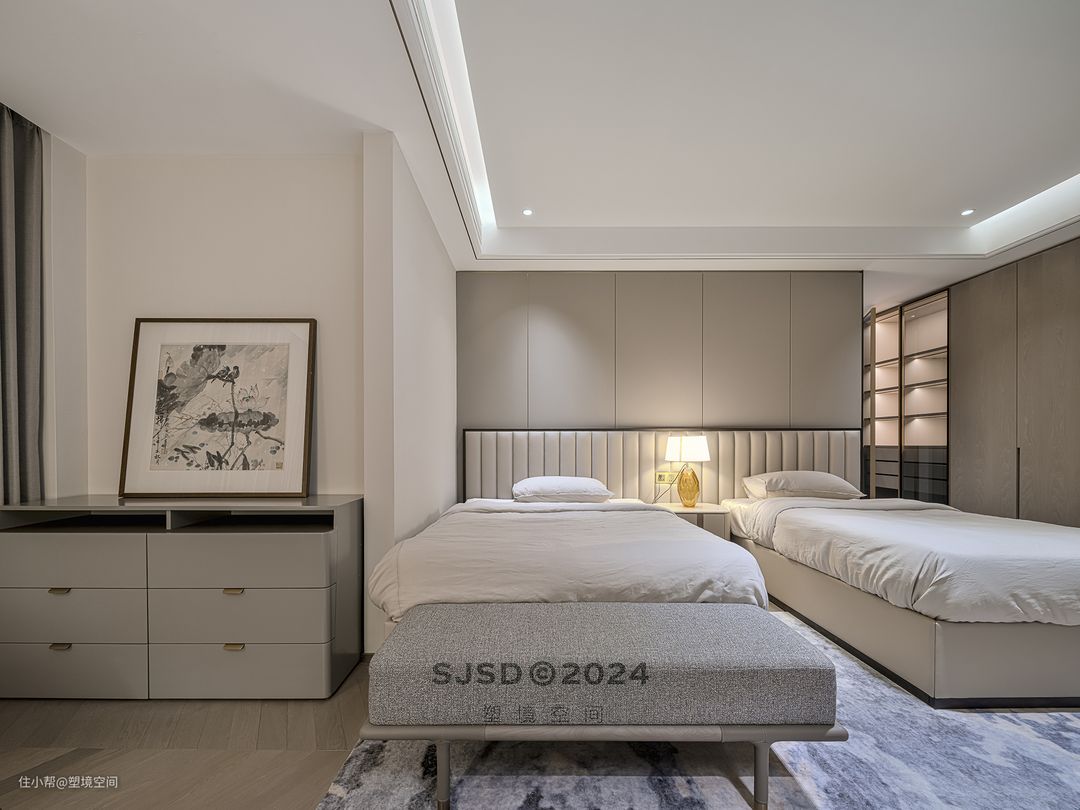 屋主的父亲年迈,需要保姆时时照看,所以长辈房是放置了两个床的,让保姆夜里也可以陪同观察父亲的情况进行照看。