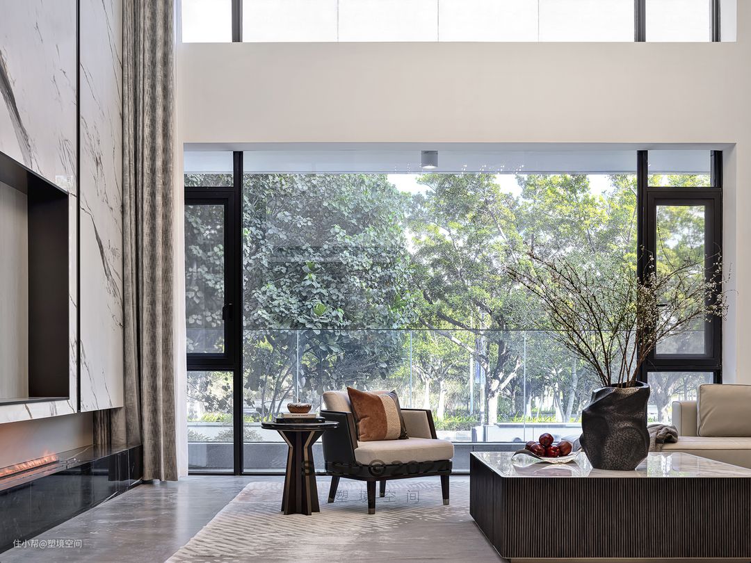 ➊两户打通之后选择西南角作为客厅,并且上方挑空,入户进门显得非常大气,同时超大落地窗提供了充足的采光,也能随时观察到庭院和大门的情况。 ➋ 挑空这一条件可以设置超大的电视背景墙贯通两层的高度,白色大理石上墙搭配棕色的金属装饰柜和木饰面。 ➌地面采用灰色的大片瓷砖铺上巨幅米色地毯,放上线条硬朗的沙发茶几,端庄的同时又能感到温馨。