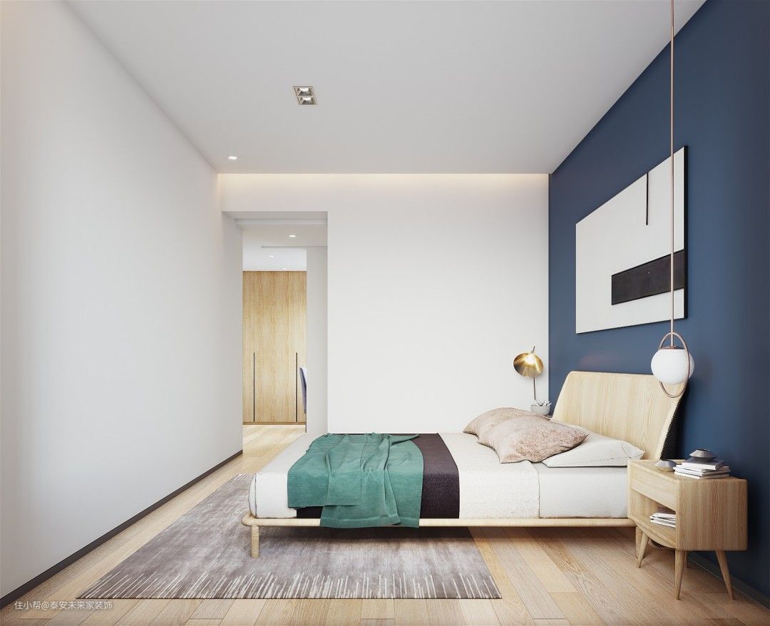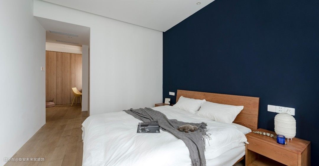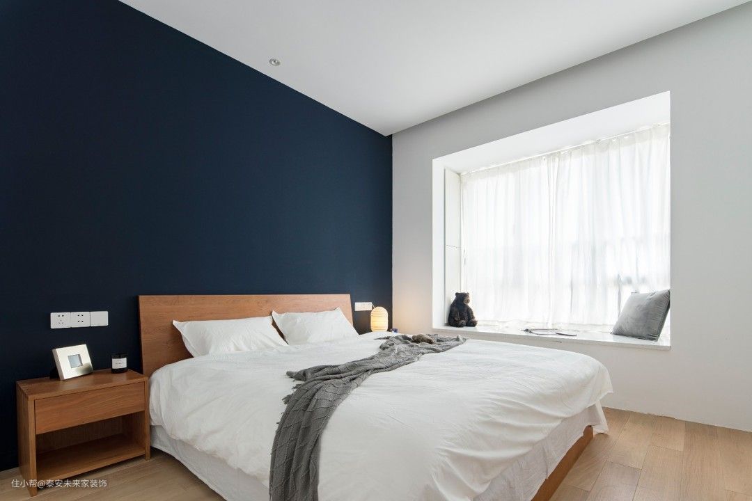 主卧的收纳在两侧柜子中,飘窗台叠衣服顺手就能收纳 全房不施地脚线,主卧一片白茫,床头刷中铁蓝表达宁静