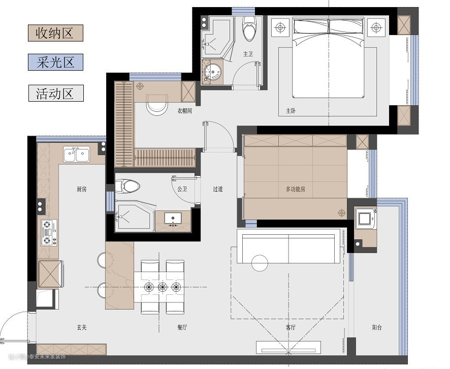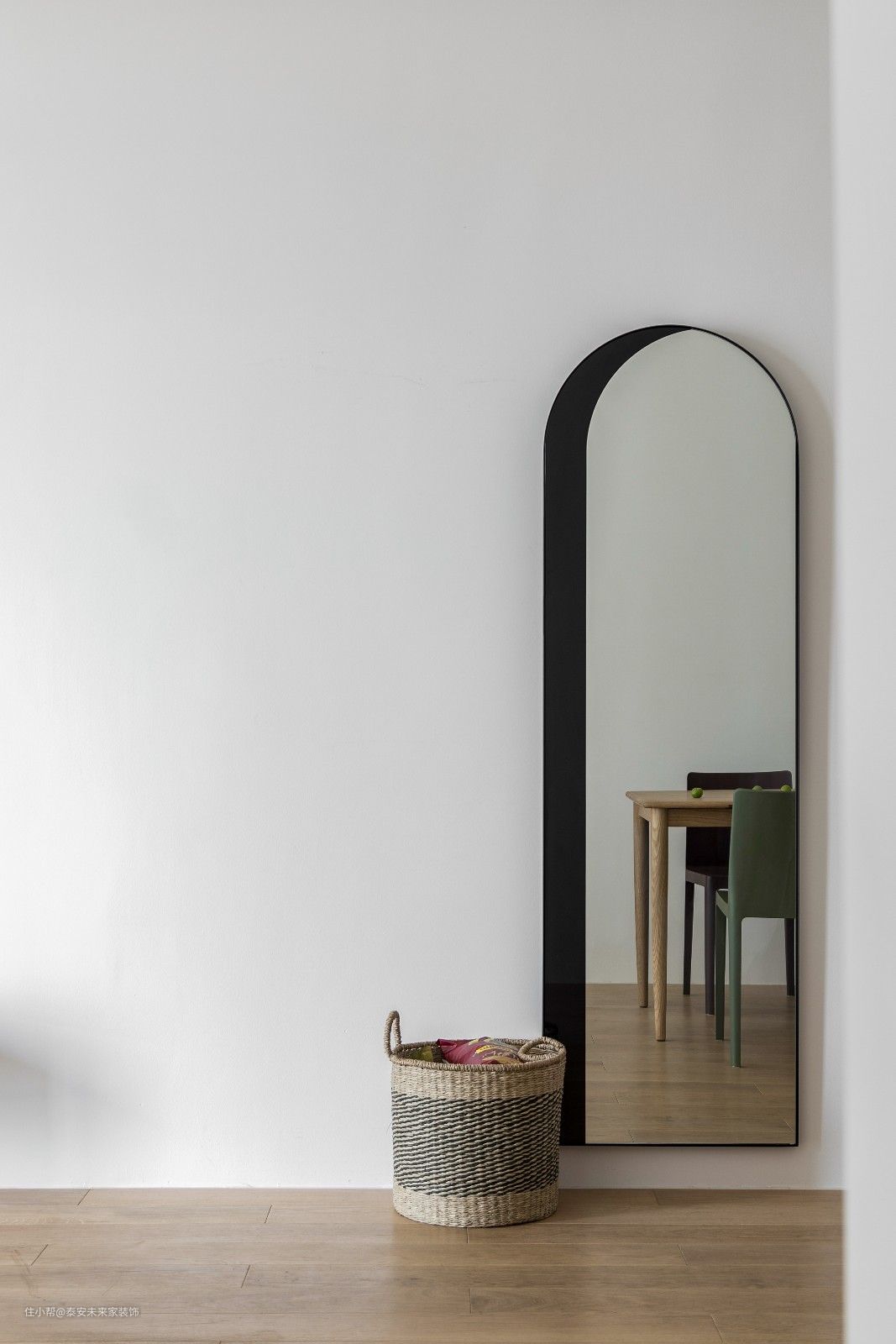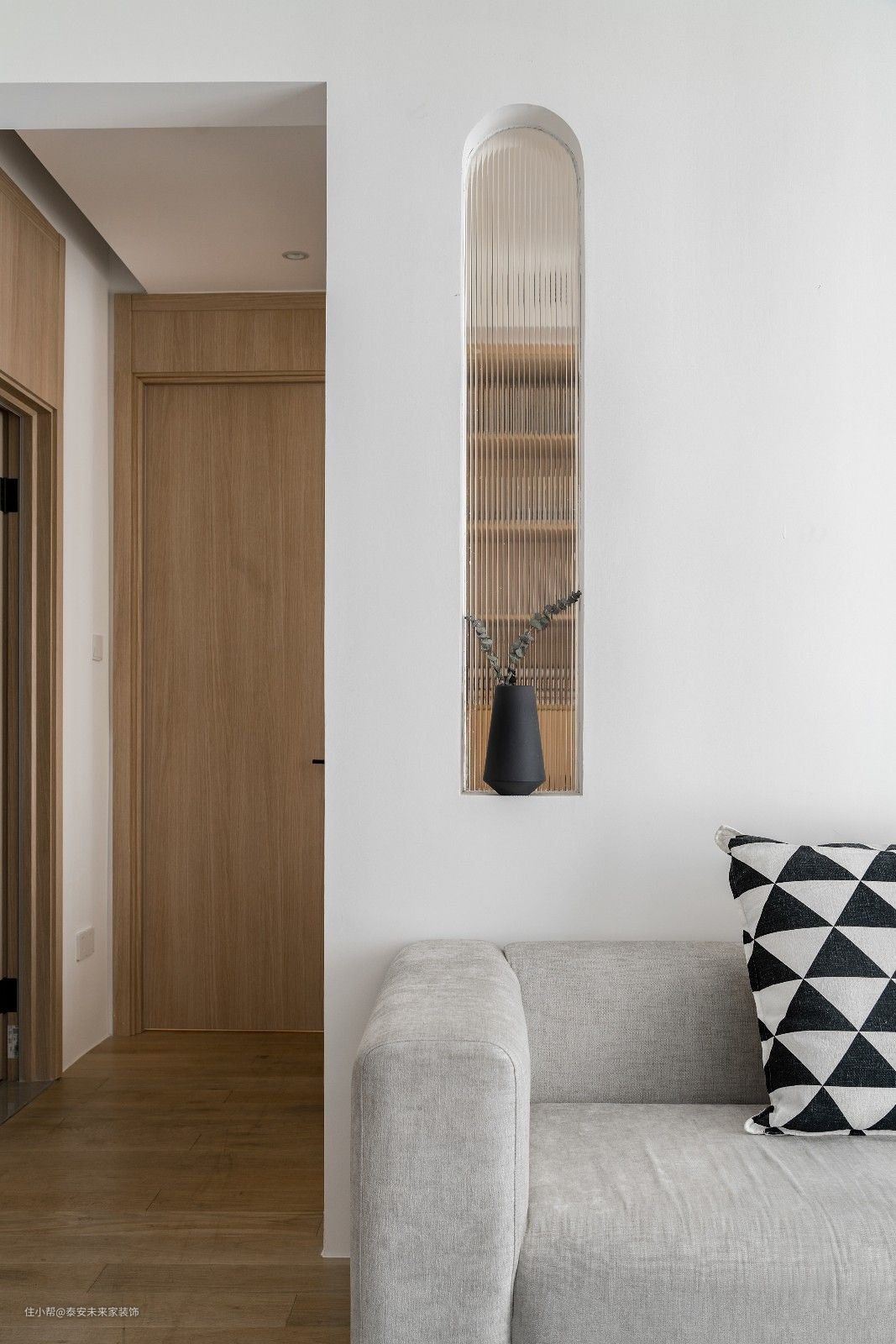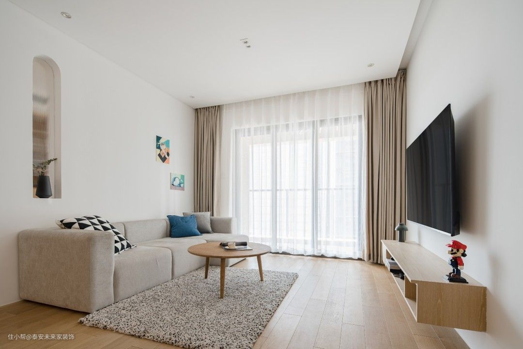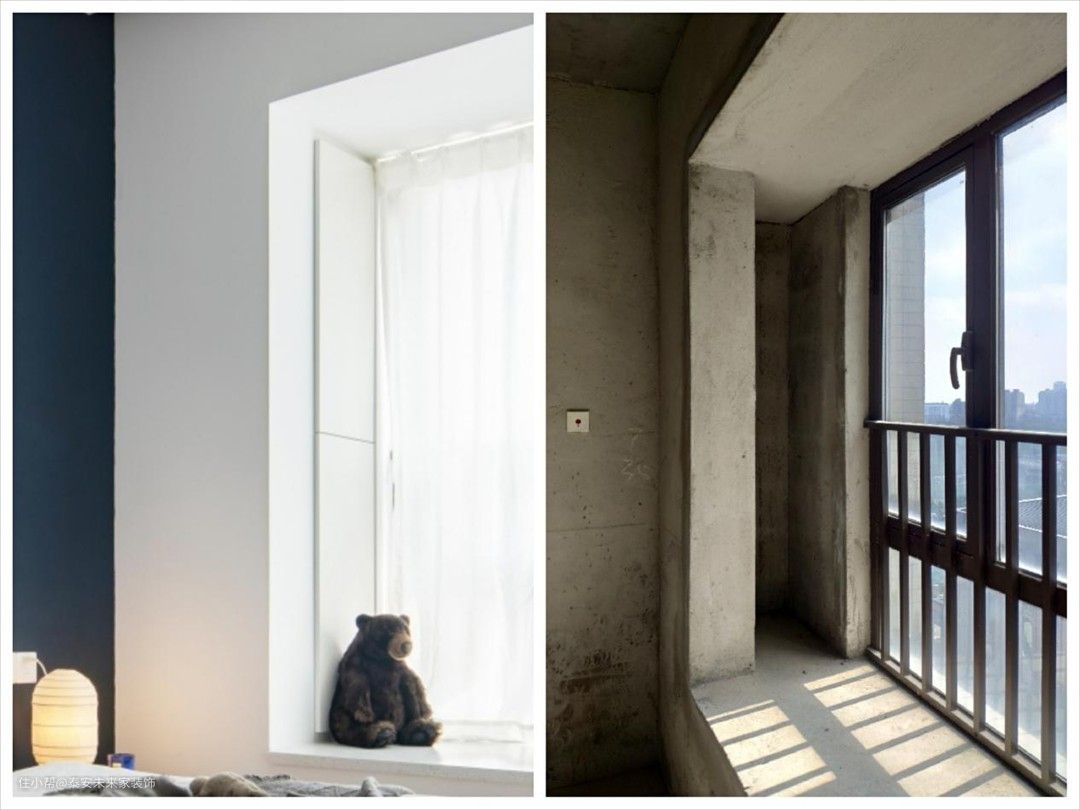 加入古希腊建筑元素--代表人类理性美的拱形。来对抗为了淘汰而生产的潮流,为了标新立异而迷失方向的家。 从厚厚的墙面凿出一个窗洞,只为了扳倒后面房间逼仄的体感,优雅之外承接着透光透“气”,理性的比例包含更丰富关爱。 拉开纱帘后的黑色窗框与现场略显违和,它的材质并没有错,需要思考的是位置与比例。 淡色背景下惊艳于画作,艺术品表达的精神,经过拱小姐的一笔一绘得以确认