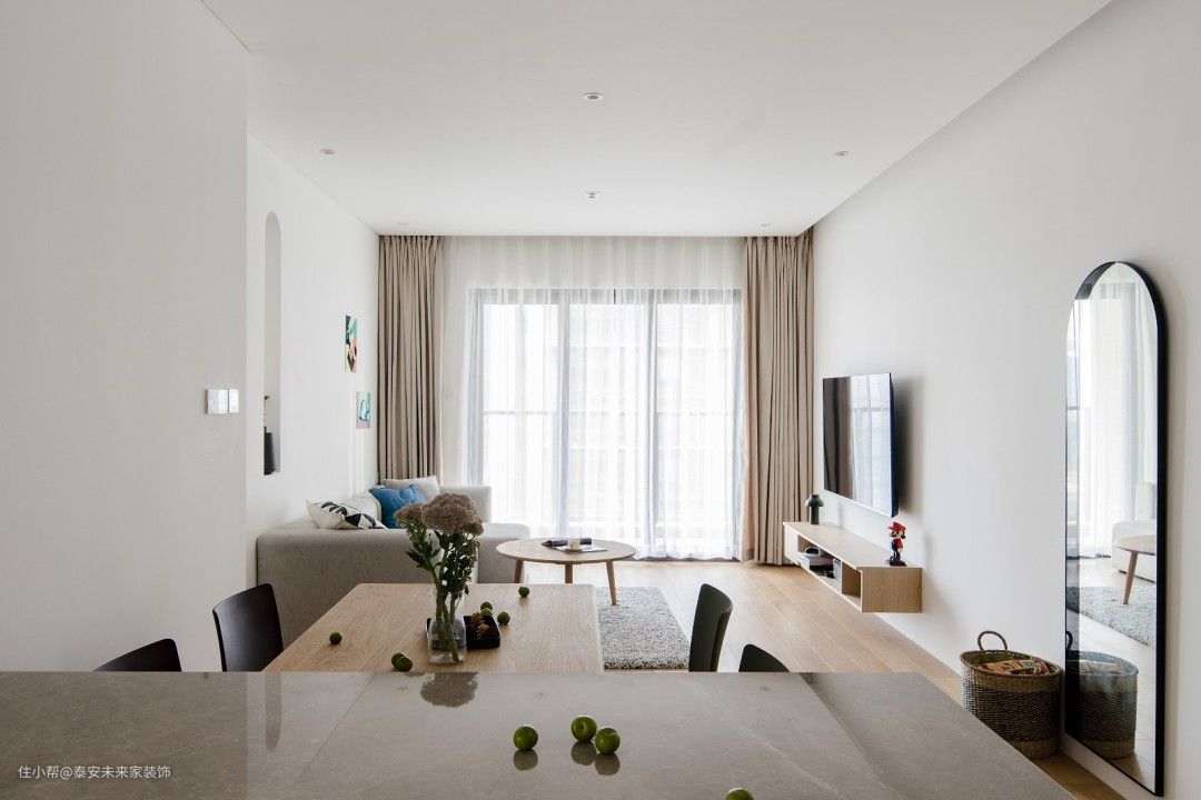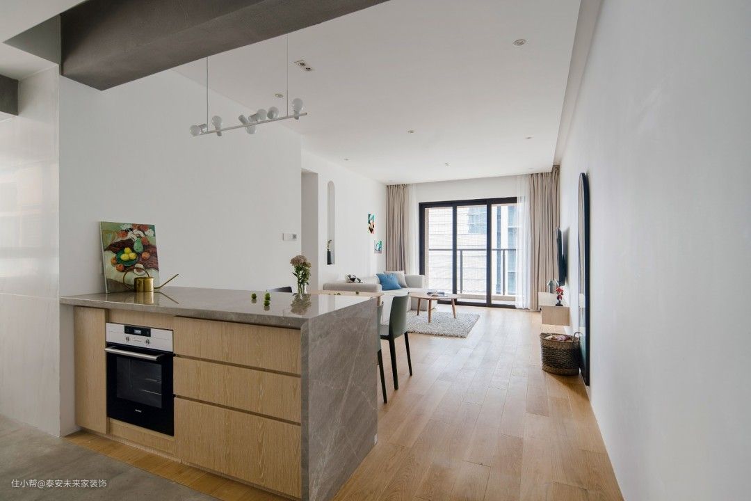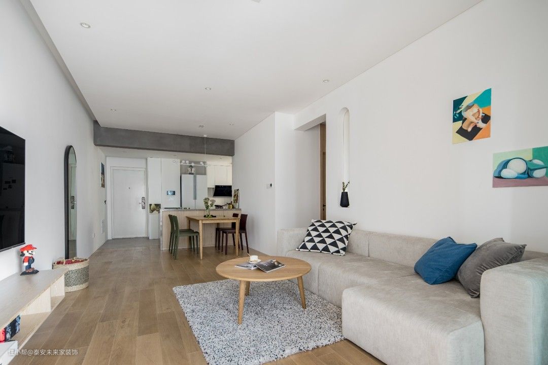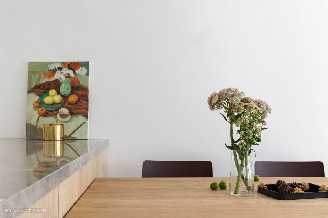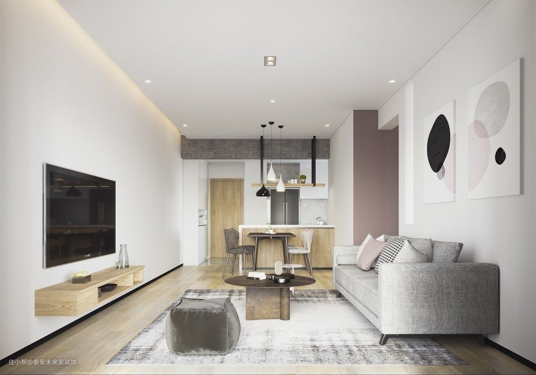 材质上用驯服后的木材、石材、水泥元素。加上白色、沙色、灰色表现自然。 然而我们不希望过于自然,也时常苦恼于台面上疏于打理的灰尘。 用细水泥将梁抹平,后方将空调风口隐藏起 将水泥梁冰冷的材质,对比餐桌木头的凝固的生命。两种材料水火不容碰撞出平衡之美 白色墙面散发宁静。沙色窗帘、地板气氛和谐 过道面积较小,实际上粉色墙面刷的白色