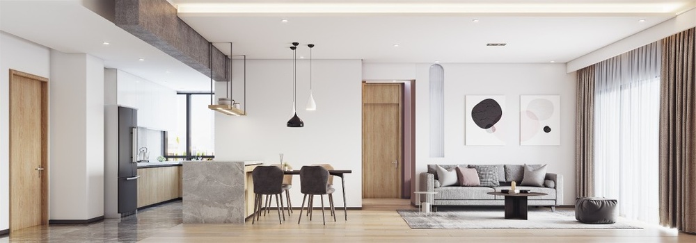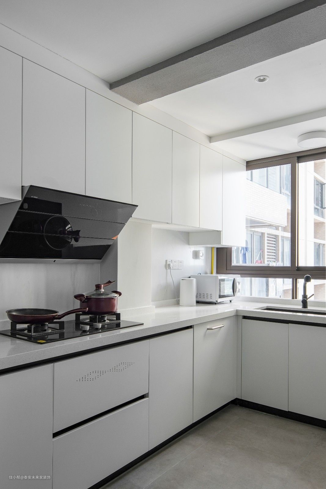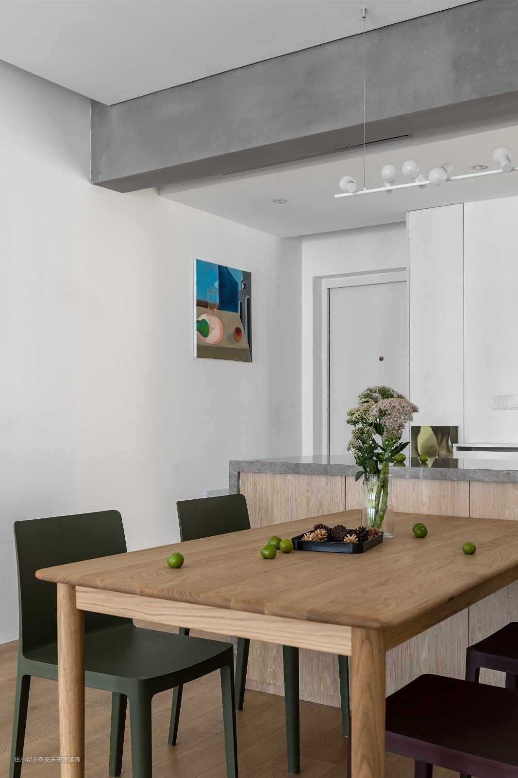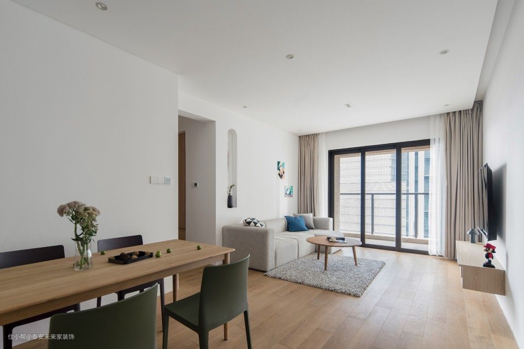 材质上用驯服后的木材、石材、水泥元素。加上白色、沙色、灰色表现自然。 然而我们不希望过于自然,也时常苦恼于台面上疏于打理的灰尘。 用细水泥将梁抹平,后方将空调风口隐藏起 将水泥梁冰冷的材质,对比餐桌木头的凝固的生命。两种材料水火不容碰撞出平衡之美 白色墙面散发宁静。沙色窗帘、地板气氛和谐 过道面积较小,实际上粉色墙面刷的白色