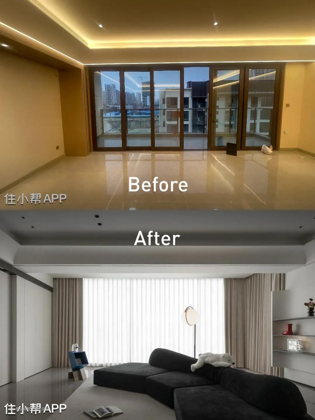 景观阳台纳入客厅,扩充室内使用,大面积落地窗引入丰沛的自然光线。拆除原始墙纸与柜体,黑白极简形成主要基调,将两人心中理想的生活氛围具象化。 改动后的次卧门框与柜门同色,从而在视觉上达到隐形状态。原本一面普通的墙体,在调整过后,将功能多样化,依次满足储物、观赏、投幕观影。
