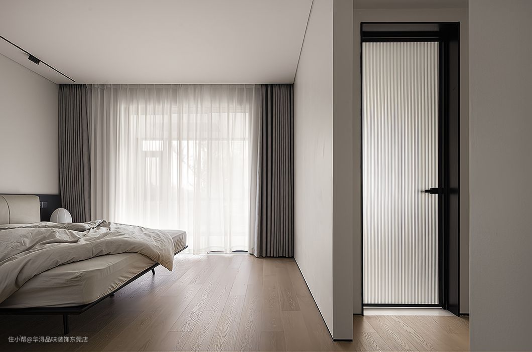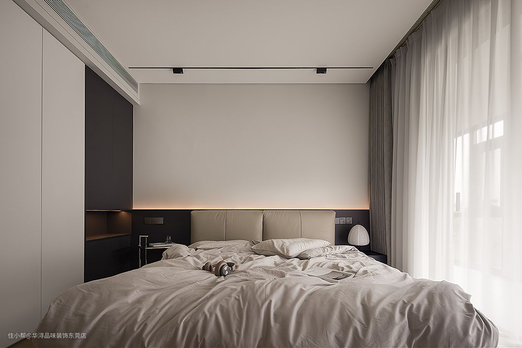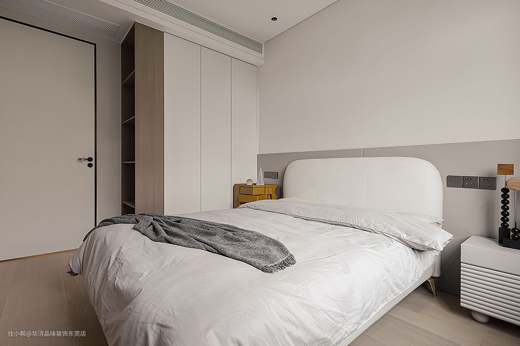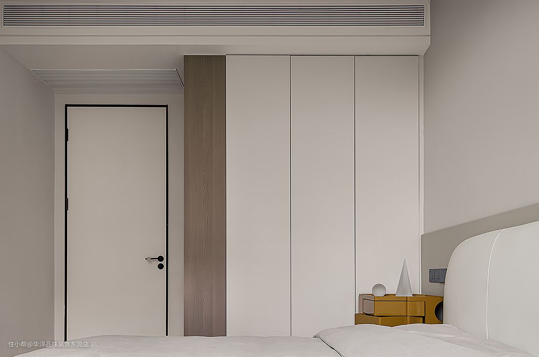 卧室空间内,大面积留白如同一张白纸,等待着被生活与情感填满,为居住者提供无尽的想象与创造空间。无主灯设计让空间摆脱了传统的束缚,显得更为开阔与自由。木质地板的沉稳气质,与卧室的静谧氛围相得益彰,仿佛是大自然的馈赠,为居住者带来一份宁静与平和。