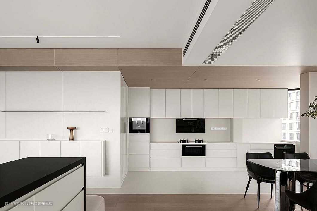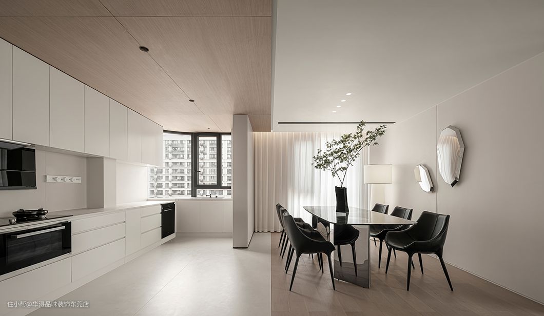 餐厅和厨房紧密结合,一处半墙设计,让空间产生微妙联系。厨房和餐厅的白色和木色形成上下对称效果,木质和留白融入岁月的阳光中。