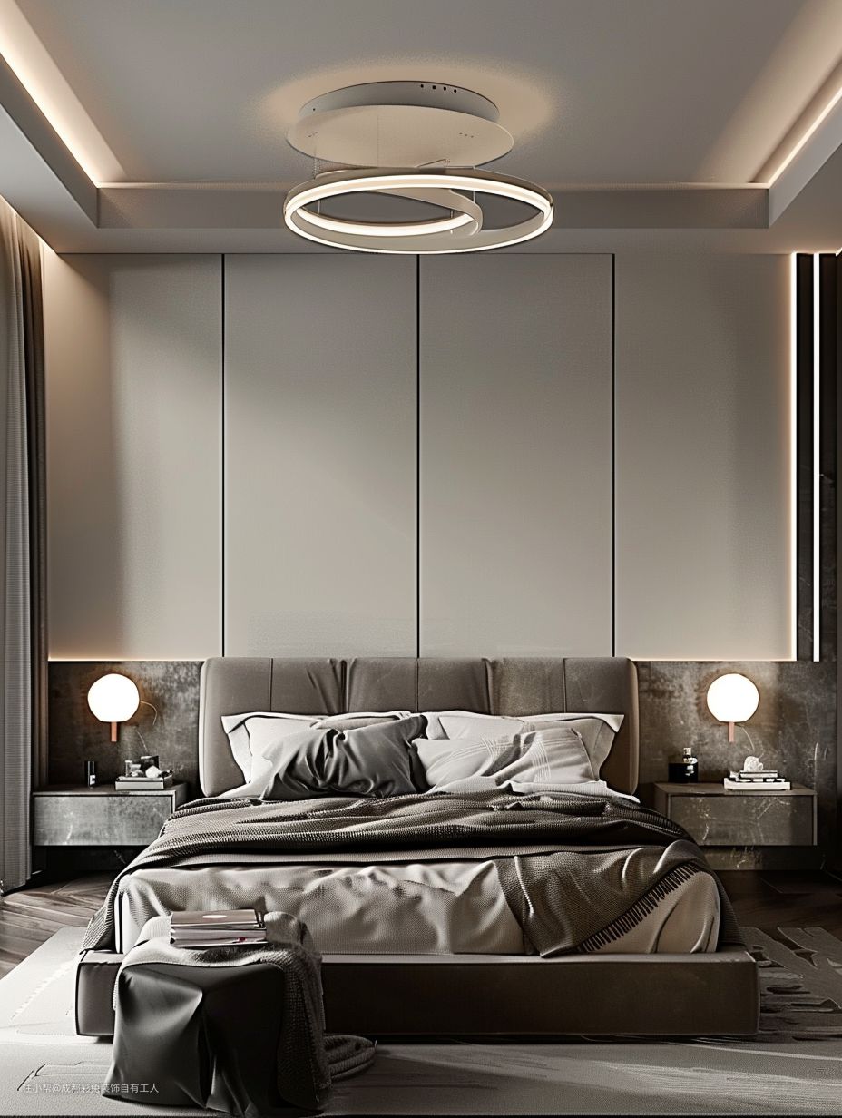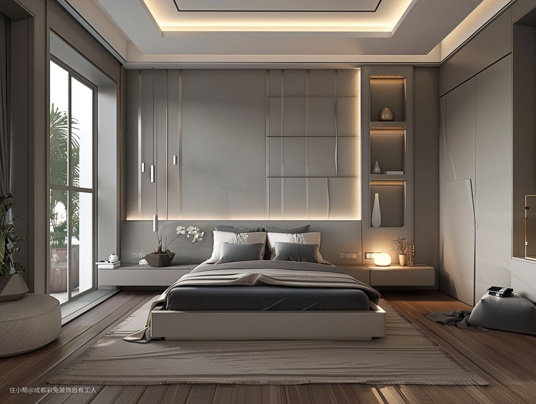 这大回型吊顶,瞅着就大气。那木地板,光脚踩也不凉。床头吊灯加隐藏灯带设计,氛围感嘁哩喀喳就上来了,晚上睡觉都感觉贼拉温馨。