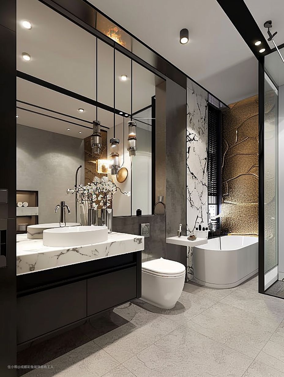 三分离设计,各干各的,互不打扰。吊灯、悬空浴柜,好收拾,还不容易藏污纳垢。