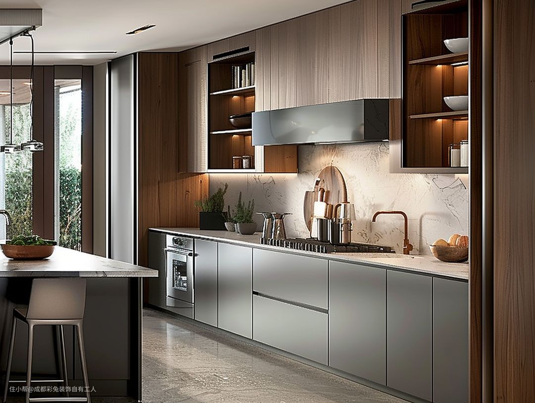 这一字型布局,不占地方还实用。那岛台设计,能当小西厨使,平时整点儿吃喝可方便了。再配上高脚凳,老有感觉了。