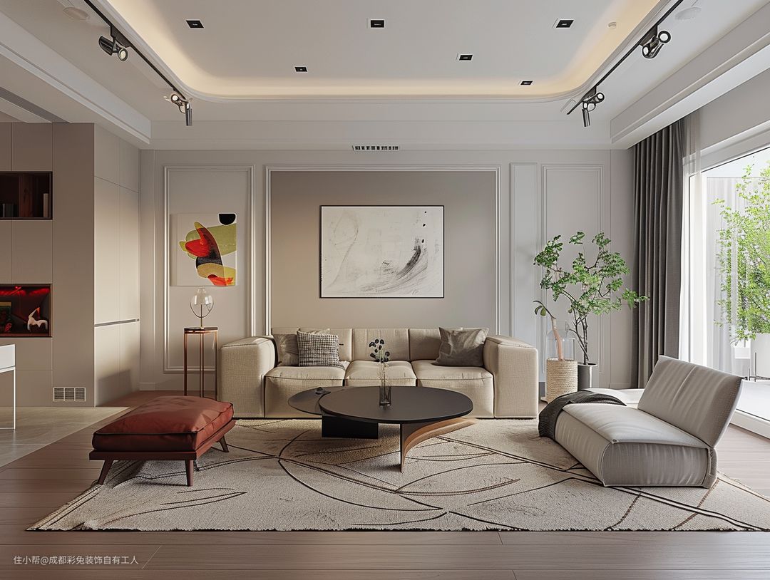 俺们这无主灯设计加上回型吊顶,那叫一个透亮儿!轨道灯再这么一照,亮堂堂的,一点不压层高。那圆形茶几配着单人椅子,贼拉有样儿!