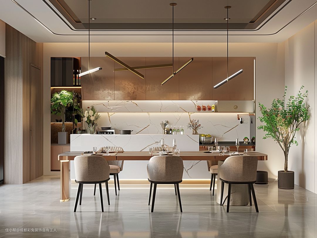 长方形的餐桌椅,能坐不少人呢。摆上点绿植,瞅着就得劲。