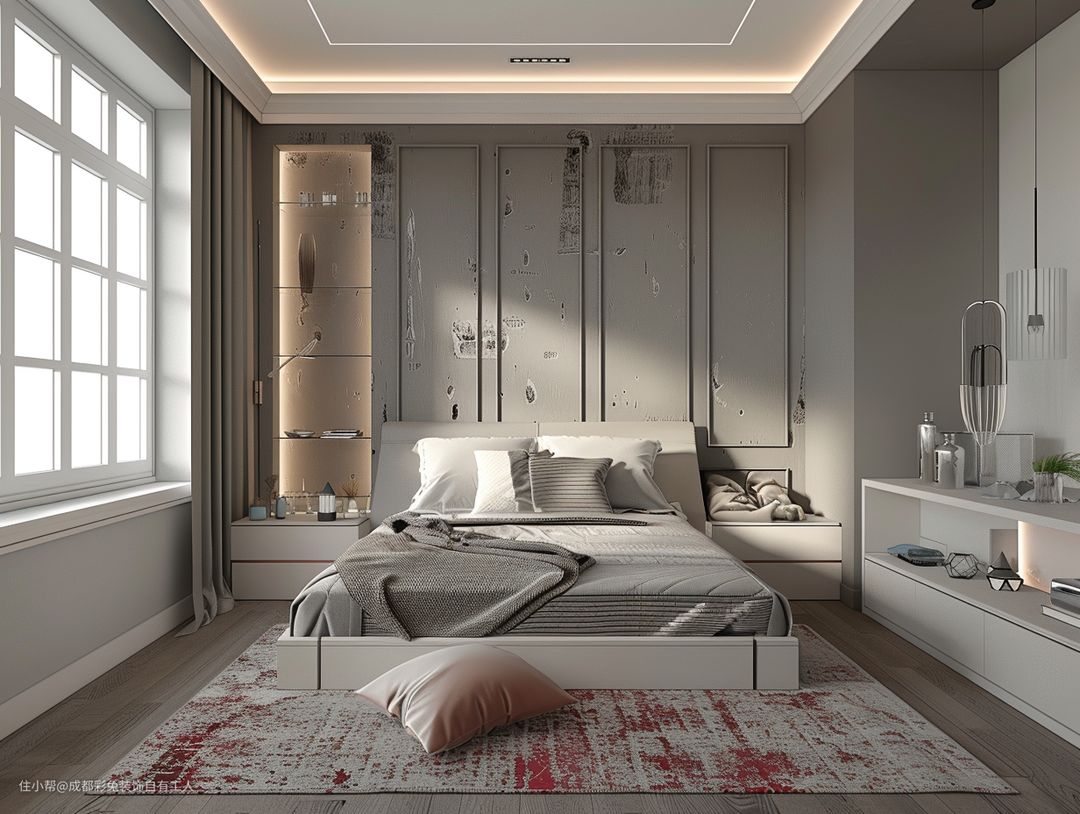 回型吊顶,瞅着就大气。木地板,光脚踩也不凉。床头壁灯、吊灯,照明嘎嘎的。白色格子窗户,瞅着就透亮。