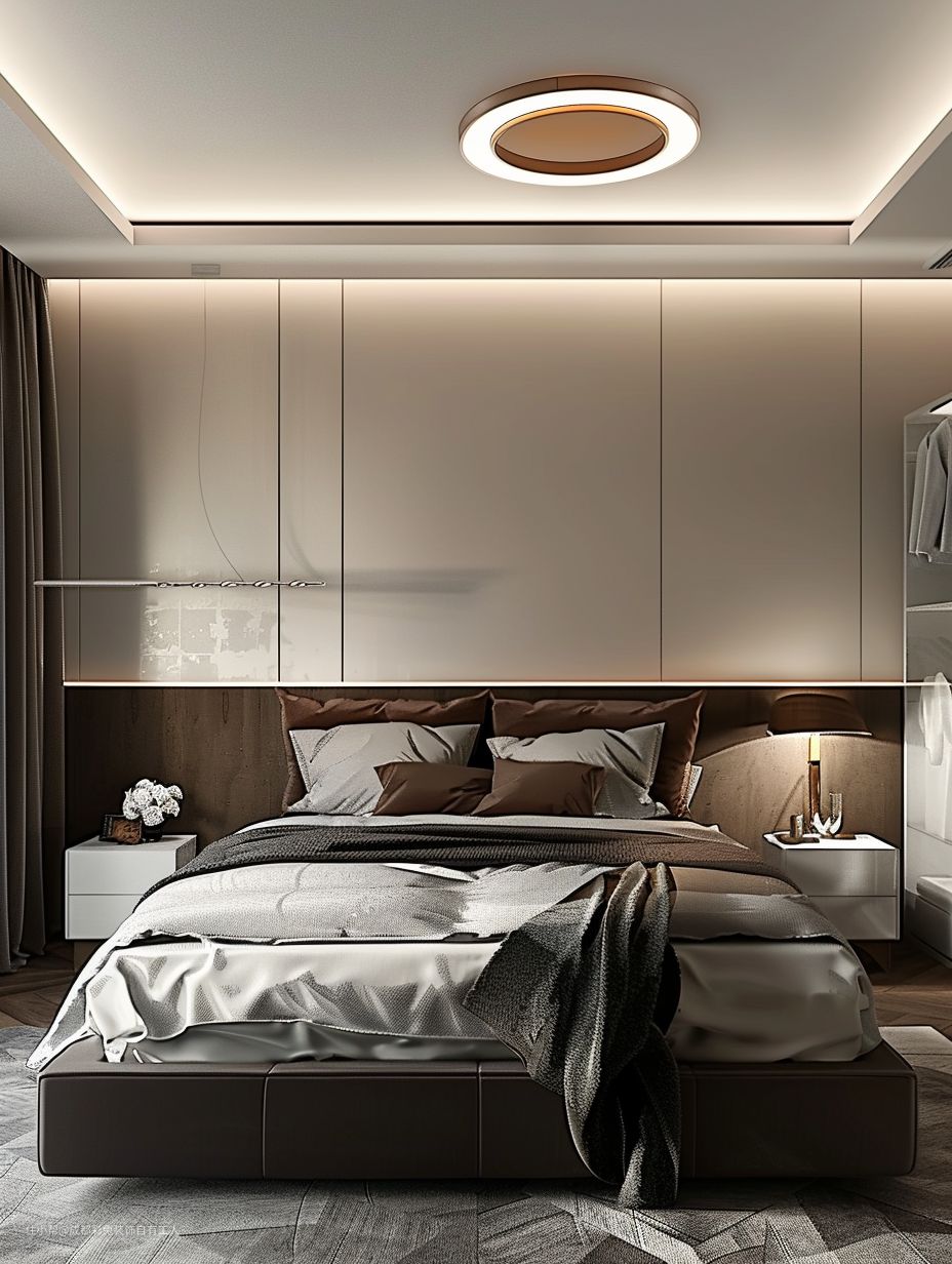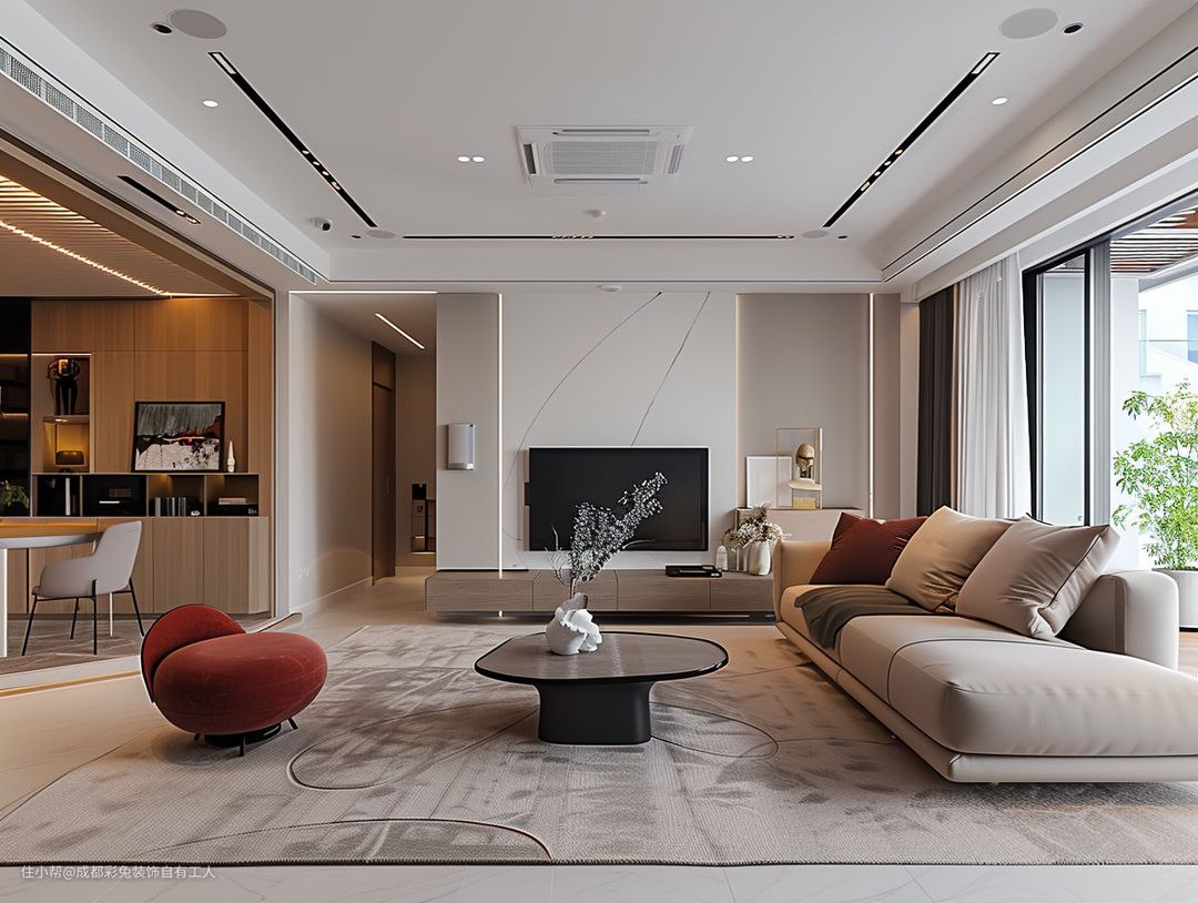 咱这无主灯设计,那家伙老流行了,瞅着就贼拉有档次。再加上这窗帘盒,把窗帘一整,板板正正的。壁挂电视挂墙上,瞅着可得劲了。浅色地毯一铺,光脚踩上去老舒服了。还有这木质餐边柜,能放不老少东西呢。