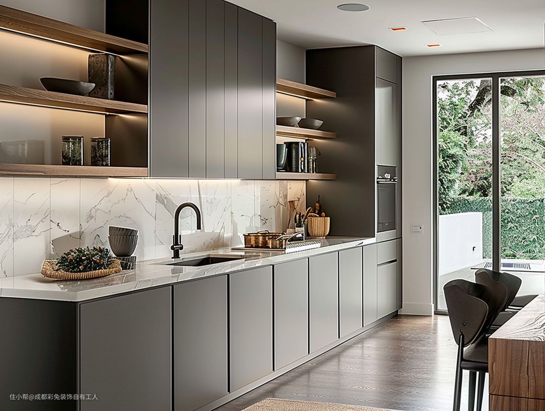 一字型布局,不占地方还实用。无主灯设计,做饭瞅着也清亮。嵌入式电器,不占地方还好看。
