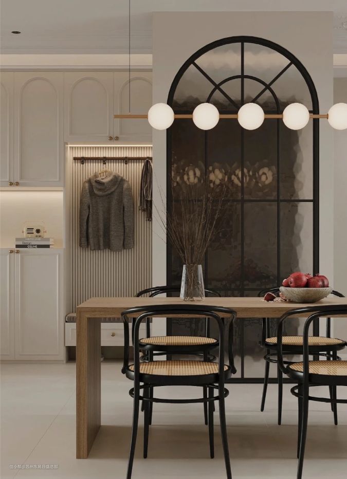 餐厅与玄关之间再设置拱形格子玻璃窗造型的隔断,保证空间流动性与开阔性的同时,也能在开关门的时候保护家的隐私,避免被外人窥视。