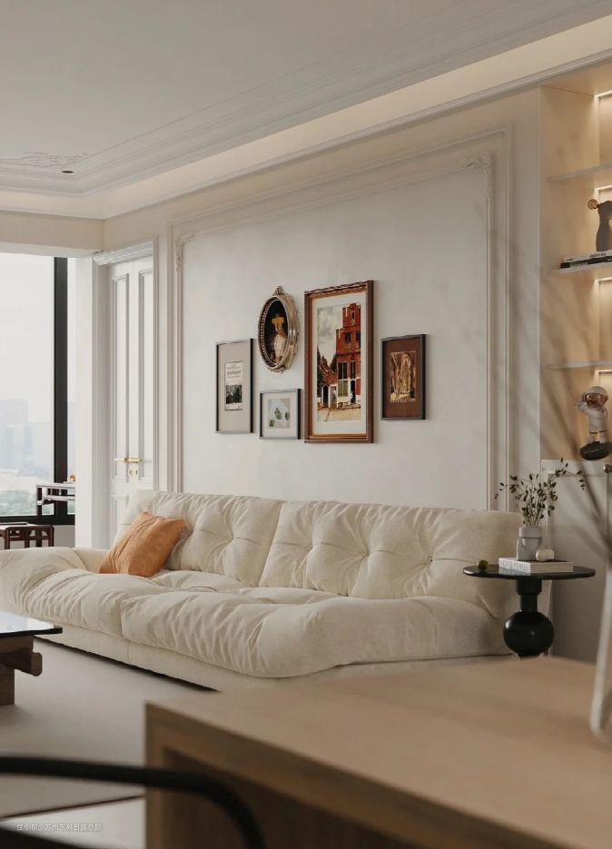 拆除墙体后,尽可能地释放客厅空间,与餐厅和阳台形成一体。奶油色调+木色进行点缀,让整个家都笼罩着一层温柔的滤镜