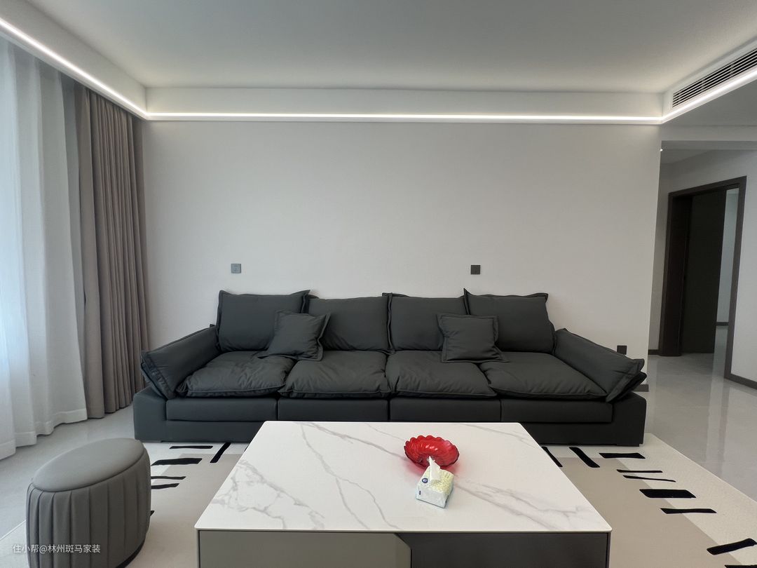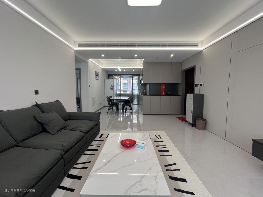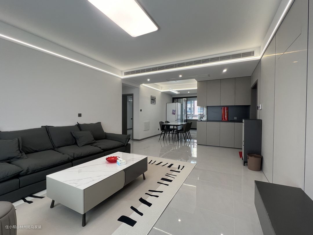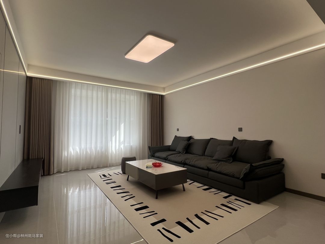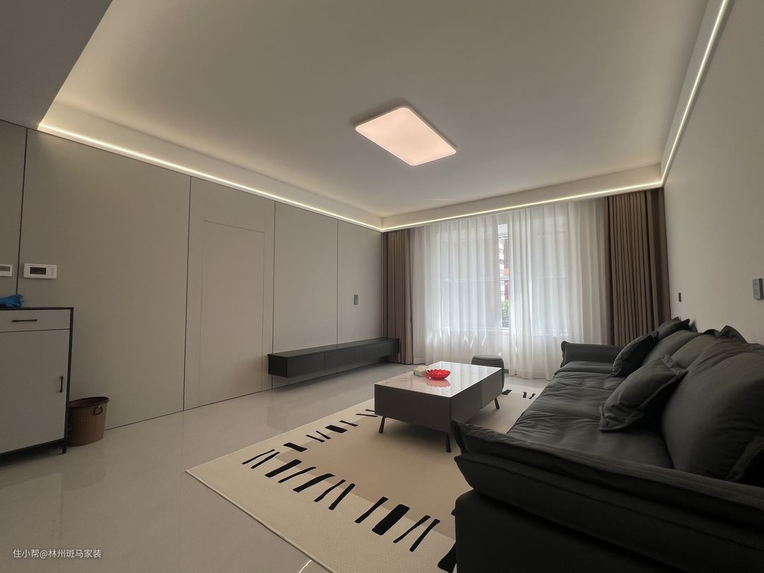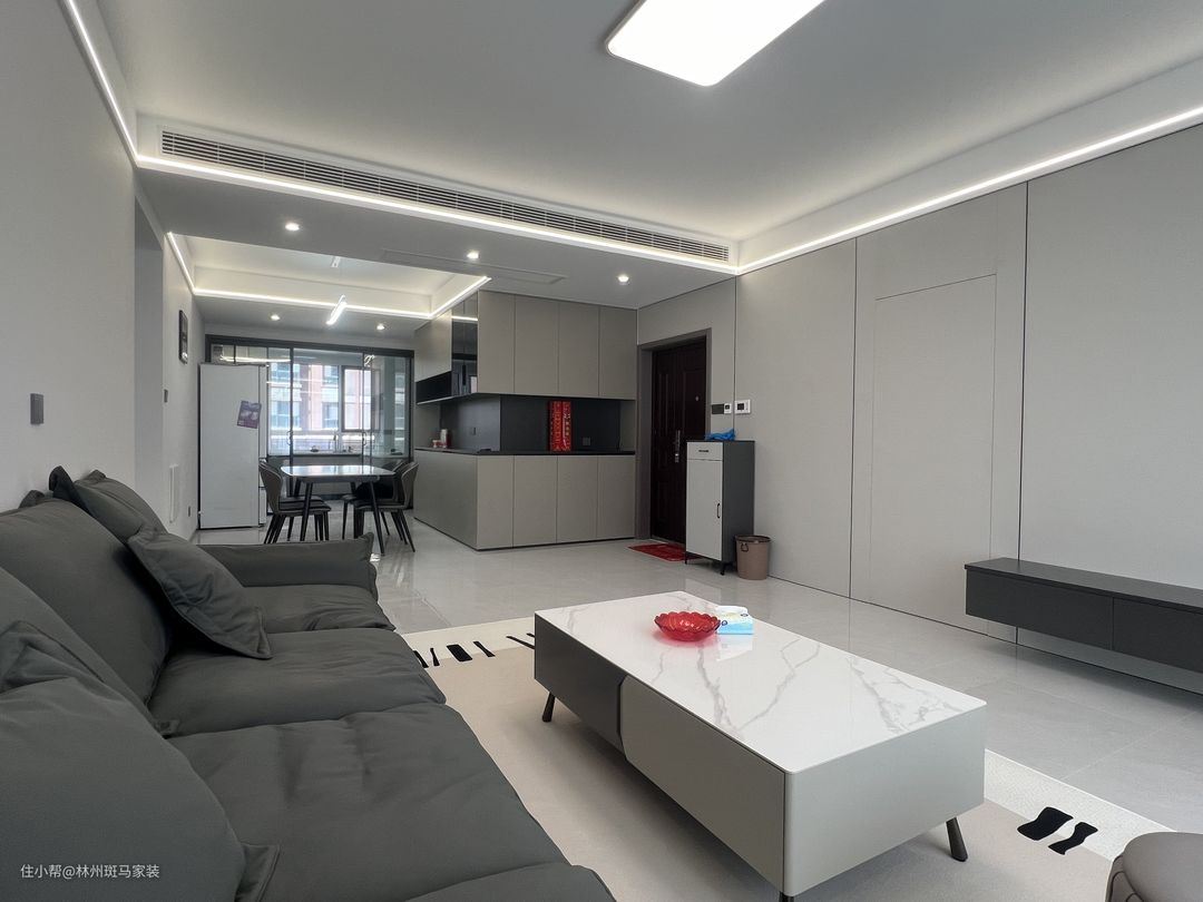客厅空间以现代时尚简约的风格为主调,营造出整洁,舒适的生活氛围,灰色墙板将隐形门完美嵌入,灰色的沙发和墙板颜色相呼应,白色茶几搭配地毯为空间增添了一份自然和温暖。