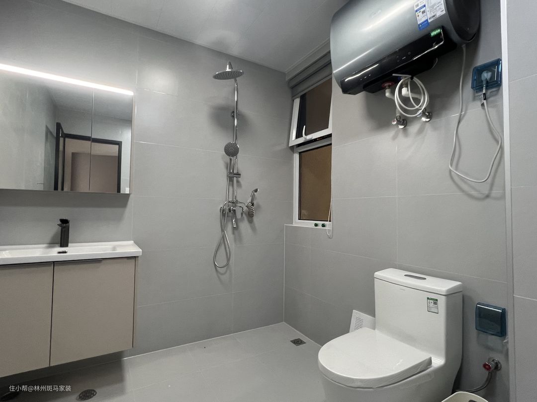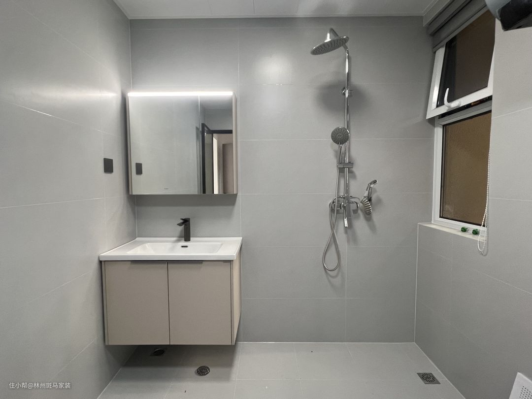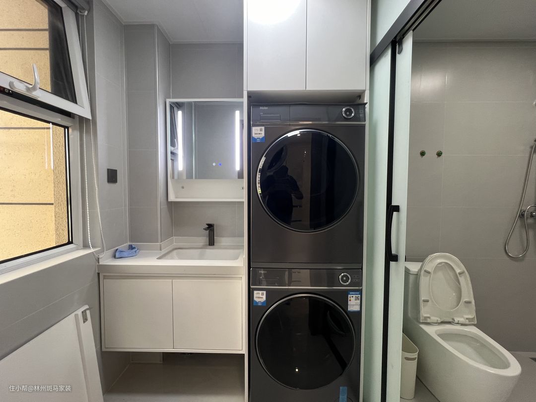 卫生间做干湿分离设计,业主对生活要求较高,做了上烘下洗的洗衣机柜,简单的镜柜,增加收纳空间,实用又好看。