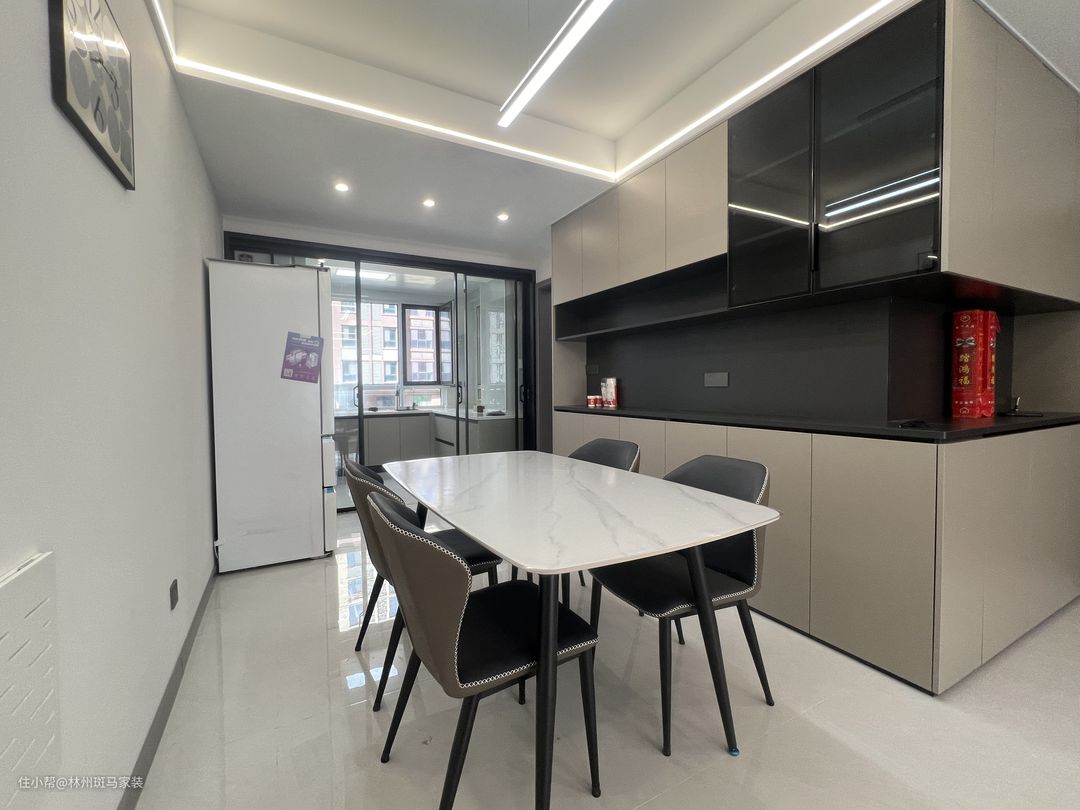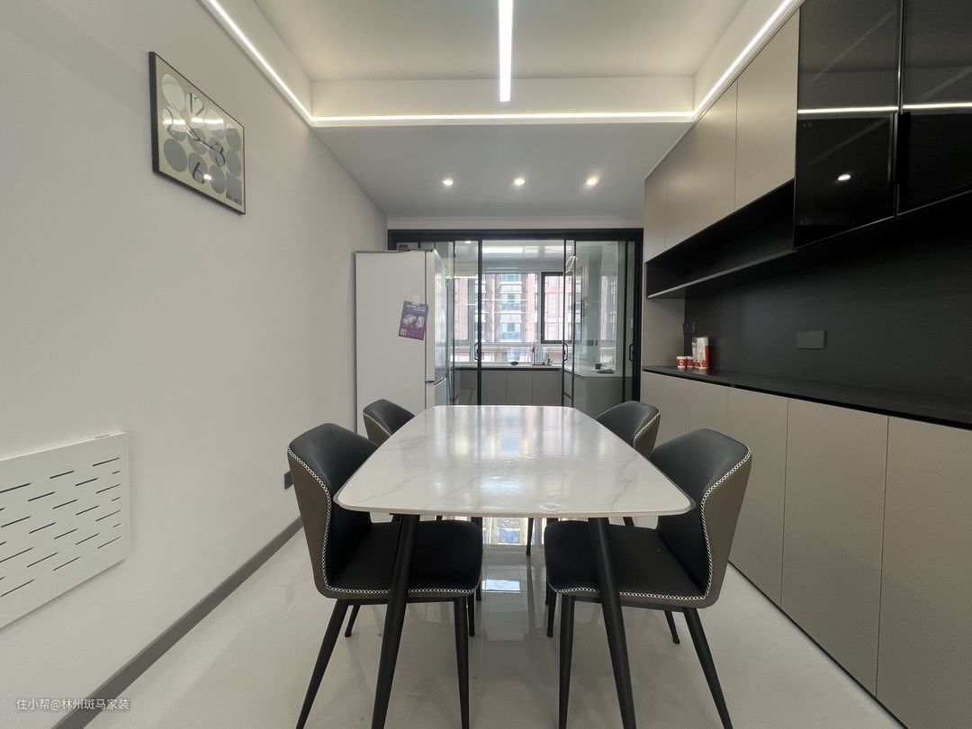 餐厅整体延续了客厅的设计风格,入户做了鞋柜并设置了开放格,鞋柜延伸过来做了餐边柜的设计,预留开放格,方便物品收纳,营造一个干净整洁的入户区域。岩板餐桌与灰色皮质餐椅相搭配,加上氛围灯带的衬托,给人一种满满的仪式感。