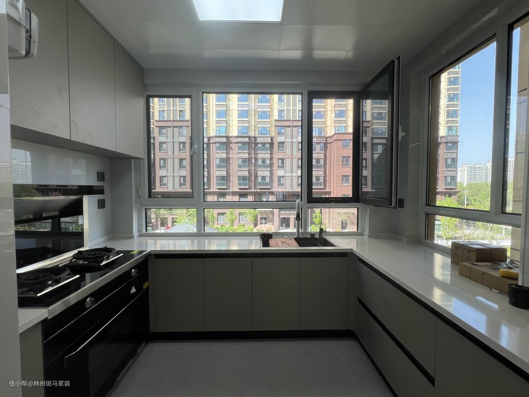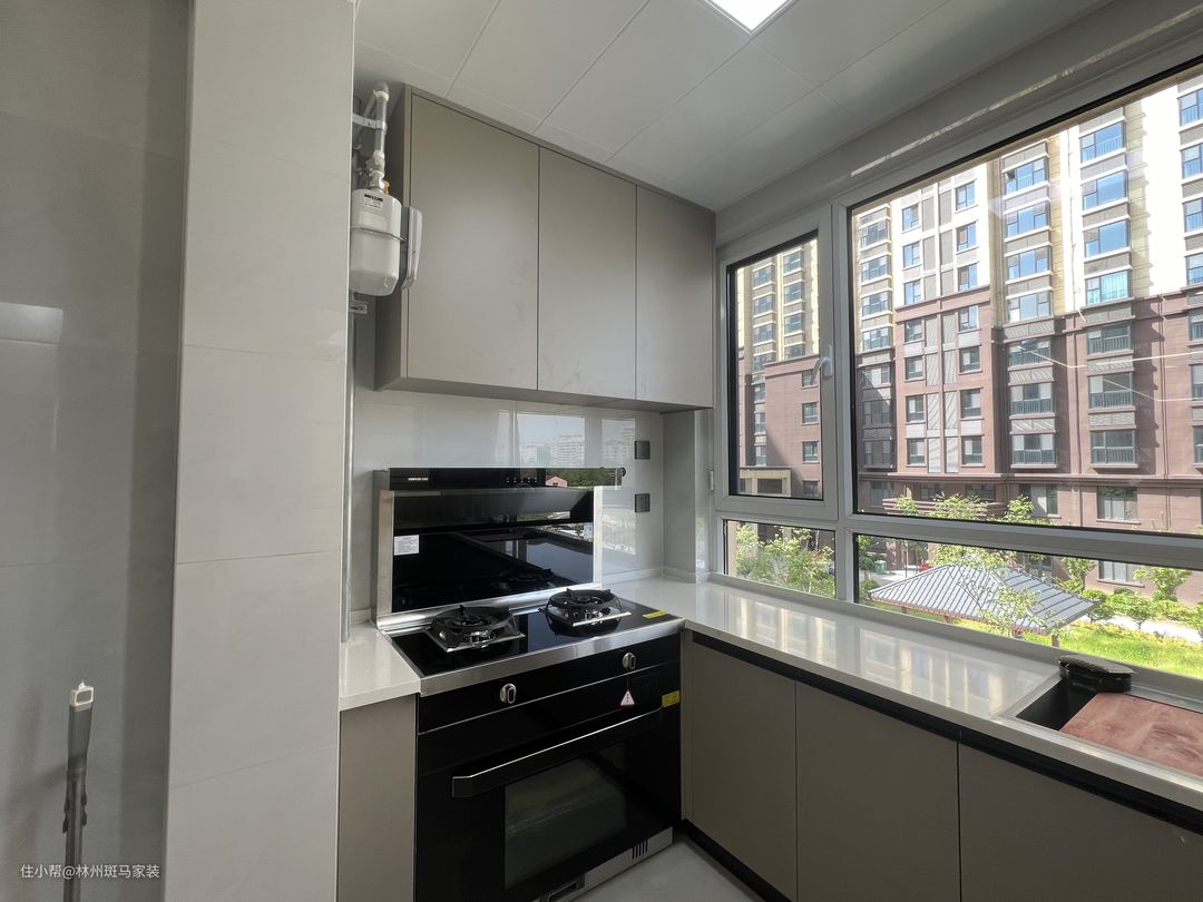 厨房整体向外扩,占用了北阳台的位置,整体做了U型橱柜,满足了洗切炒的黄金动线,灰色橱柜门板,搭配黑色集成灶和灰色墙砖,整个厨房看起来更加简洁大气。