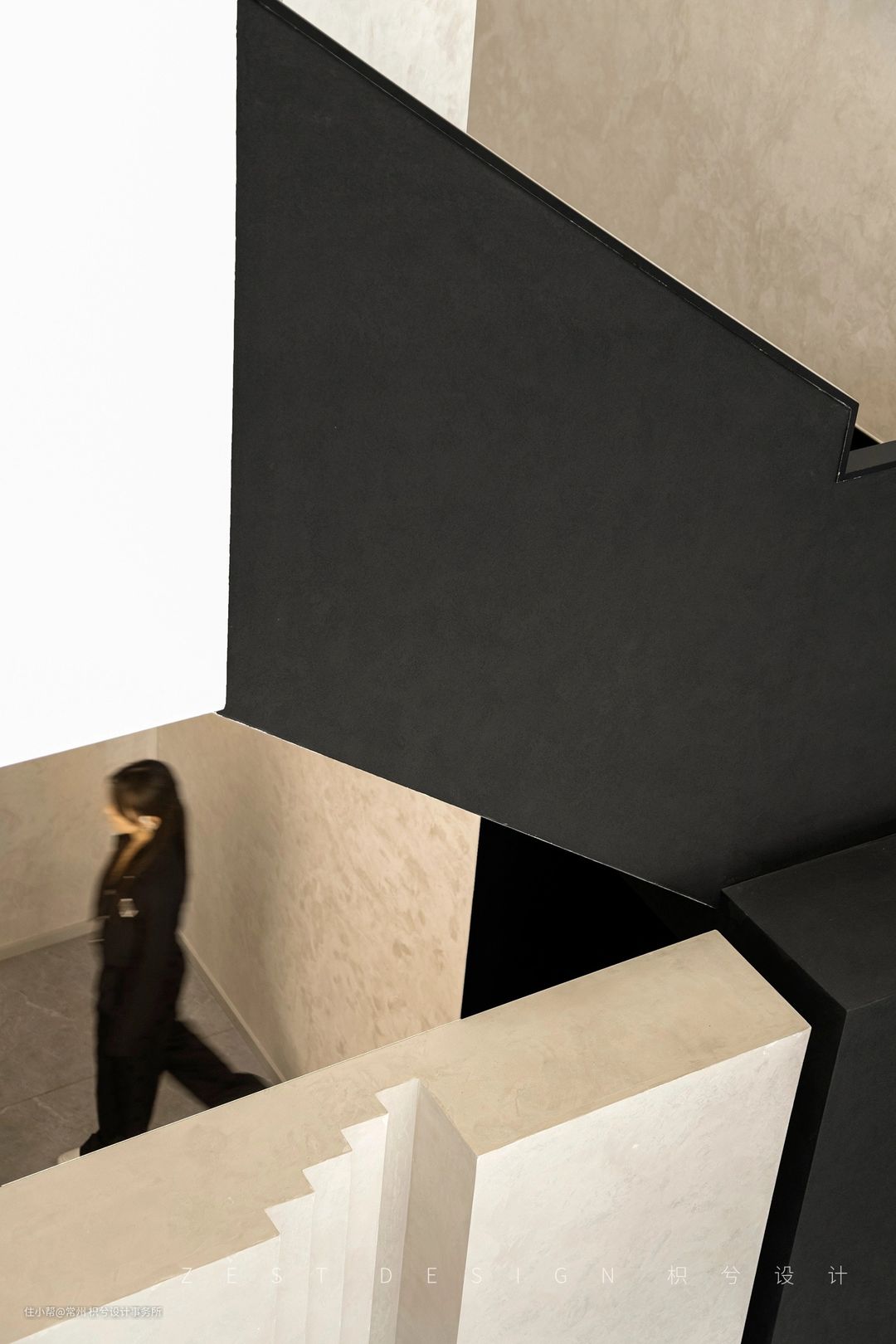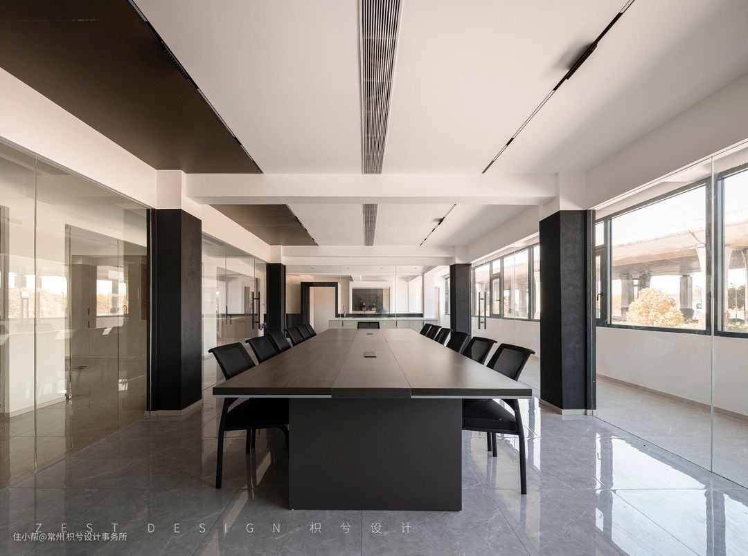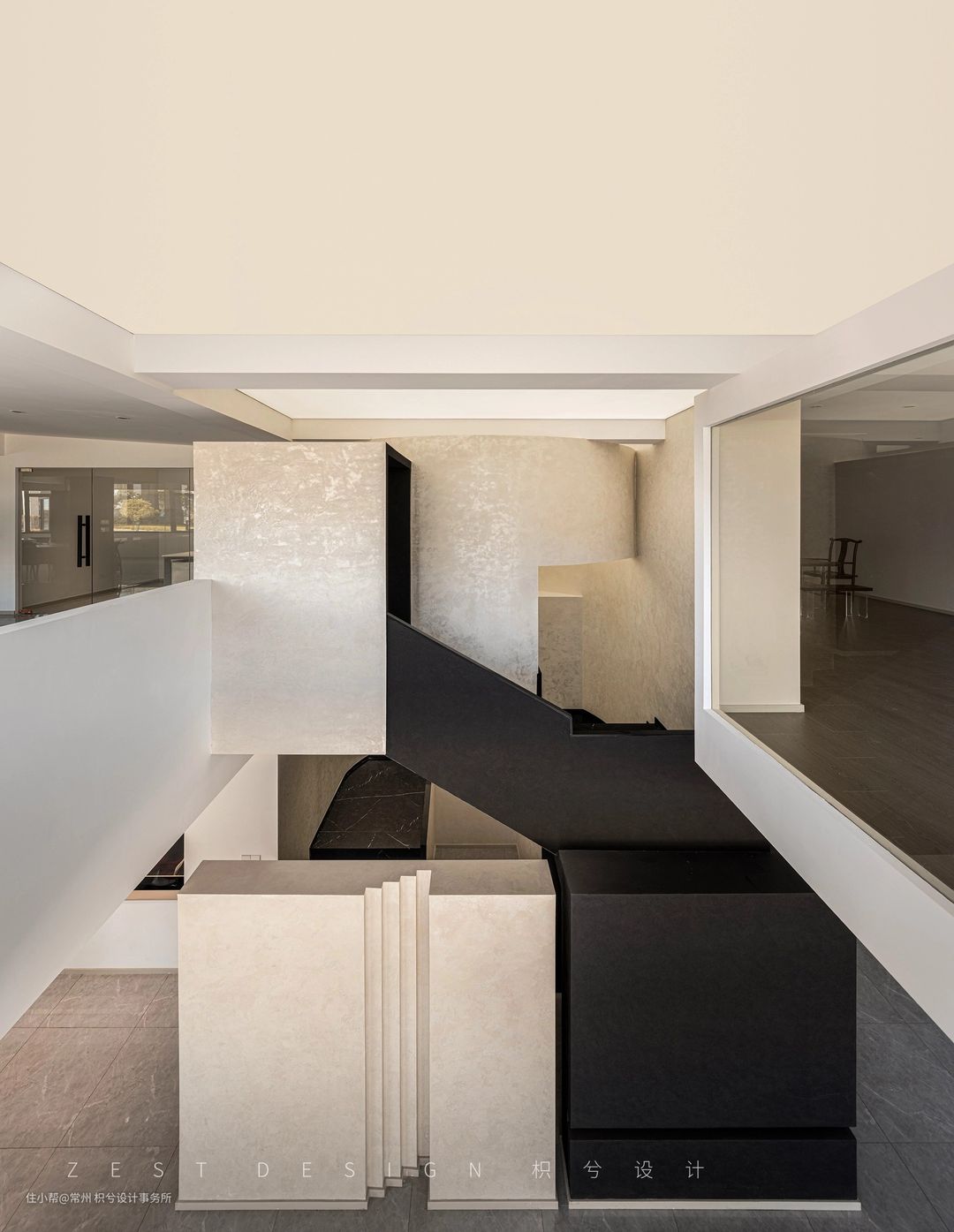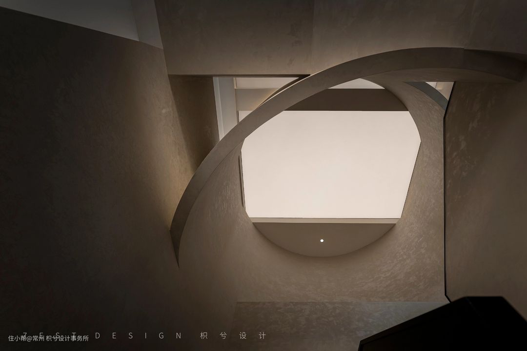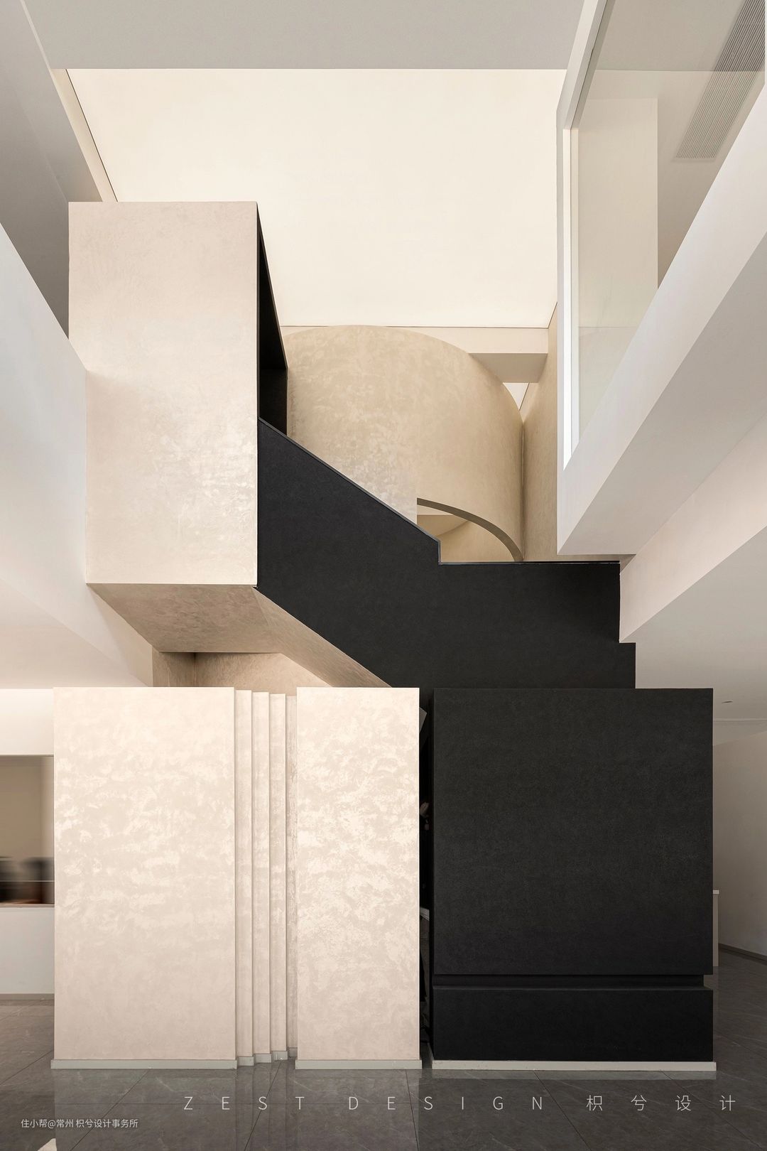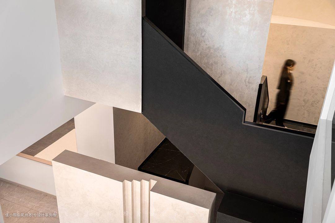 我们从中间区域分开作为两个体块进行构思,利用楼梯部分将两个区域连接,既能相互关联又具备独立性。在公区位置置入回型楼梯,建筑外面运用黑色的材质去区分上下层的关系,右侧置入一个圆形柱子让整体看上去更加协调和丰富,从远处看就像是在回型楼梯穿插了一个“油漆桶”,更具有象征意义。在楼梯下方设置一个方形盒子,通过一个小的方盒子进入楼梯内部的圆形空间,再通过圆形空间进入公区的大型方盒子,通过几个不同的形状进入我们的办公空间,形成一个丰富并具备趣味的空间动线。门头也运用了同样的手法呼应悬空造型,形成变成一个整体,并在建筑外面运用黑色的材质去区分上下层的关系,右侧置入一个圆形柱子让整体看上去更加协调和丰富。