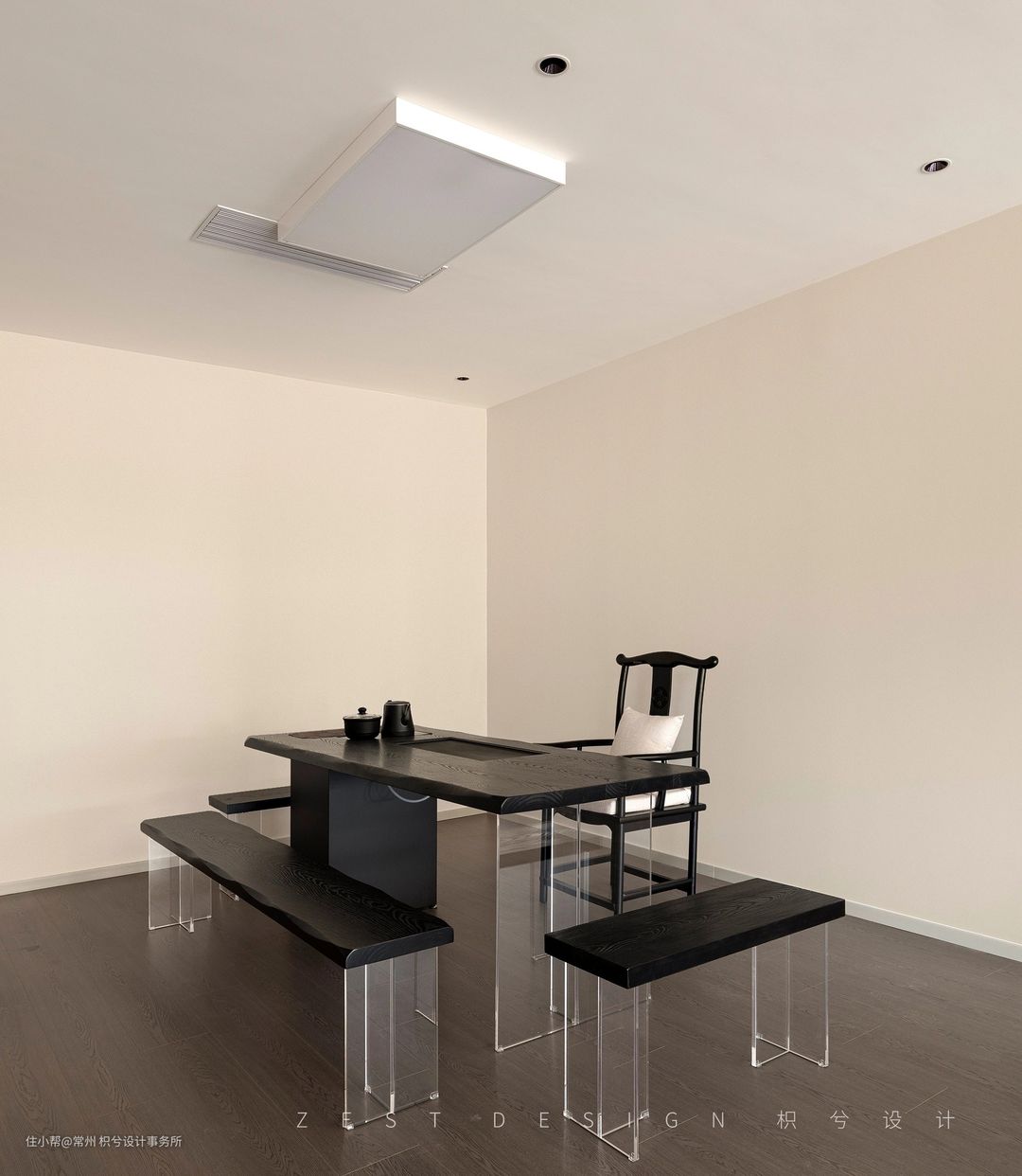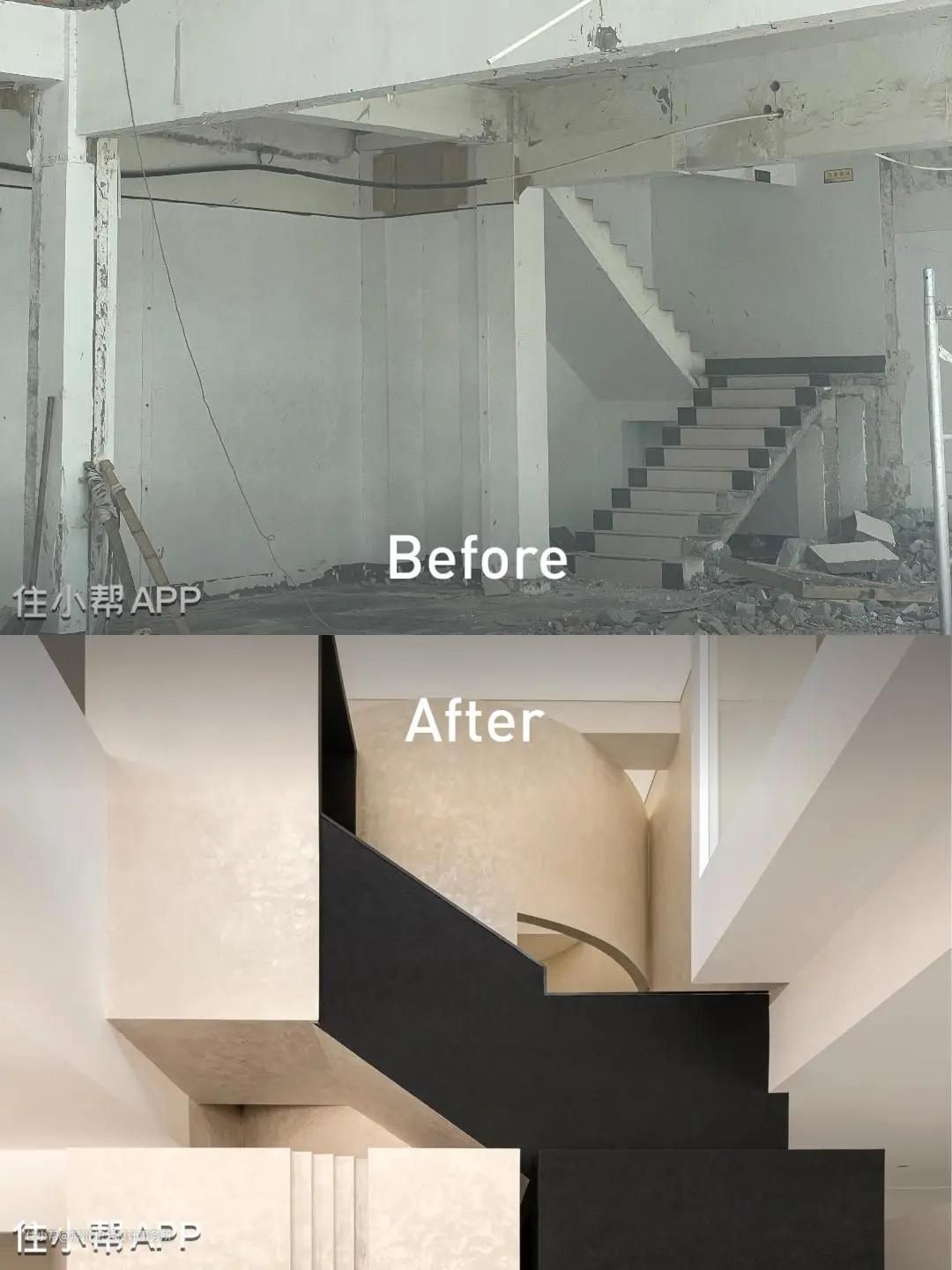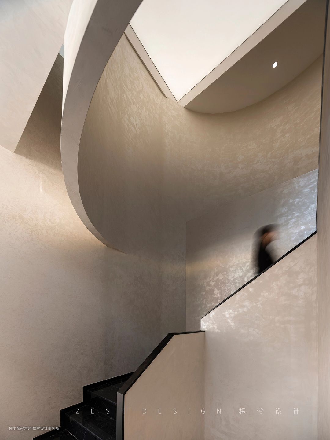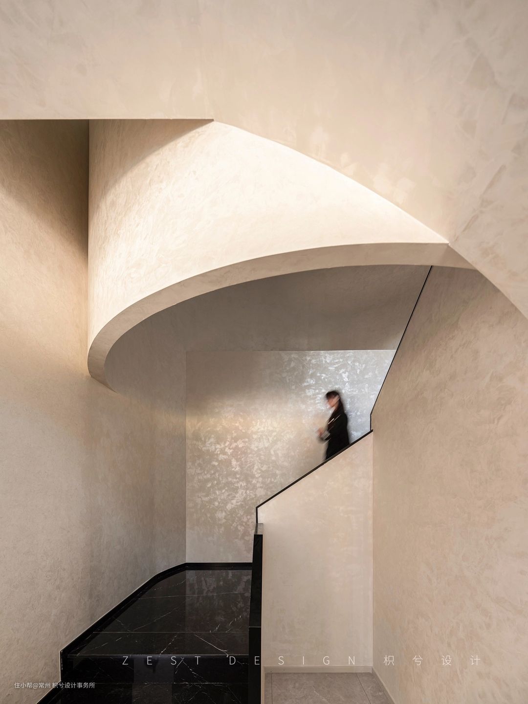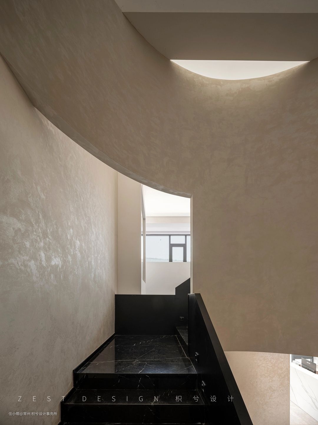 我们从中间区域分开作为两个体块进行构思,利用楼梯部分将两个区域连接,既能相互关联又具备独立性。在公区位置置入回型楼梯,建筑外面运用黑色的材质去区分上下层的关系,右侧置入一个圆形柱子让整体看上去更加协调和丰富,从远处看就像是在回型楼梯穿插了一个“油漆桶”,更具有象征意义。在楼梯下方设置一个方形盒子,通过一个小的方盒子进入楼梯内部的圆形空间,再通过圆形空间进入公区的大型方盒子,通过几个不同的形状进入我们的办公空间,形成一个丰富并具备趣味的空间动线。门头也运用了同样的手法呼应悬空造型,形成变成一个整体,并在建筑外面运用黑色的材质去区分上下层的关系,右侧置入一个圆形柱子让整体看上去更加协调和丰富。