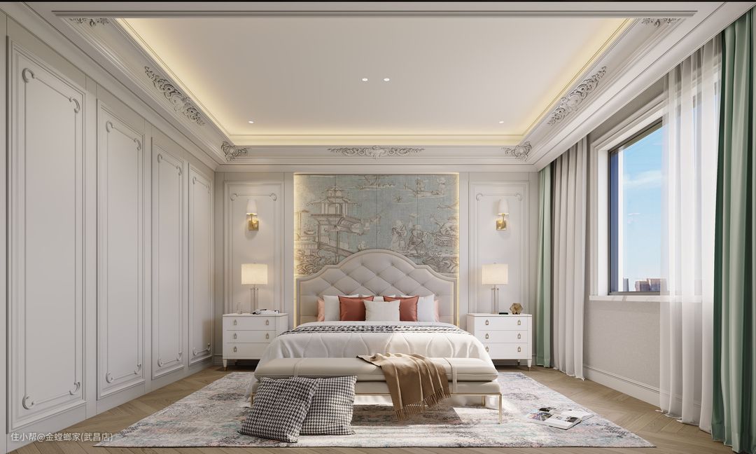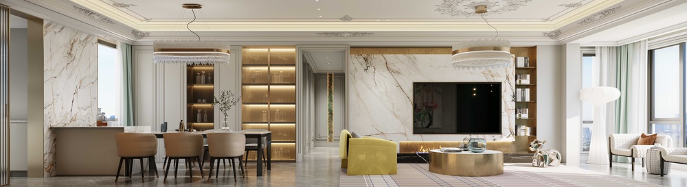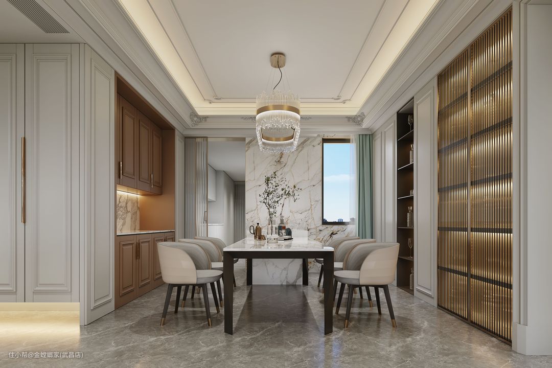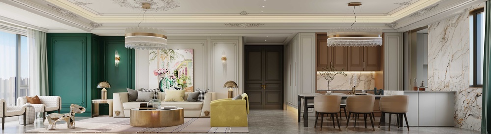 整体为法式轻奢风格,将传统的法式风格进行简化,金属材质多层次在空间中使用以及局部跳色的搭配,塑造出现代与古典和谐的氛围