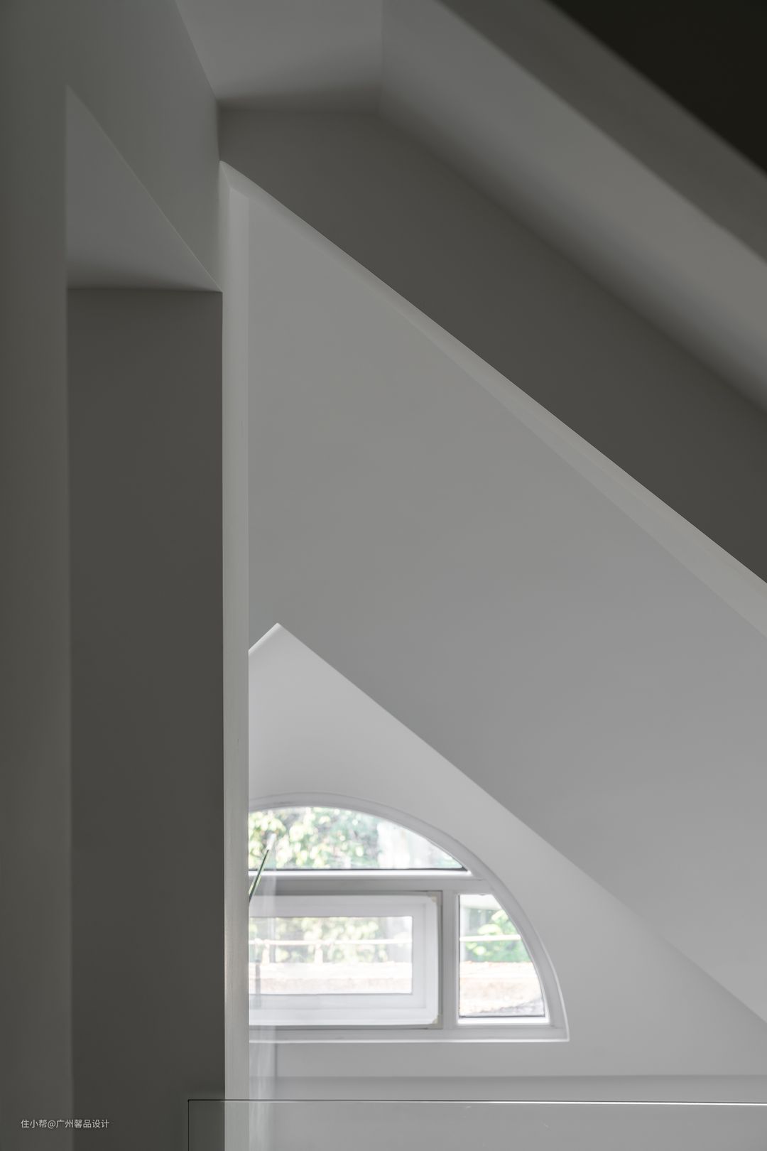 实木踏步楼梯,打破传统扶手形式,利用鞋柜做隔断,给楼梯提供安全感,考虑到实际使用时,会有扶墙助力,特意在石膏板隔墙上开了一条扶手槽。 调整楼梯位置后,得到了一处正常通行且相对方正的空间,用做双人多功能书房。坡面屋顶,建筑本身是有很多矮小空间,人无法正常通行,空间利用率低,设计利用白色移门,与白墙完美融合,隐形收纳的设计理念,达到实用,美观的双重效果。 二楼采用超白玻璃栏杆,不外加金属扶手,通过光的折射,放大整个坡面空间,营造一种空间视觉通透感。