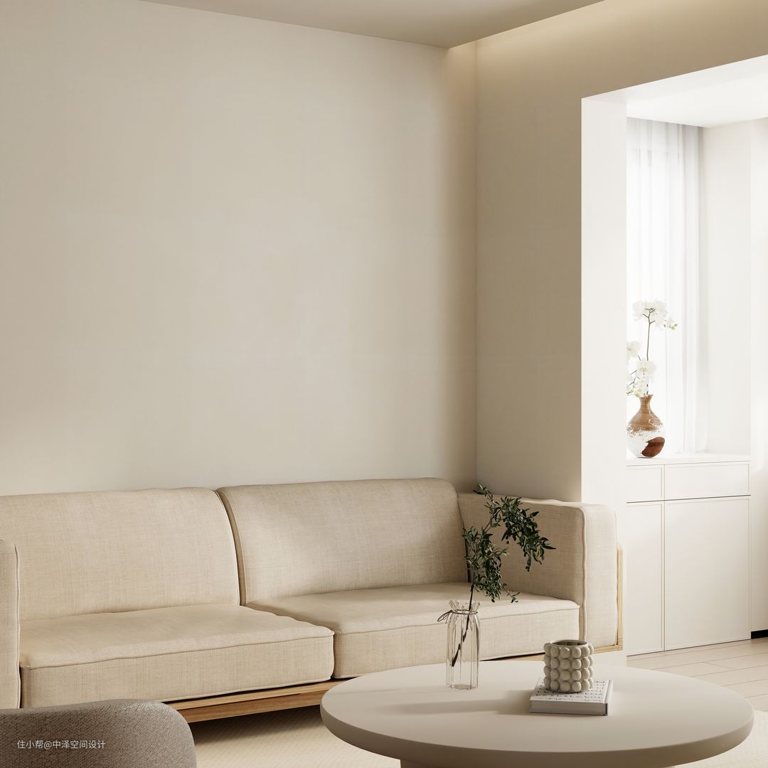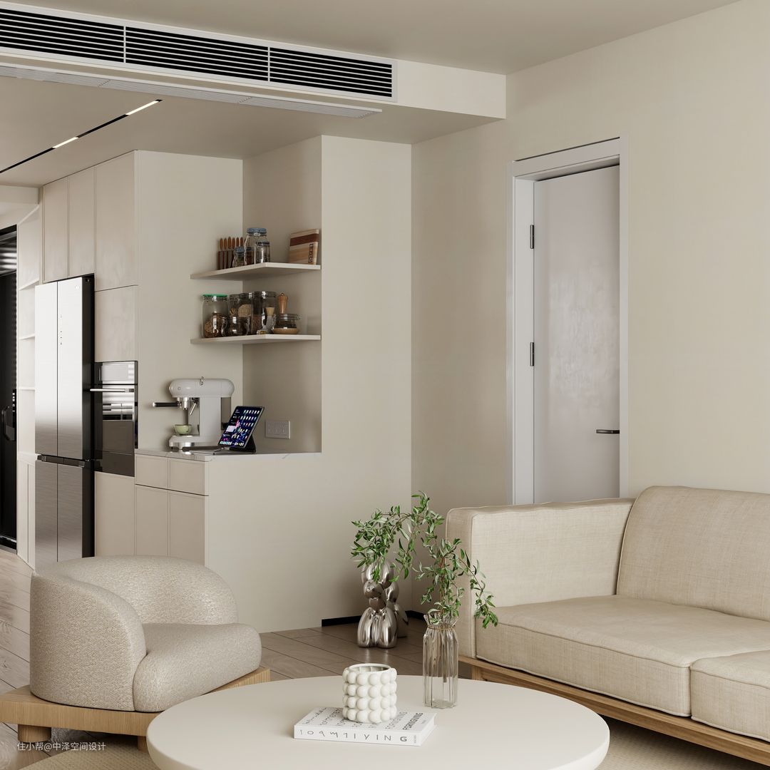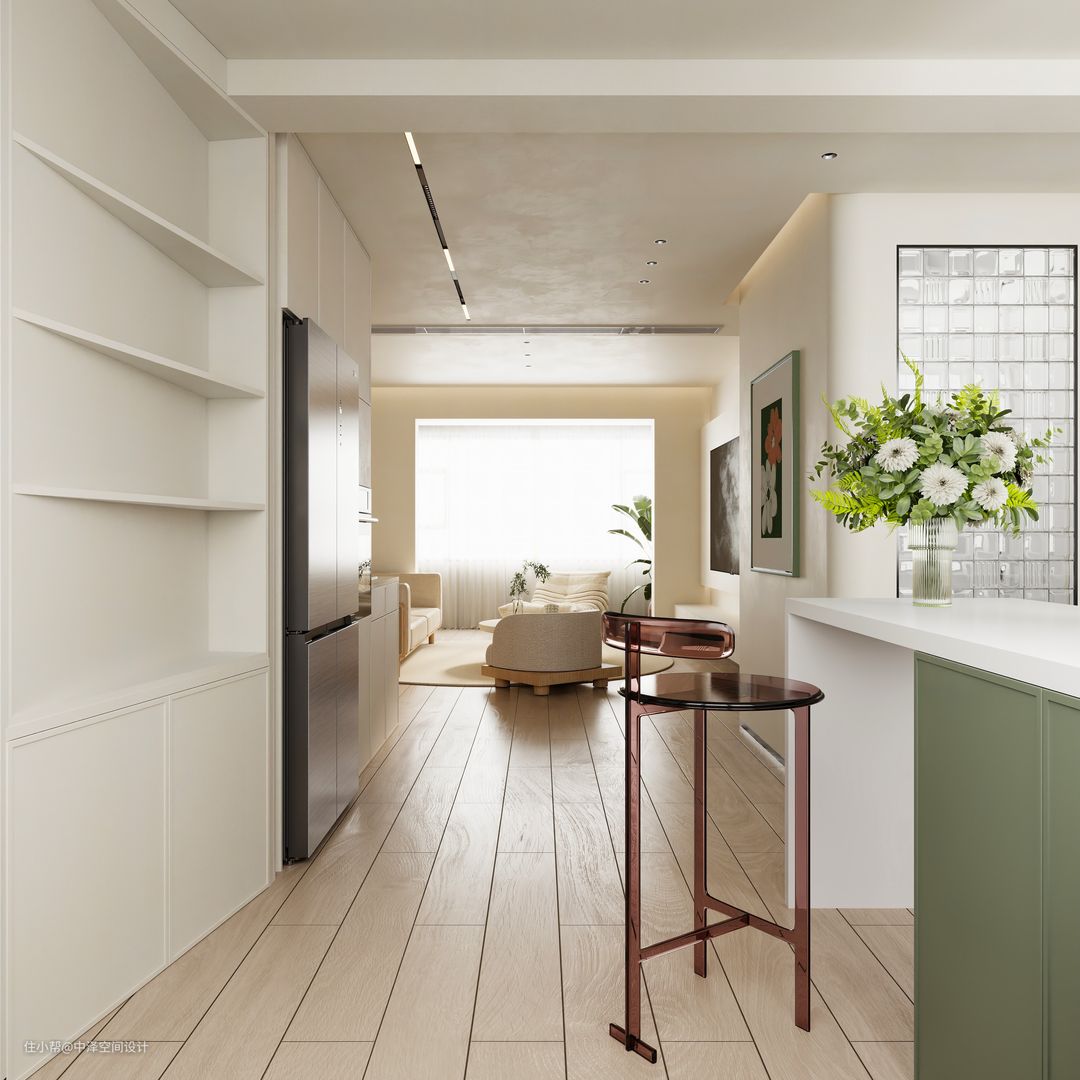 在前面我们讲到斜角鞋柜 以及小吧台代替餐桌形式 这个空间展示了 整体配色以抹茶绿跟暖白为主