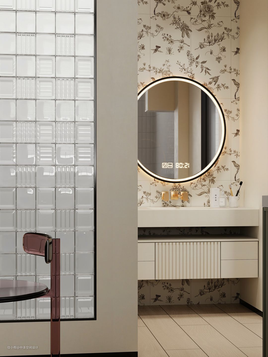 干区铺贴的小花砖 做了悬空浴室柜 在视觉效果上更显大
