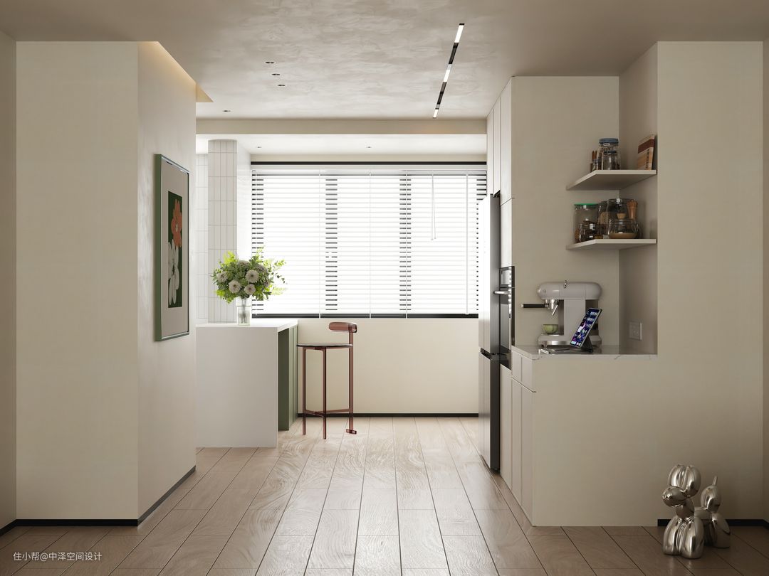 过道较窄 墙面放置了一副清新的画 顶上做了一条灯带 对面餐边柜可以偶尔放置一些面包机 咖啡机 休息时间泡泡咖啡 吃吃点心 简直不要太惬意