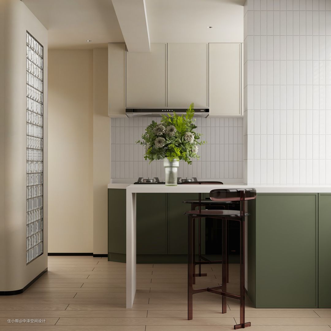 吧台跟厨房区域在一块 就不分开讲了 配色还是以墨绿与暖白为主 搭配清新的小长块砖 更加耐看