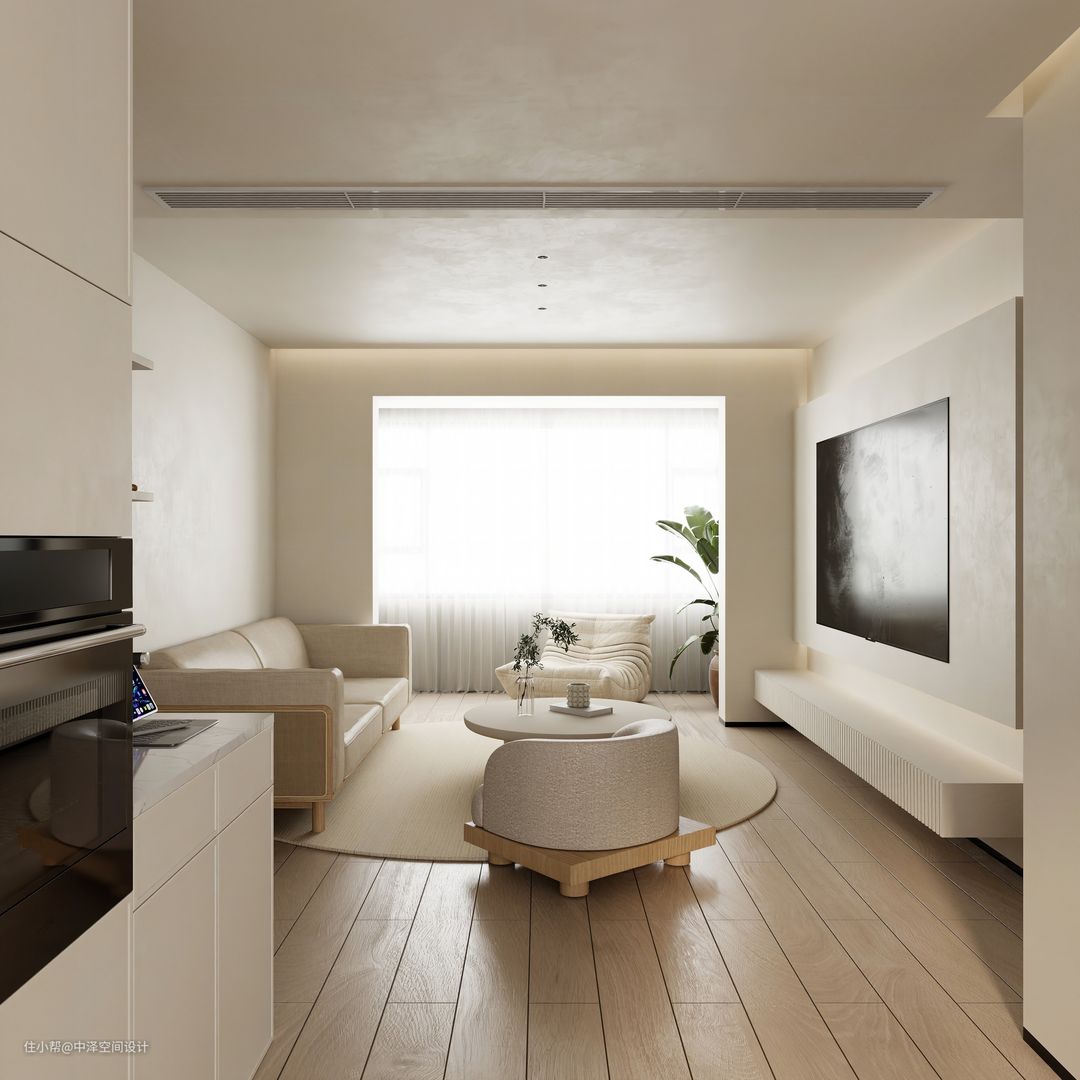 全屋采用中央空调 地板通铺 客厅电视柜做的悬浮的 更显轻快 沙发跟单椅也是带点原木元素 吊顶上做了一根灯带 效果上也是不错