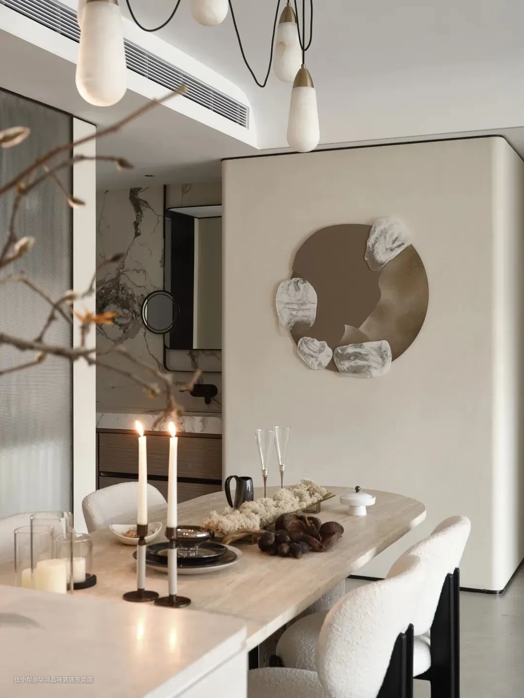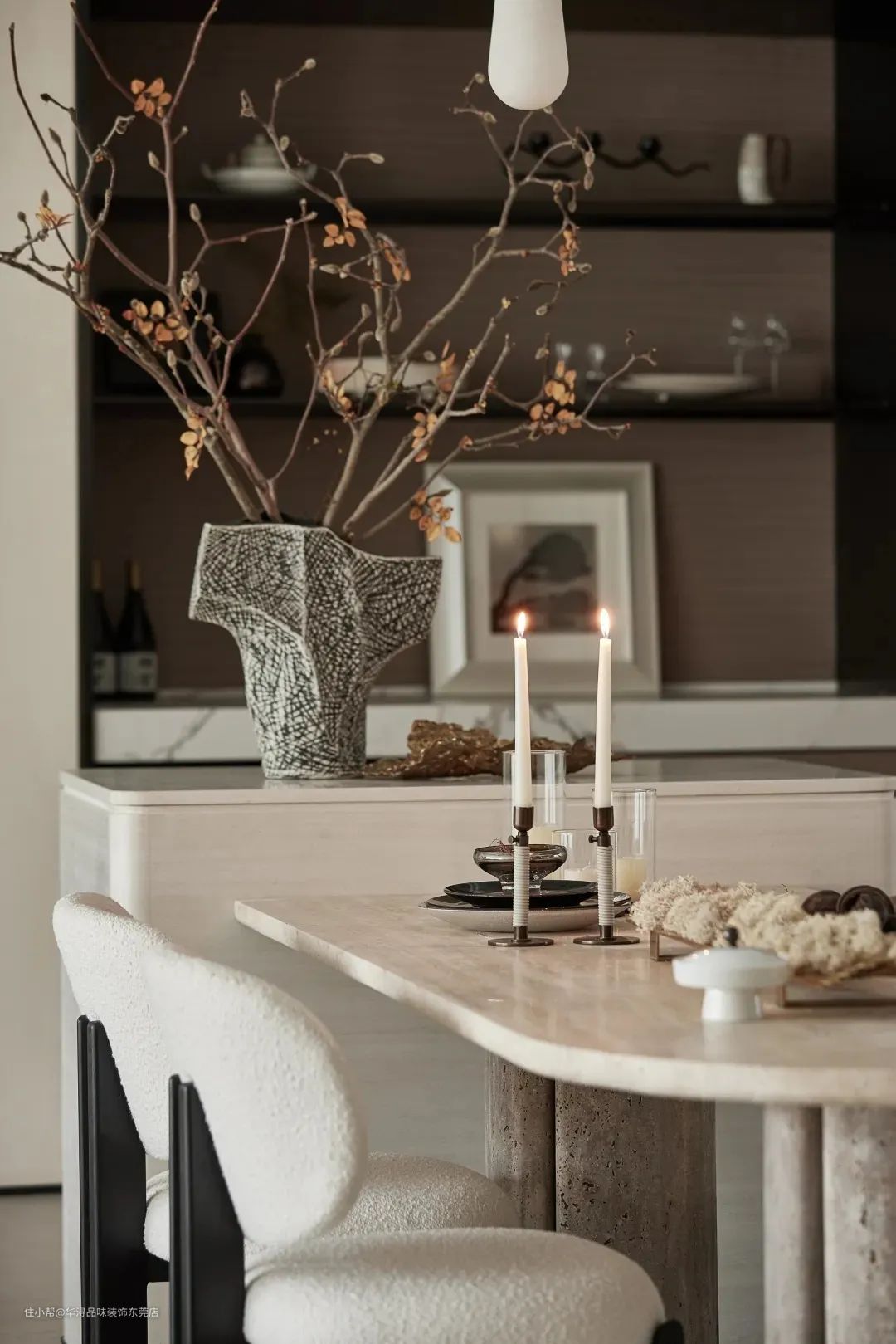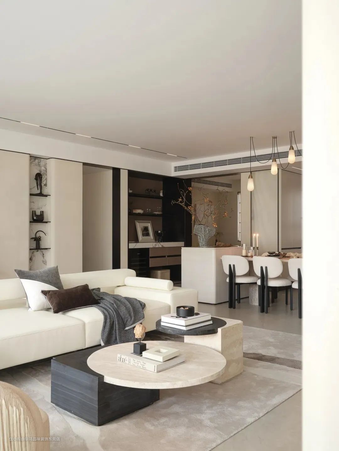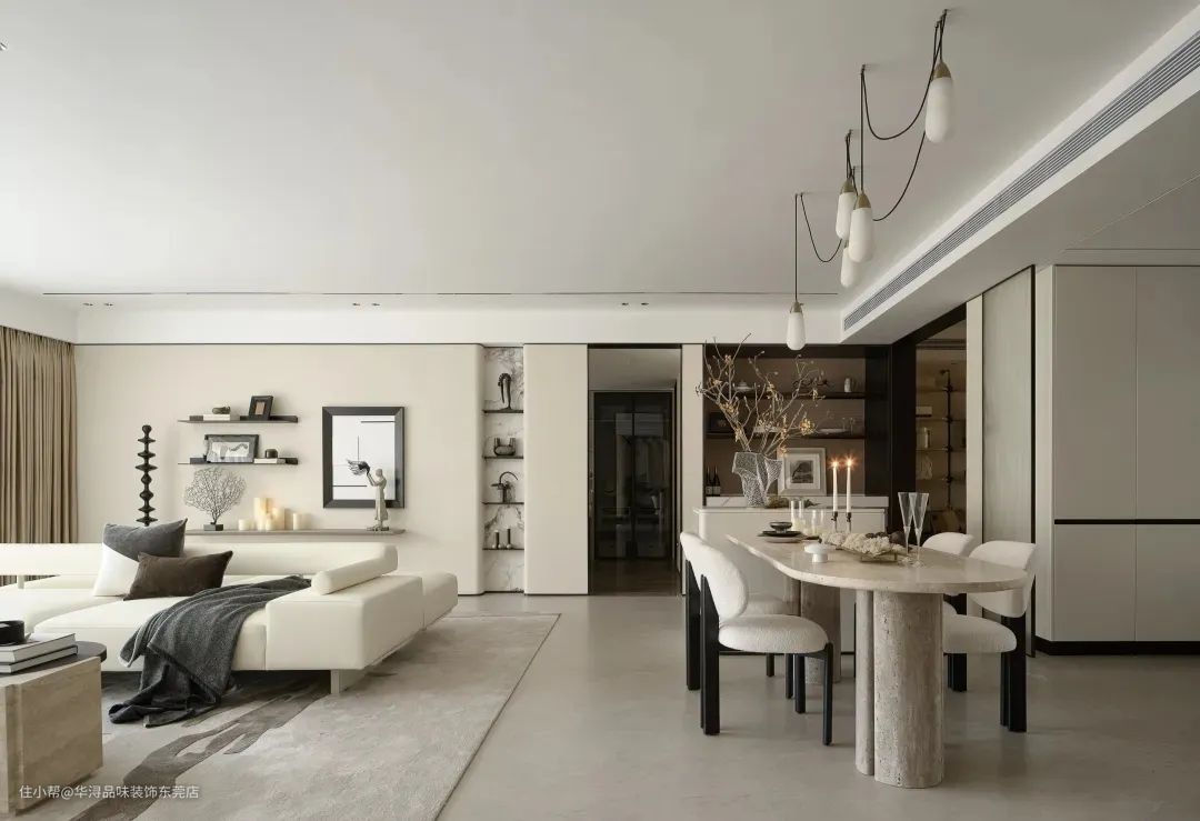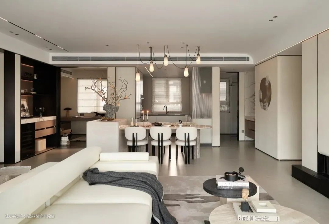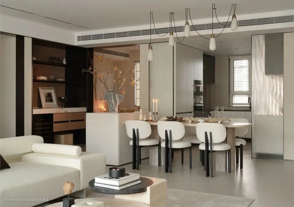 餐厅区域则更注重温馨与氛围的营造。我们选用了导台式餐桌增加家人互动及烹饪乐趣。餐椅的设计则注重舒适性和美观性的平衡,让人在用餐时能够感受到家的温暖。此外,我们还设置了吊灯和装饰画等细节元素,为餐厅增添了浪漫与雅致的气息。 在功能划分上,我们充分考虑了家庭成员间的交流与沟通。客厅与餐厅之间并没有明显的隔断,而是采用了流畅的过渡设计,使得两个空间能够相互借景,形成一种无界的交流氛围。这样的设计不仅让空间更加通透,也方便了家庭成员之间的互动与交流。