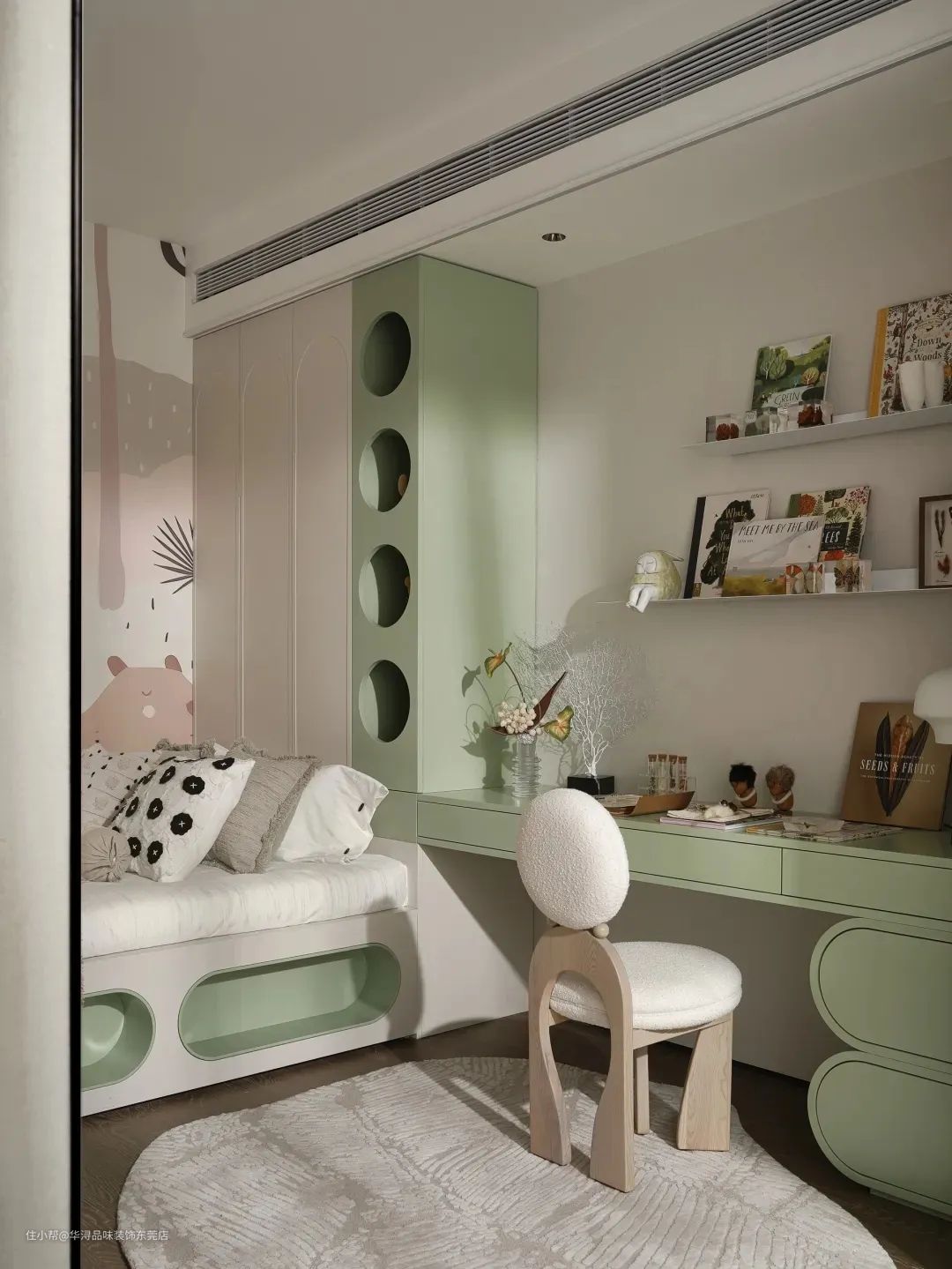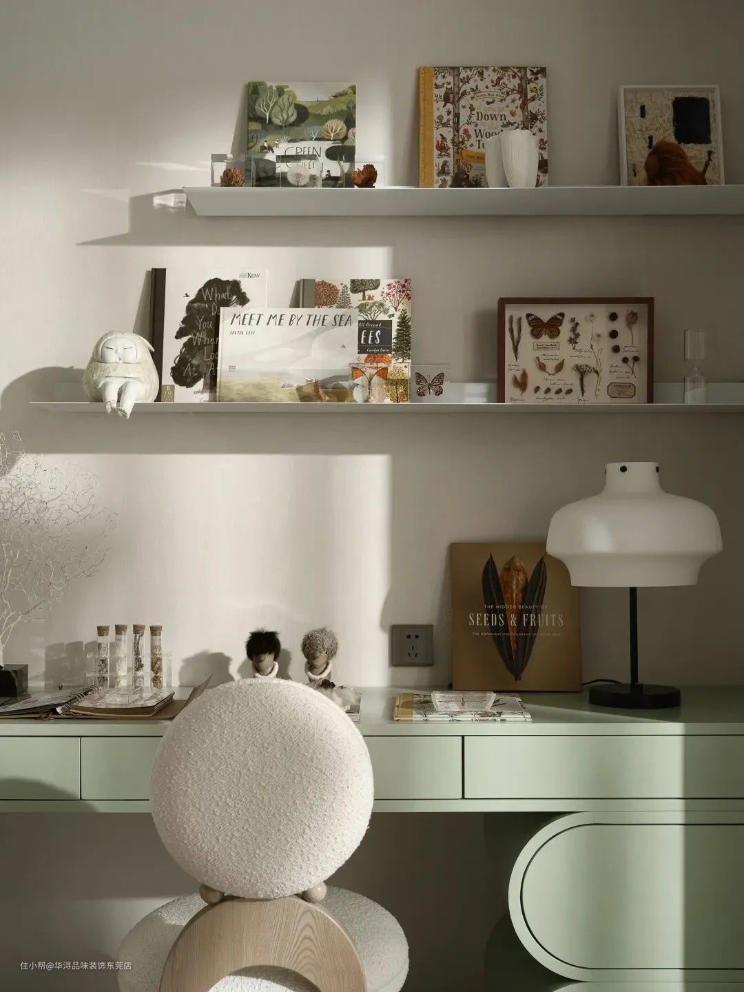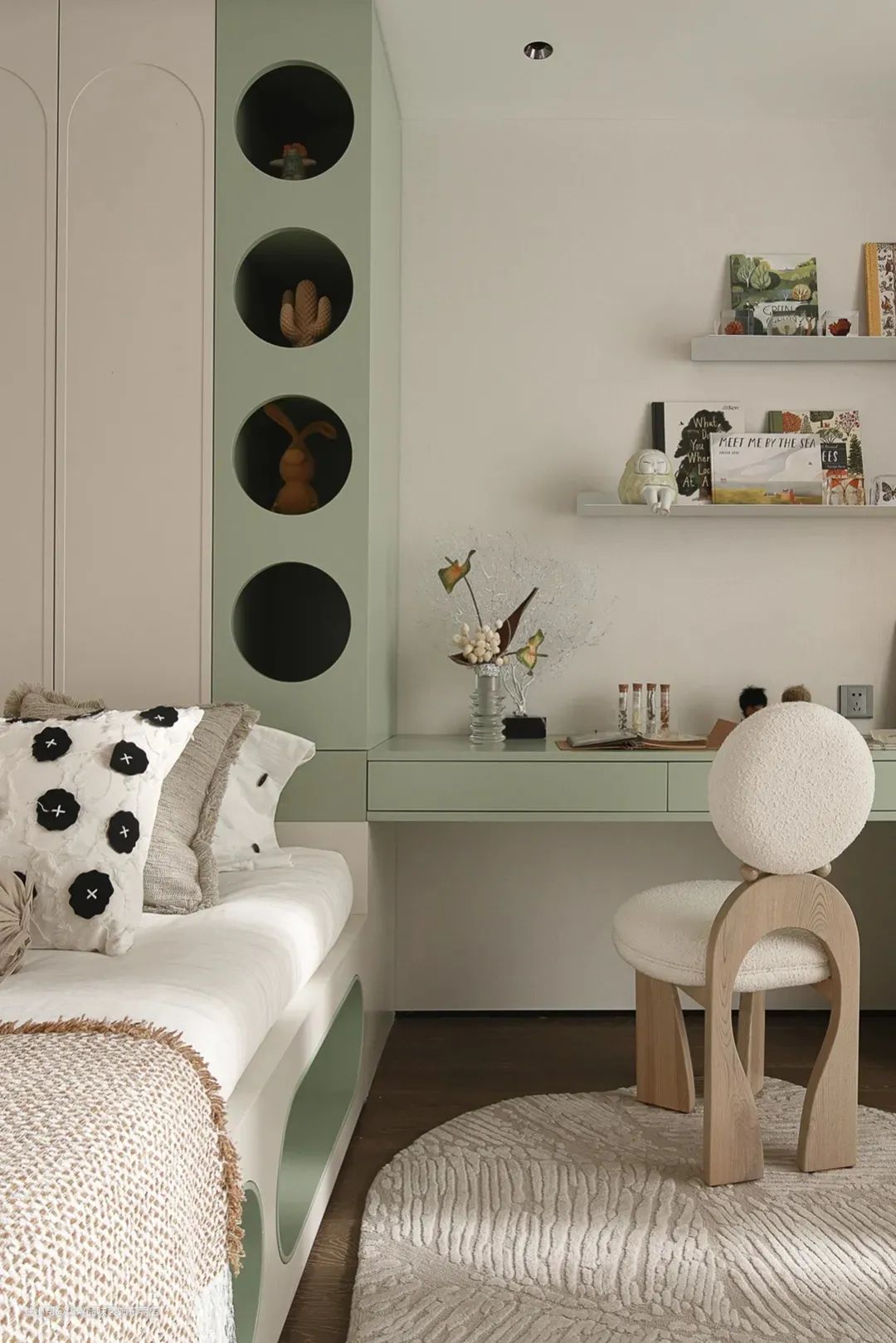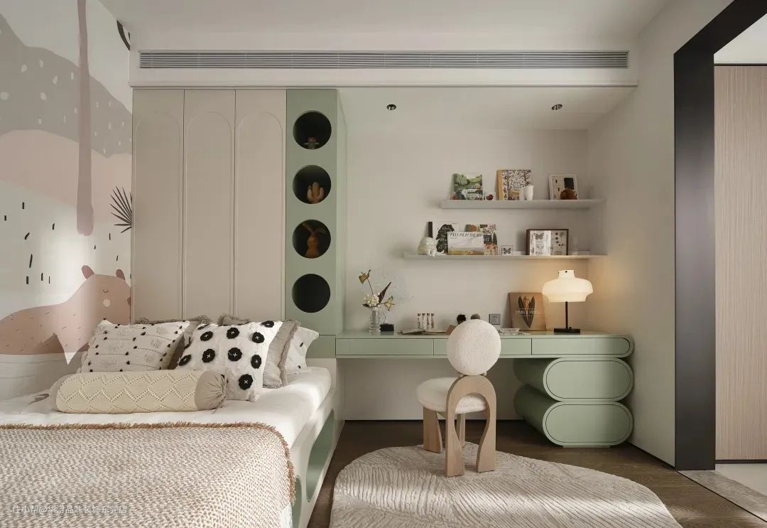儿童房的设计灵感源于对大自然的热爱与向往,整个空间仿佛是一个充满生机的绿色世界,让孩子仿佛置身于郁郁葱葱的大自然之中。 一进入儿童房,映入眼帘的便是满眼的绿色。墙面采用了淡绿色,仿佛是大自然的呼吸,带来清新与宁静。天花板上悬挂着仿真植物吊饰,犹如森林中的藤蔓,增添了空间的立体感和趣味性。