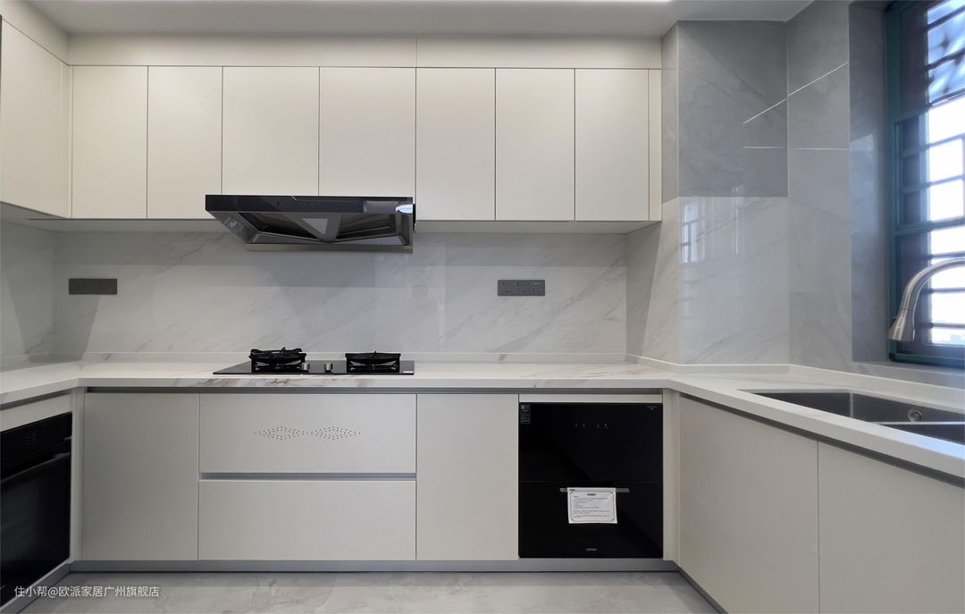 ① 厨房U字型岛台设计,满足洗-切-炒-摆的功能需求,动线十分流程,多人同时操作也不会拥挤 ② 地柜+吊柜的设计满足厨房的收纳需求,根据不同收纳物品调整柜内活动隔板的高度,用起来更加顺手