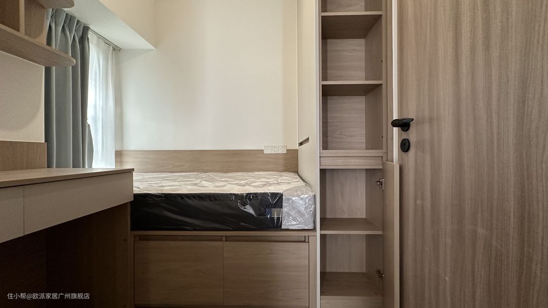 ① 儿童房采用榻榻米衣柜一体化设计,充分利用每1㎡空间,床尾和床下都定制了收纳柜,满足孩子不同年龄段的衣物收纳需求 ② 榻榻米旁定制悬浮台面和书柜,满足孩子的学习需求,也能收纳孩子书籍或摆件,锻炼归类收纳能力 ③ 板材都采用ENF环保等级材料,呵护孩子身心健康
