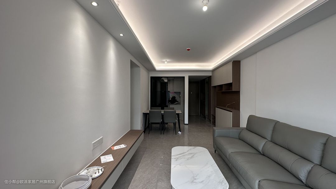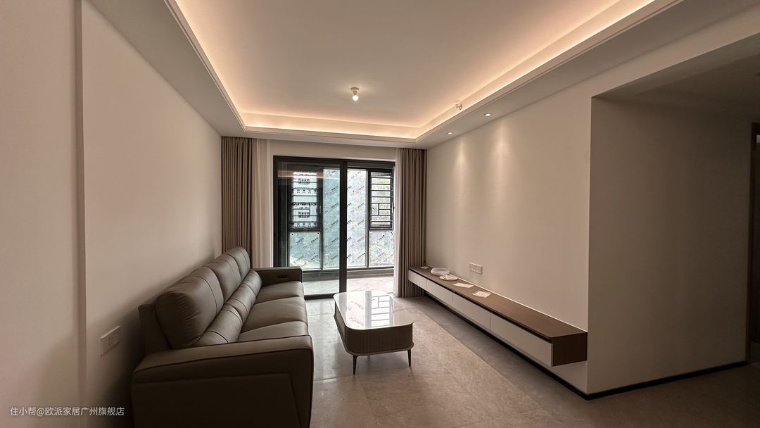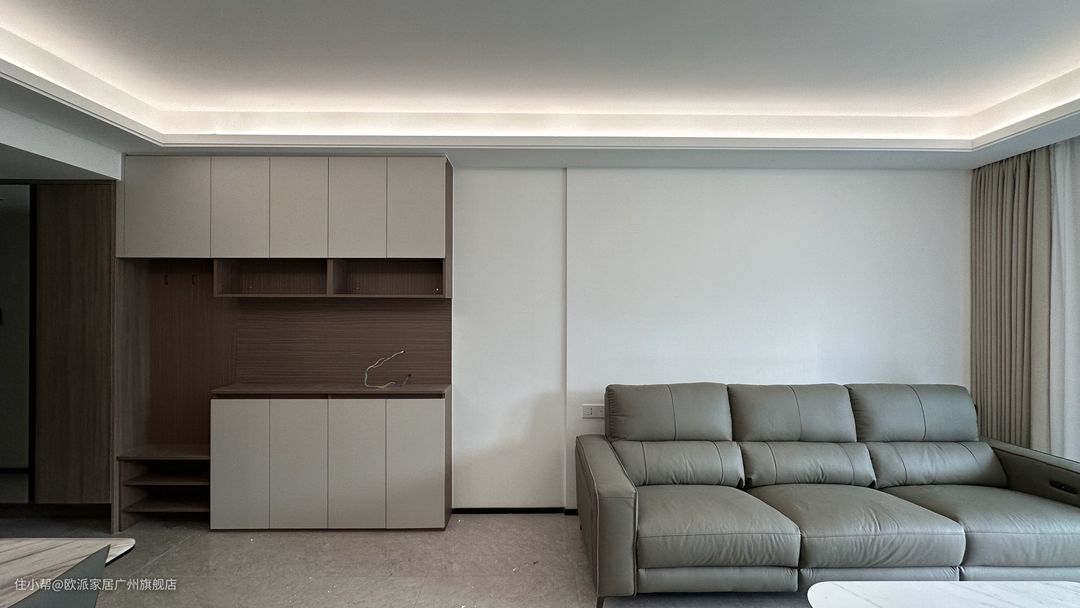 ① 客厅靠墙定制悬浮抽屉电视柜,月牙白柜门与原木色台面搭配,简约但有层次感,满足客厅基本的收纳需求 ② 电视背景墙提前预埋暖射灯,开灯墙上小山丘形状也让空间设计感更加丰富 ③ 沙发选择暖灰色沙发,云端般坐感的回弹海绵,舒适度拉满,中间摆放茶几,5.5mm厚北欧白缎面哑光岩板,搭配两个抽屉,承重性与收纳能力都能满足